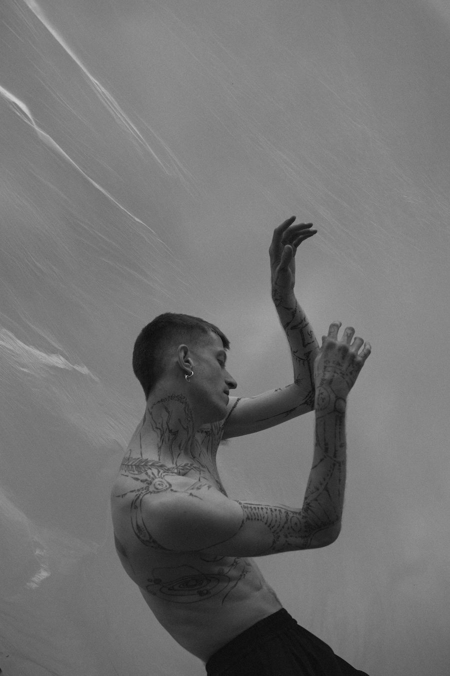 - Act One: Shaked Heller begins his solitary voyage through a transitional netherworld, embodying the struggle for transcendence. With a body marked by tattoos and scars, he represents the weight of experience as he strives to escape his earthly confines.