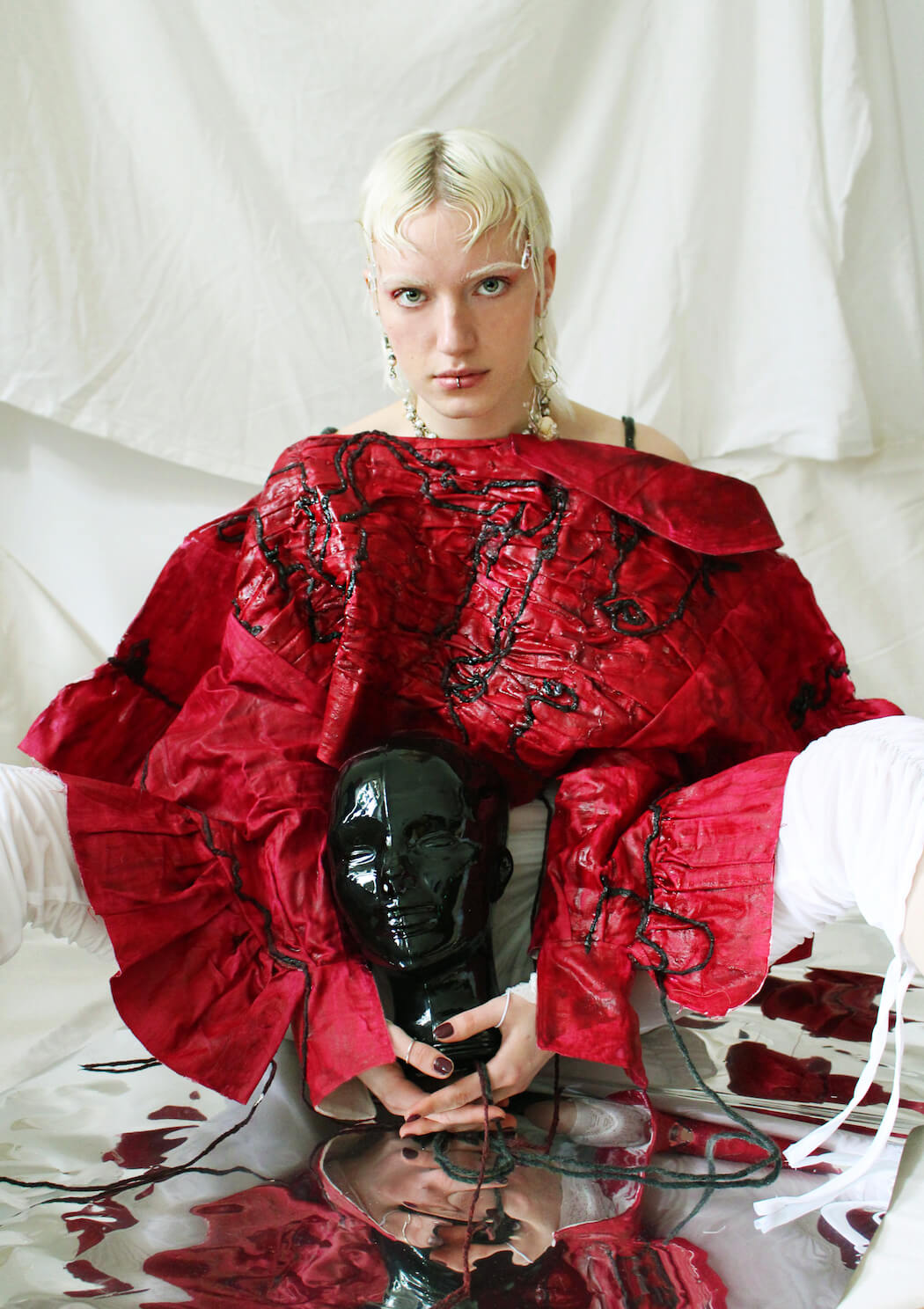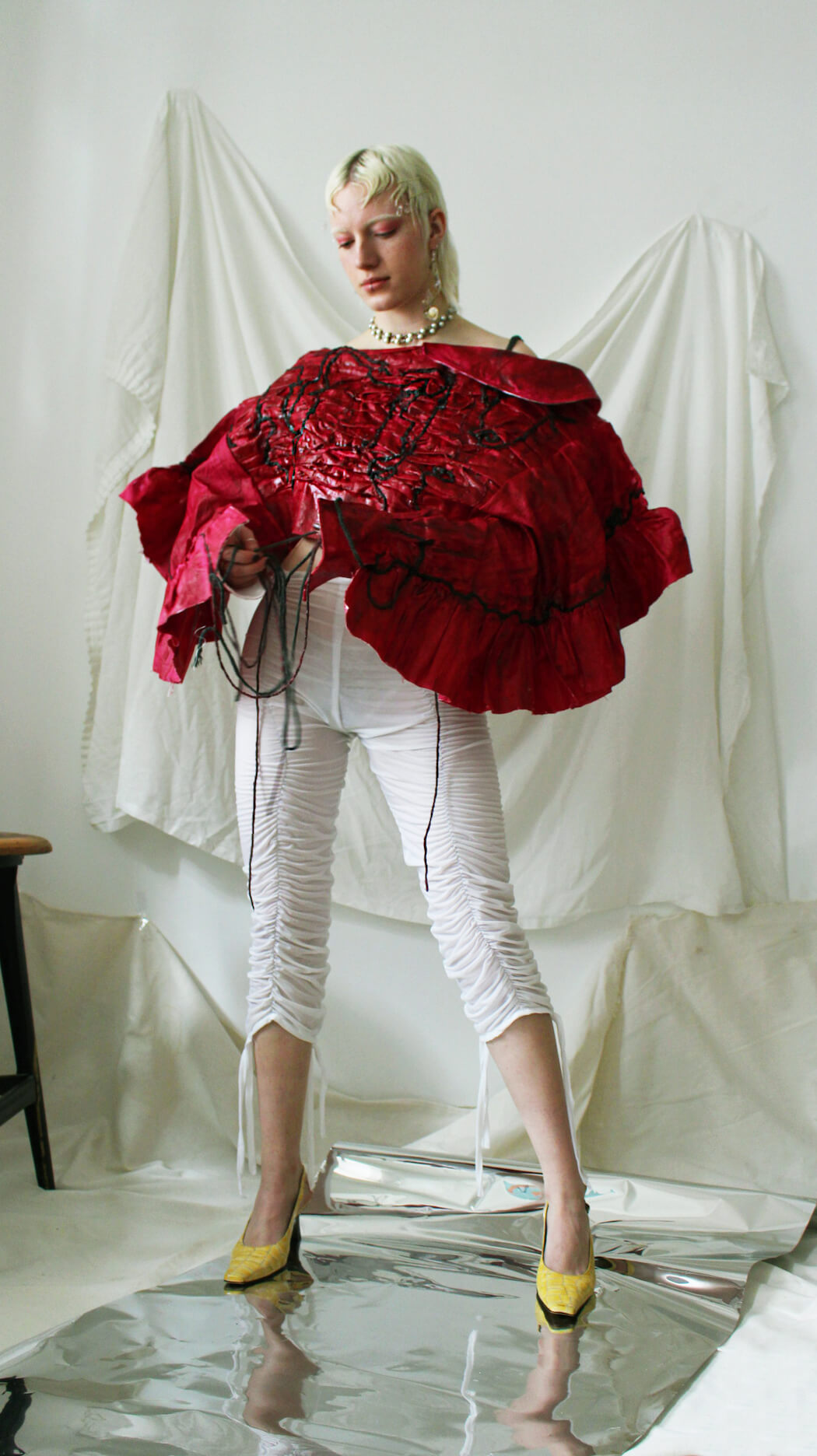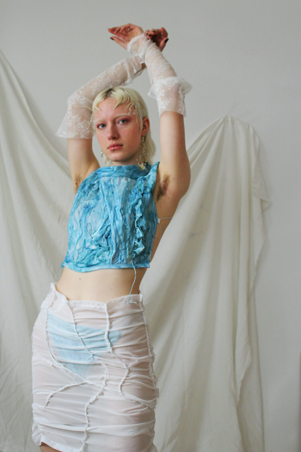 “UNSEEN REALiTiES” and it is inspired by elements of historic underwear of the 18./19. century and a greek mythology of the water nymph arethusa, who tries to escape Alpheus, by transforming into water. I worked with historic ruffling techniques, soaking the fabric in water to see how the ruffles look when wet and experimented with bioplastic, to be able to coat the fabric with a shiny material, that gives a wet look like latex, but biodegradable and sustainable. In addition, I only worked with ethically sourced second hand fabrics.