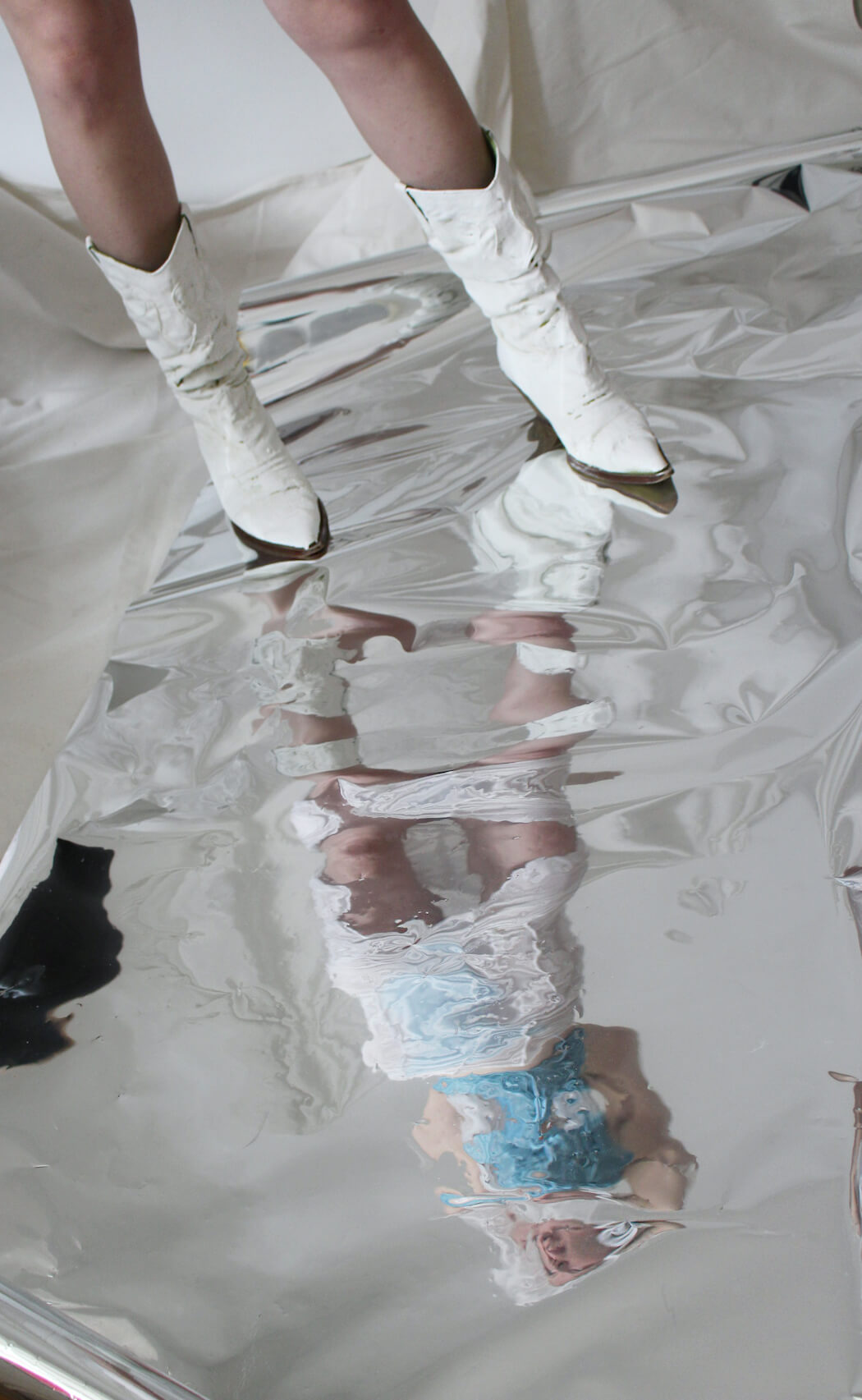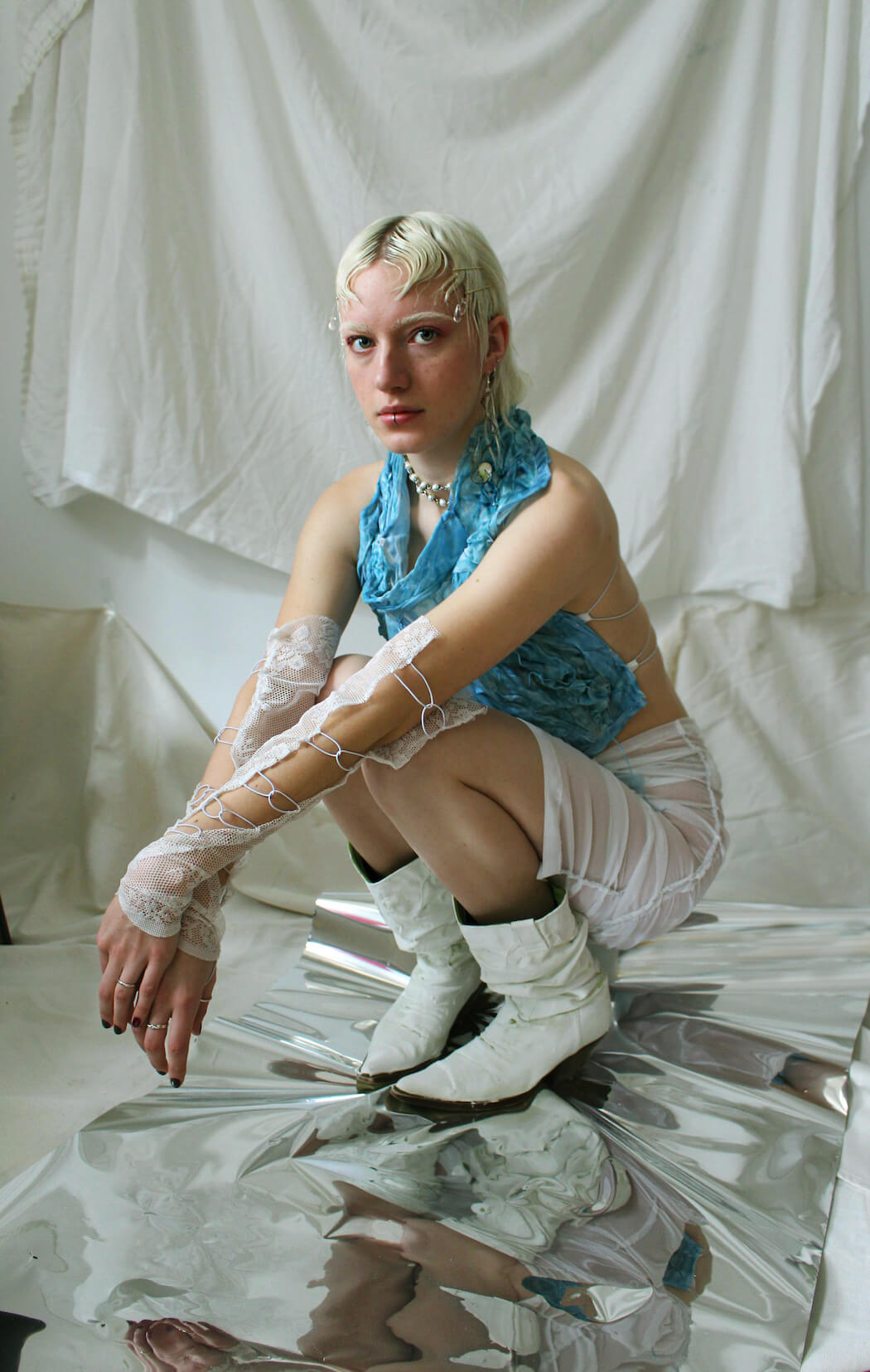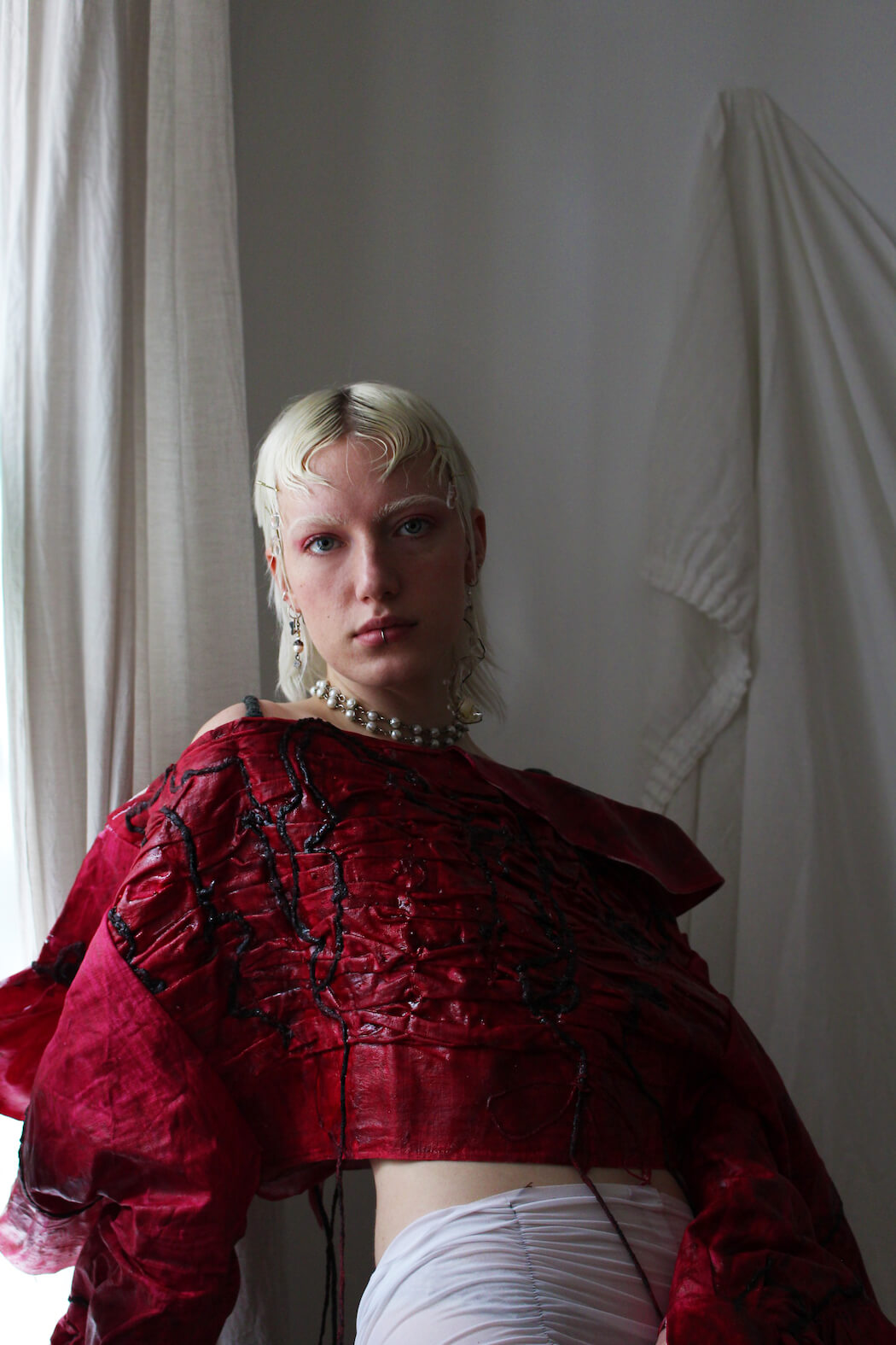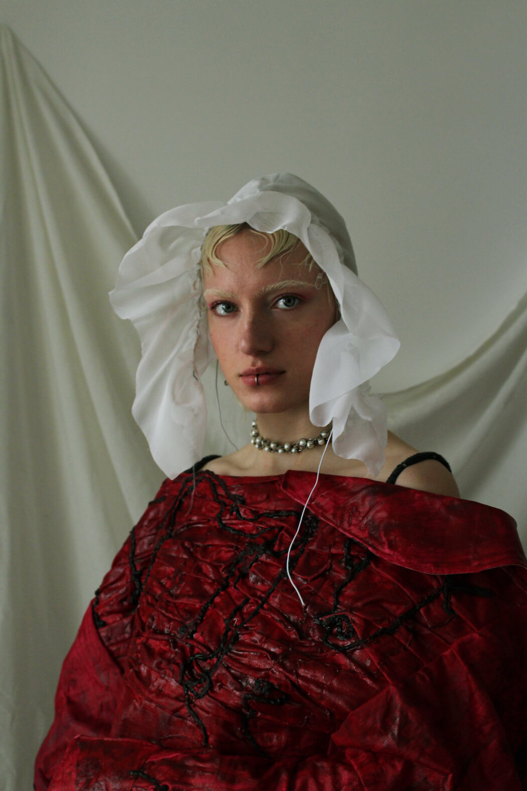 “UNSEEN REALiTiES” and it is inspired by elements of historic underwear of the 18./19. century and a greek mythology of the water nymph arethusa, who tries to escape Alpheus, by transforming into water. I worked with historic ruffling techniques, soaking the fabric in water to see how the ruffles look when wet and experimented with bioplastic, to be able to coat the fabric with a shiny material, that gives a wet look like latex, but biodegradable and sustainable. In addition, I only worked with ethically sourced second hand fabrics.