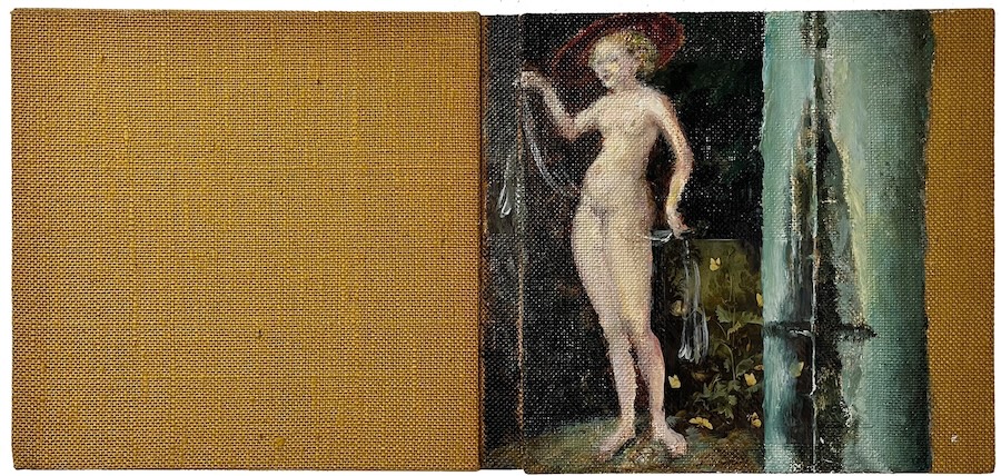 A standout piece, “Bücher,” features books painted onto books, highlighting the idea of narratives sidelined and objects that were once full of life now felt as relics of a bygone era. Xia’s fascination lies not in the stories within the books but in the narratives they embody as physical objects, bridging a connection through presence where absence lingers.