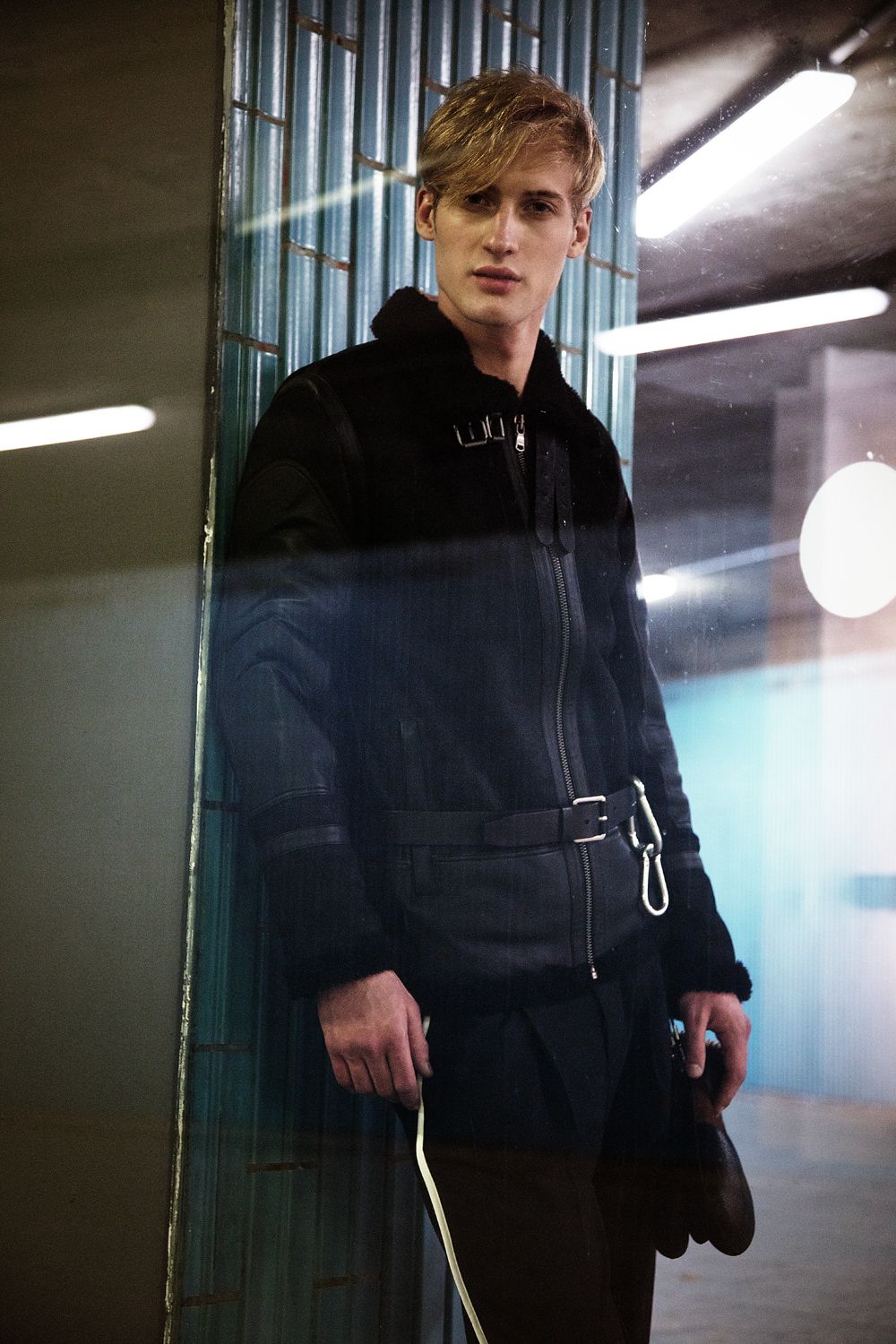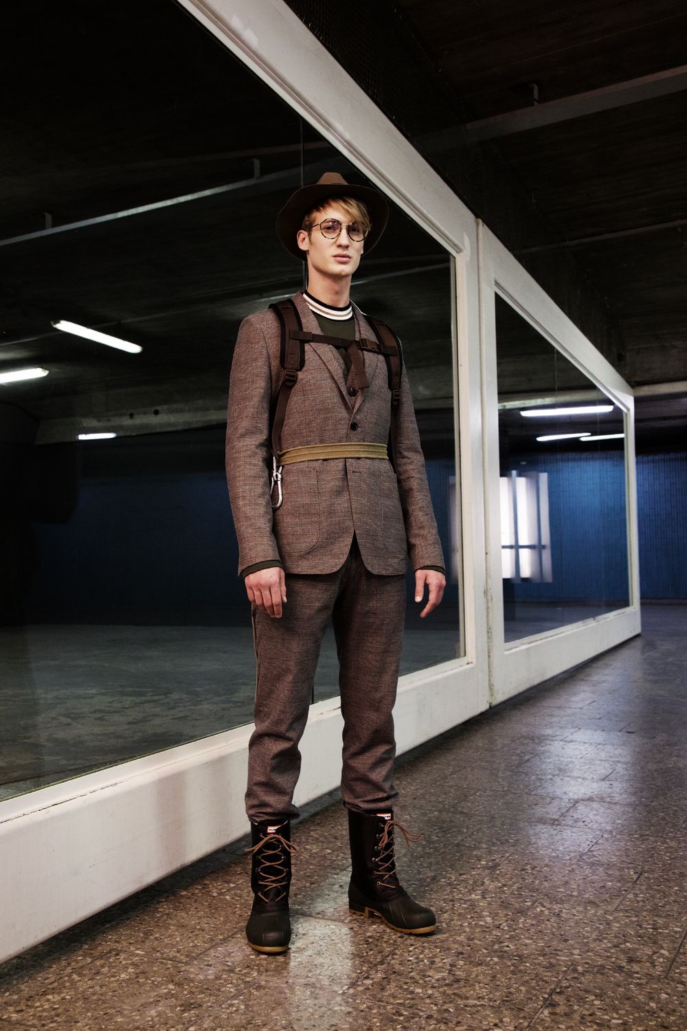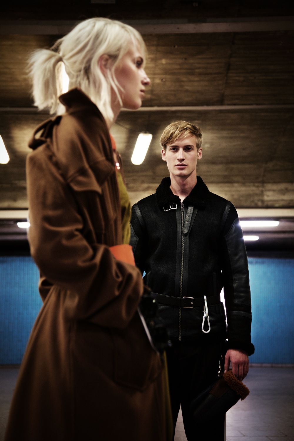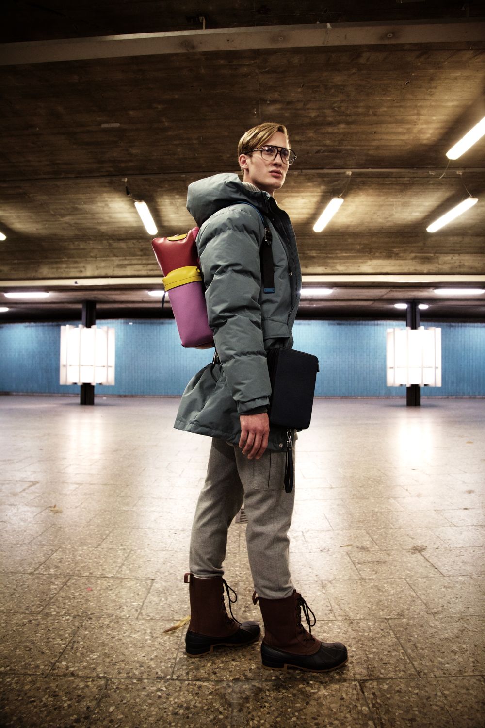 A KALTBLUT exclusive editorial. Photography by Luise Reichert. Model is Raddek Kubik from TUNE Models. Hair and Makeup: Renata Traupe using Hypoallergenic Cosmetics. Styling by Marcello Bona. Production by Winteler Production. This editorial combines classic and urban fashion with outdoor elements and accessories. It reflects the life of city dwellers: a hectic everyday life, always perfectly dressed, they flee into nature as often as possible to recover from it. The break in style is reflected not only in the styling, but in the entire setting: an urban underground illuminated by neon lights, escalators and tiled walls. Plants that grow out of the middle of the escalators and break through the facade. The male model is a modern, less classically type, but instead unadapted and corresponds neither to one nor the other stereotype.