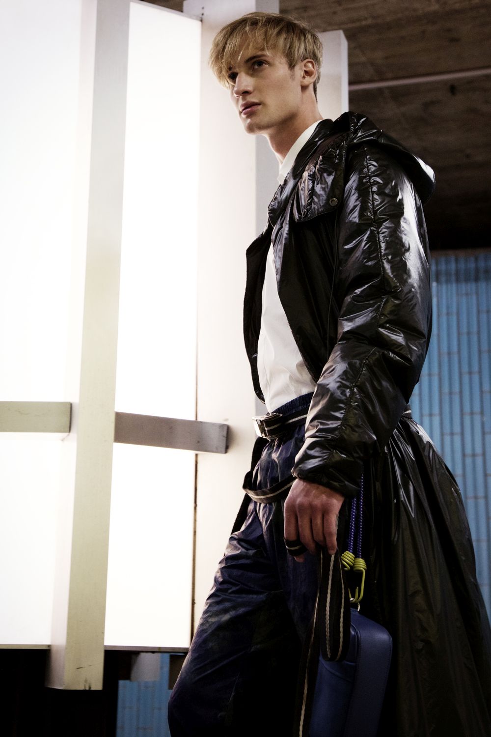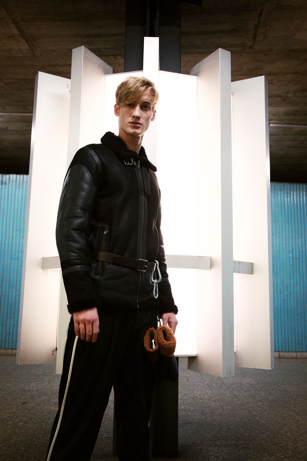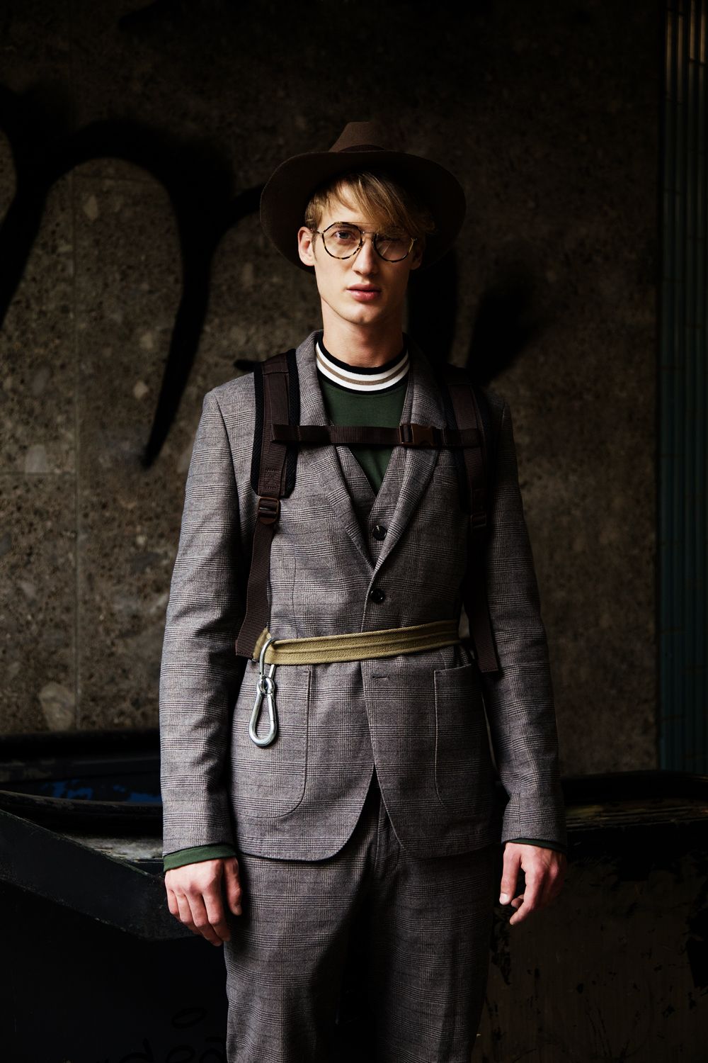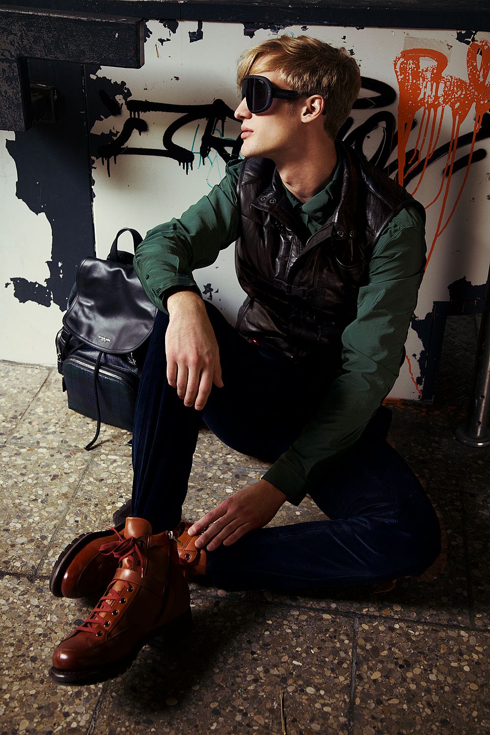 A KALTBLUT exclusive editorial. Photography by Luise Reichert. Model is Raddek Kubik from TUNE Models. Hair and Makeup: Renata Traupe using Hypoallergenic Cosmetics. Styling by Marcello Bona. Production by Winteler Production. This editorial combines classic and urban fashion with outdoor elements and accessories. It reflects the life of city dwellers: a hectic everyday life, always perfectly dressed, they flee into nature as often as possible to recover from it. The break in style is reflected not only in the styling, but in the entire setting: an urban underground illuminated by neon lights, escalators and tiled walls. Plants that grow out of the middle of the escalators and break through the facade. The male model is a modern, less classically type, but instead unadapted and corresponds neither to one nor the other stereotype.