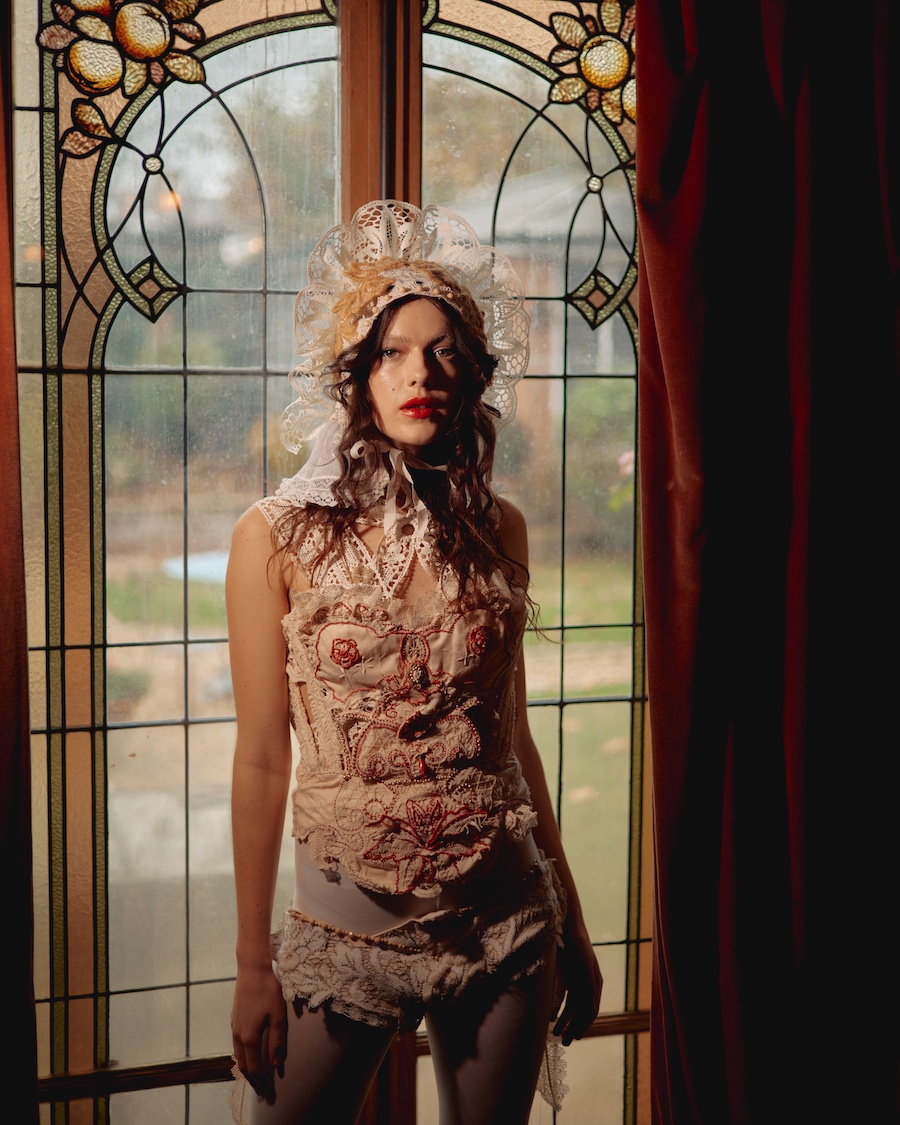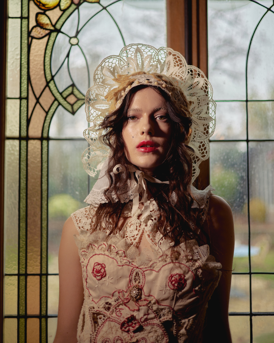Peg-puff collection is surrealist couture, inspired by Victorian silhouettes and profuse attention to detail. The designs were constructed using quality antique and vintage fabrics and trimmings, including a few table cloths and even Christmas decorations. All materials were meticulously sourced at antique and vintage fairs, charity shops and even online. The main focus was to create garments that are exquisite, unique and timeless, garments that appear to have genuine age but made with a contemporary appearance. All pieces were lovingly handmade, including the delicate embroidery.”