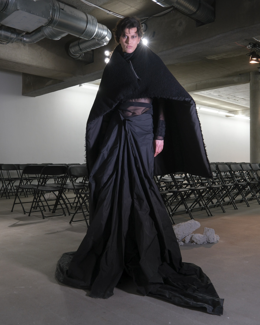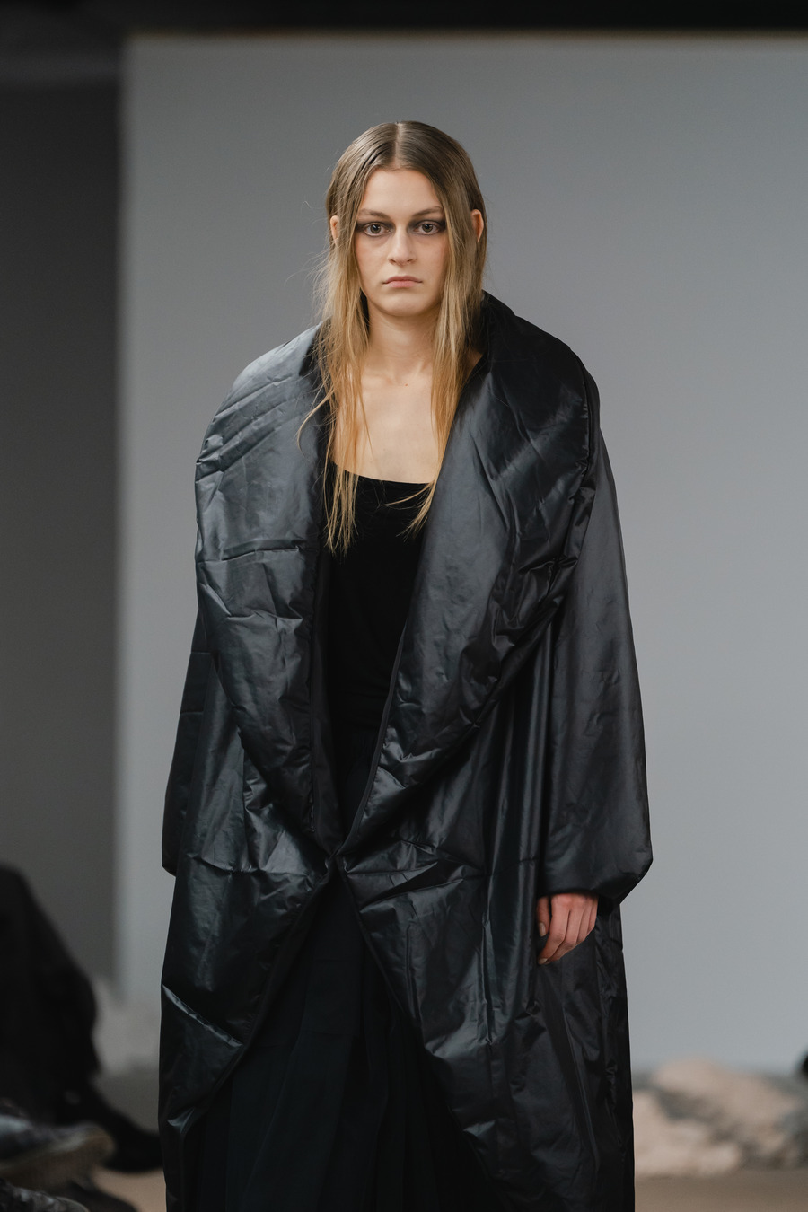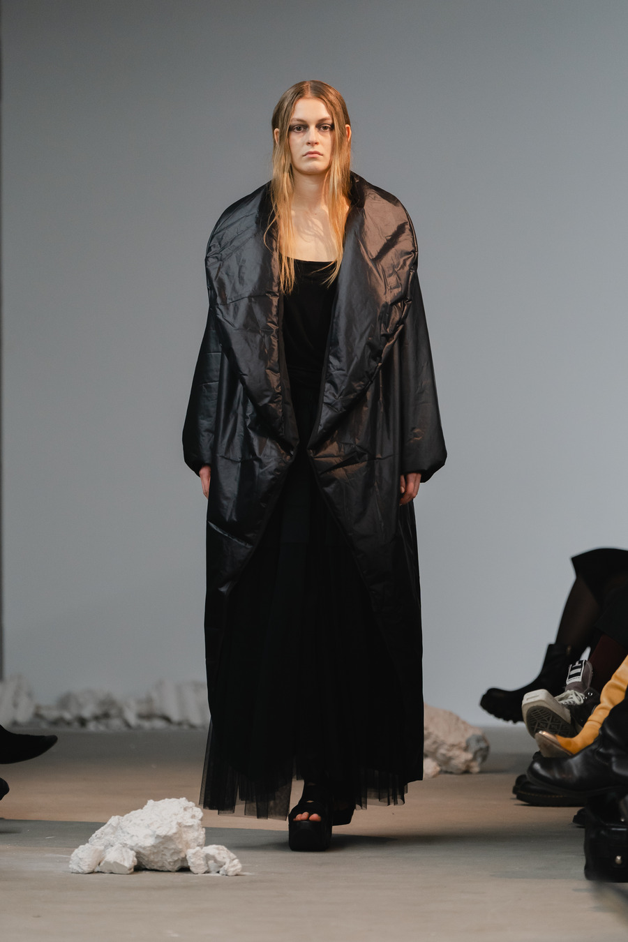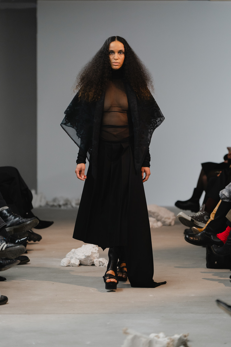 ‘REBUILT’ centres around the exploration of layering, a defining element of Baernthol’s identity. The runway presented a gradual evolution of looks, beginning with minimal, semi-transparent base layers and culminating in complex, voluminous silhouettes. The collection encapsulates a dynamic aesthetic, where layering plays a key role in adding depth and texture to each ensemble.