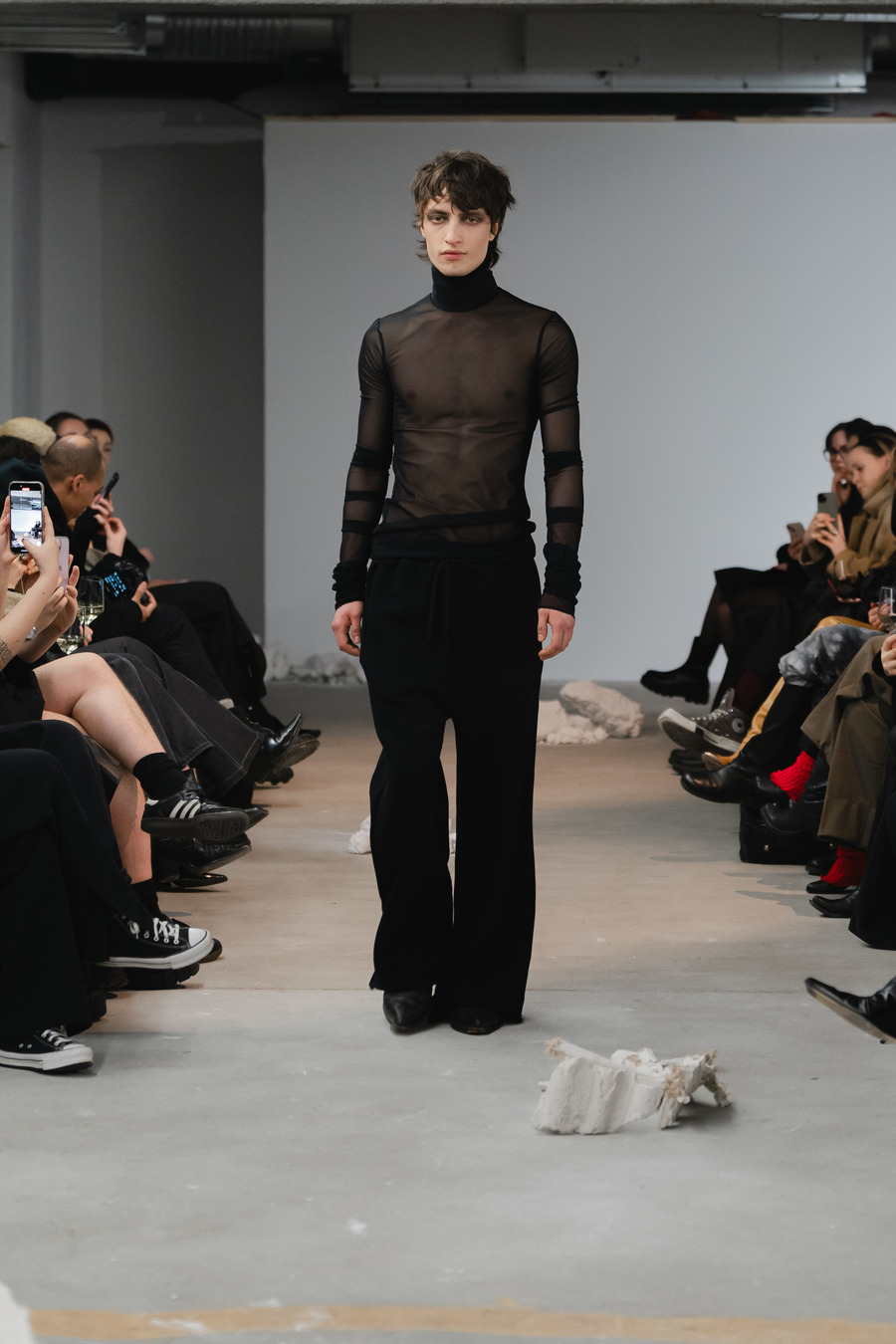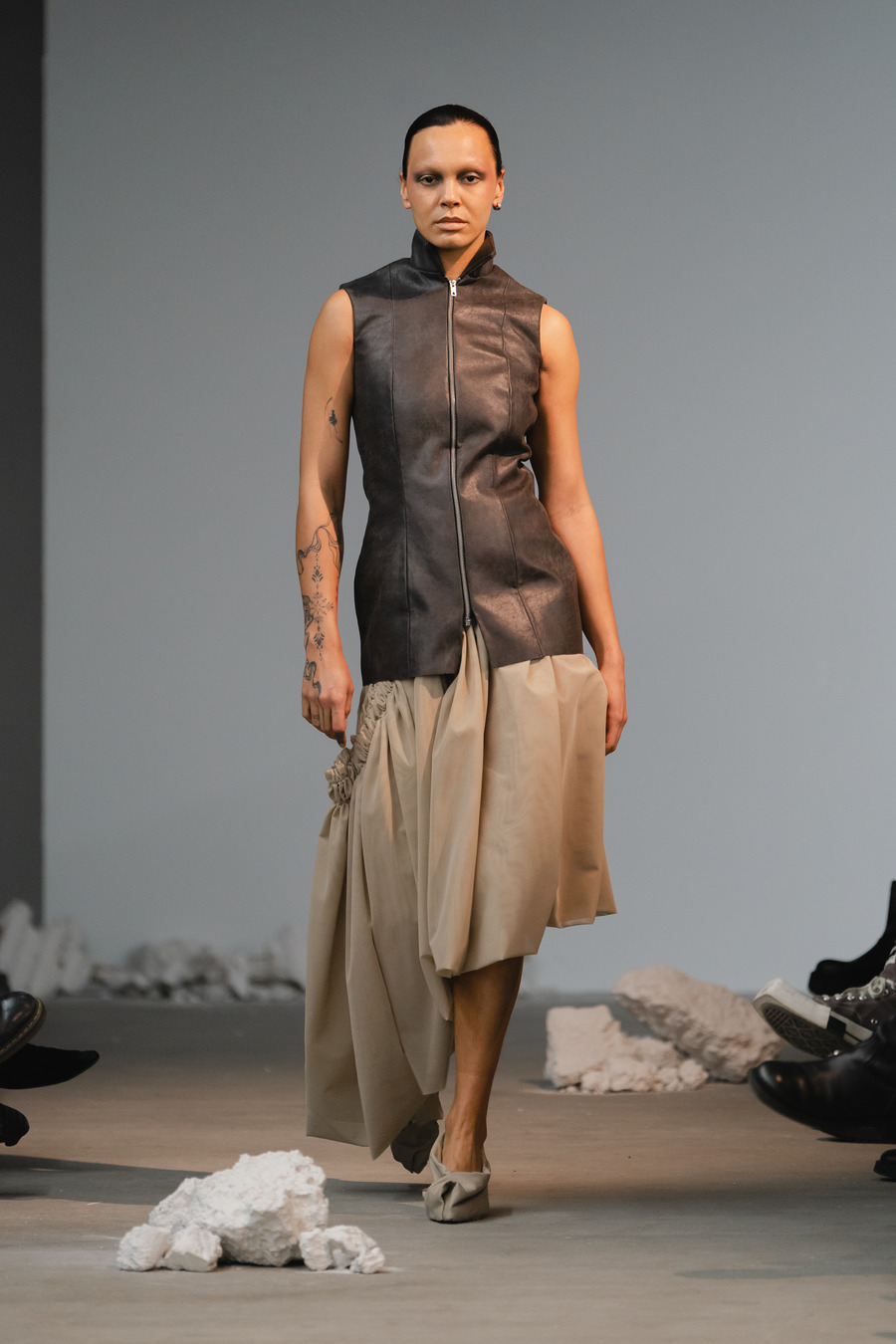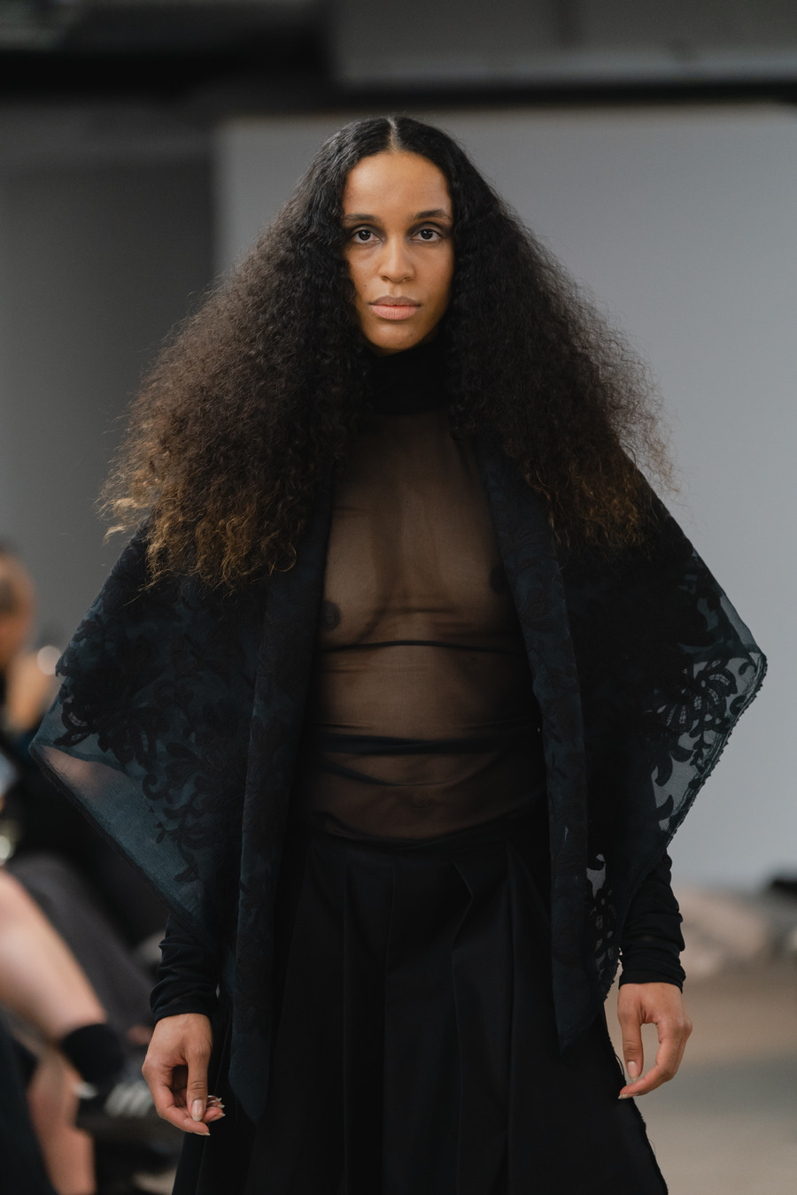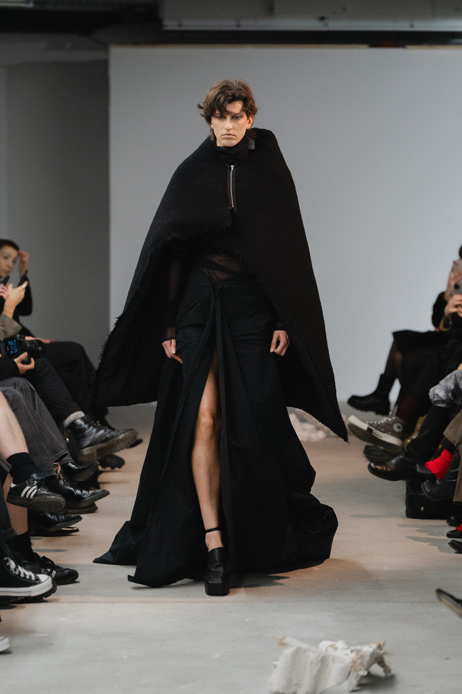 ‘REBUILT’ centres around the exploration of layering, a defining element of Baernthol’s identity. The runway presented a gradual evolution of looks, beginning with minimal, semi-transparent base layers and culminating in complex, voluminous silhouettes. The collection encapsulates a dynamic aesthetic, where layering plays a key role in adding depth and texture to each ensemble.