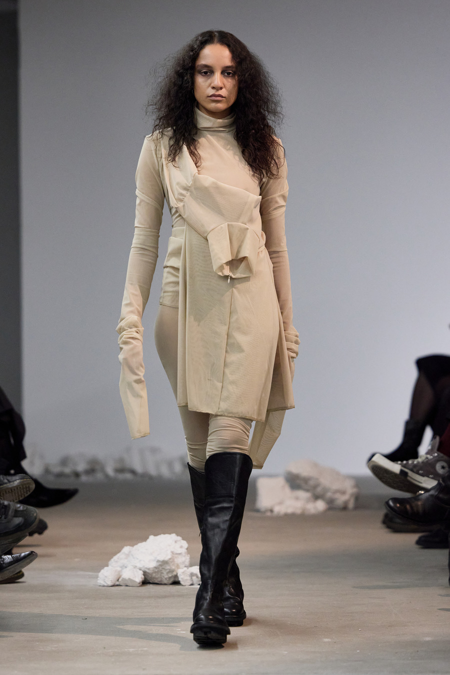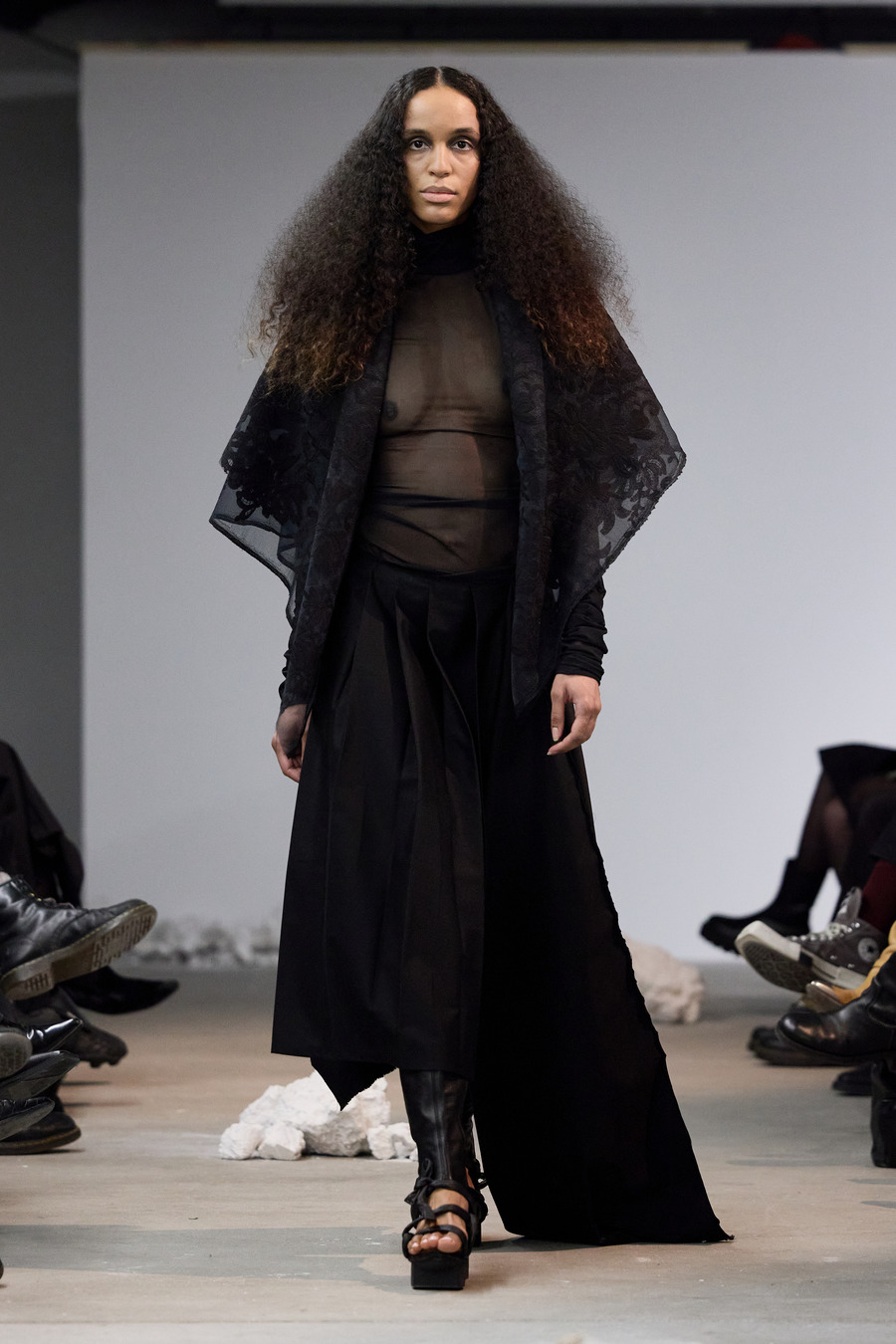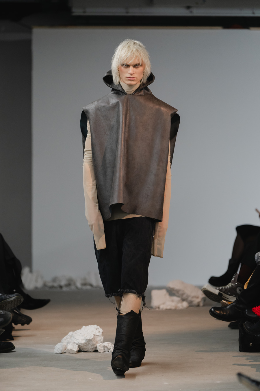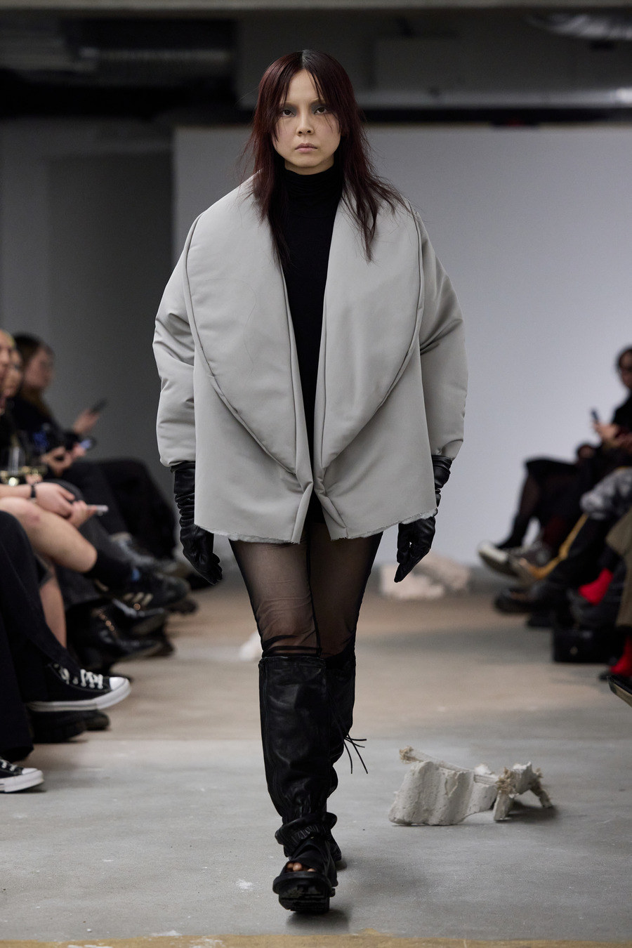 ‘REBUILT’ centres around the exploration of layering, a defining element of Baernthol’s identity. The runway presented a gradual evolution of looks, beginning with minimal, semi-transparent base layers and culminating in complex, voluminous silhouettes. The collection encapsulates a dynamic aesthetic, where layering plays a key role in adding depth and texture to each ensemble.