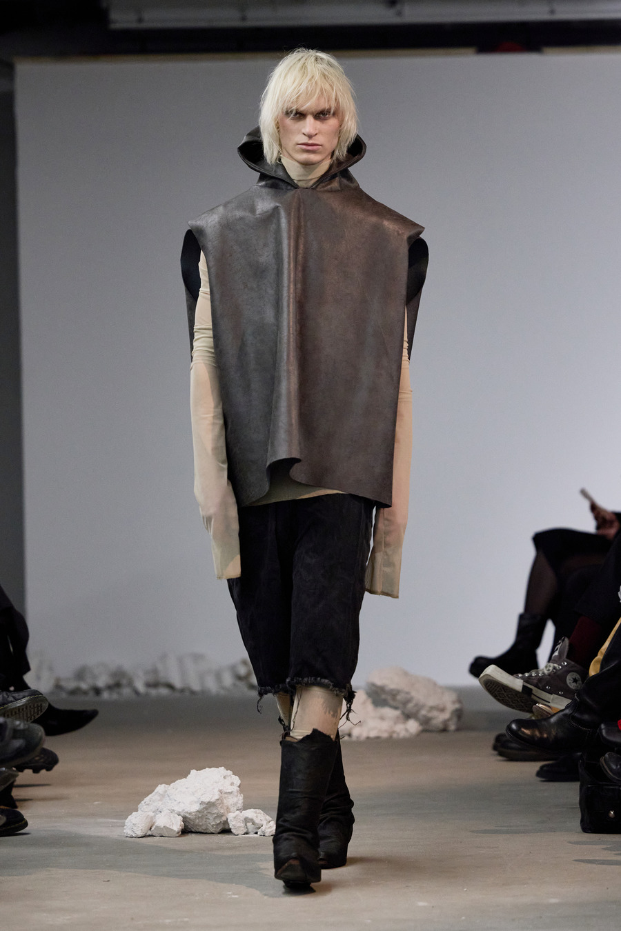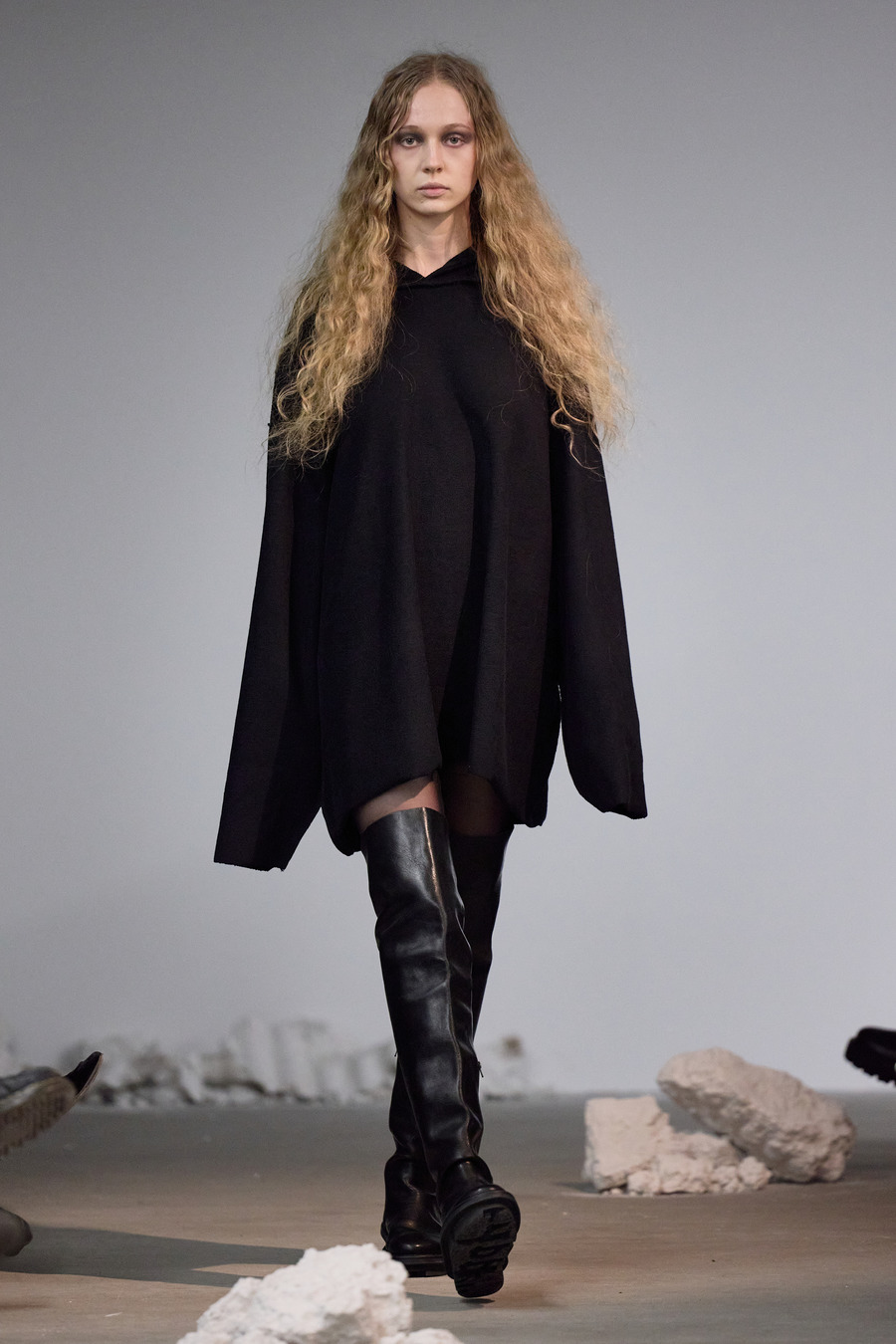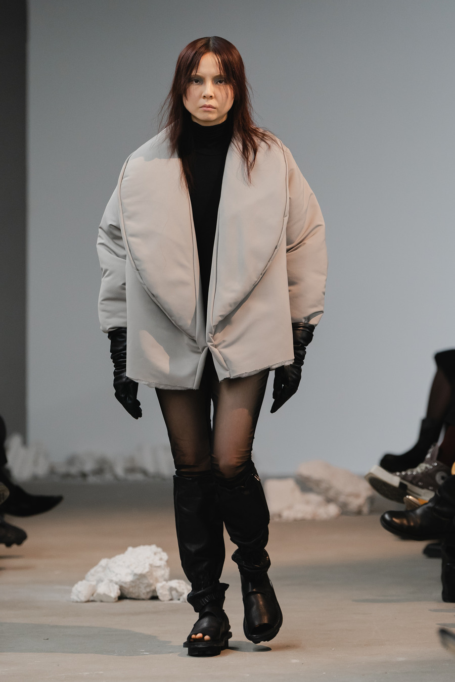 The ‘REBUILT’ collection conveys a visual transformation narrative, employing layering as an evolving dialogue between delicate base structures and architectural outerwear. The transition from I- and Y- to X-silhouettes also enriches the collection’s narrative. A palette dominated by dark black tones, monochromatic greys, ashy earth tones, and light sands was utilized throughout.