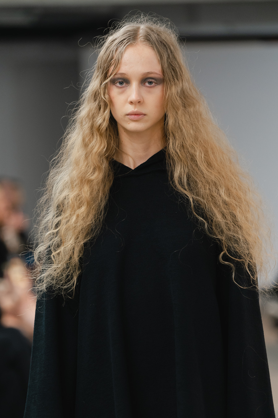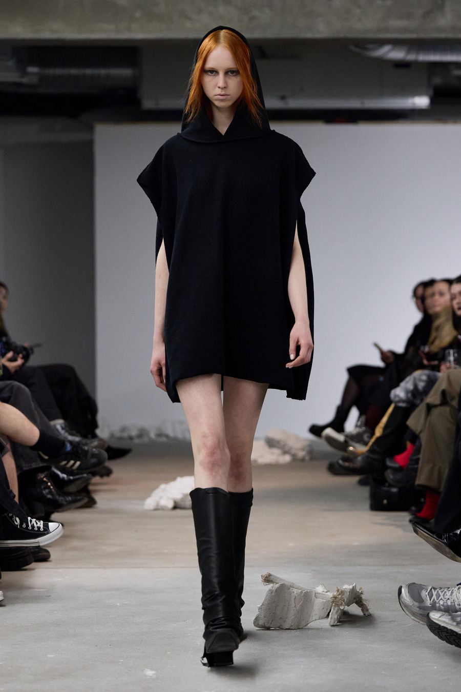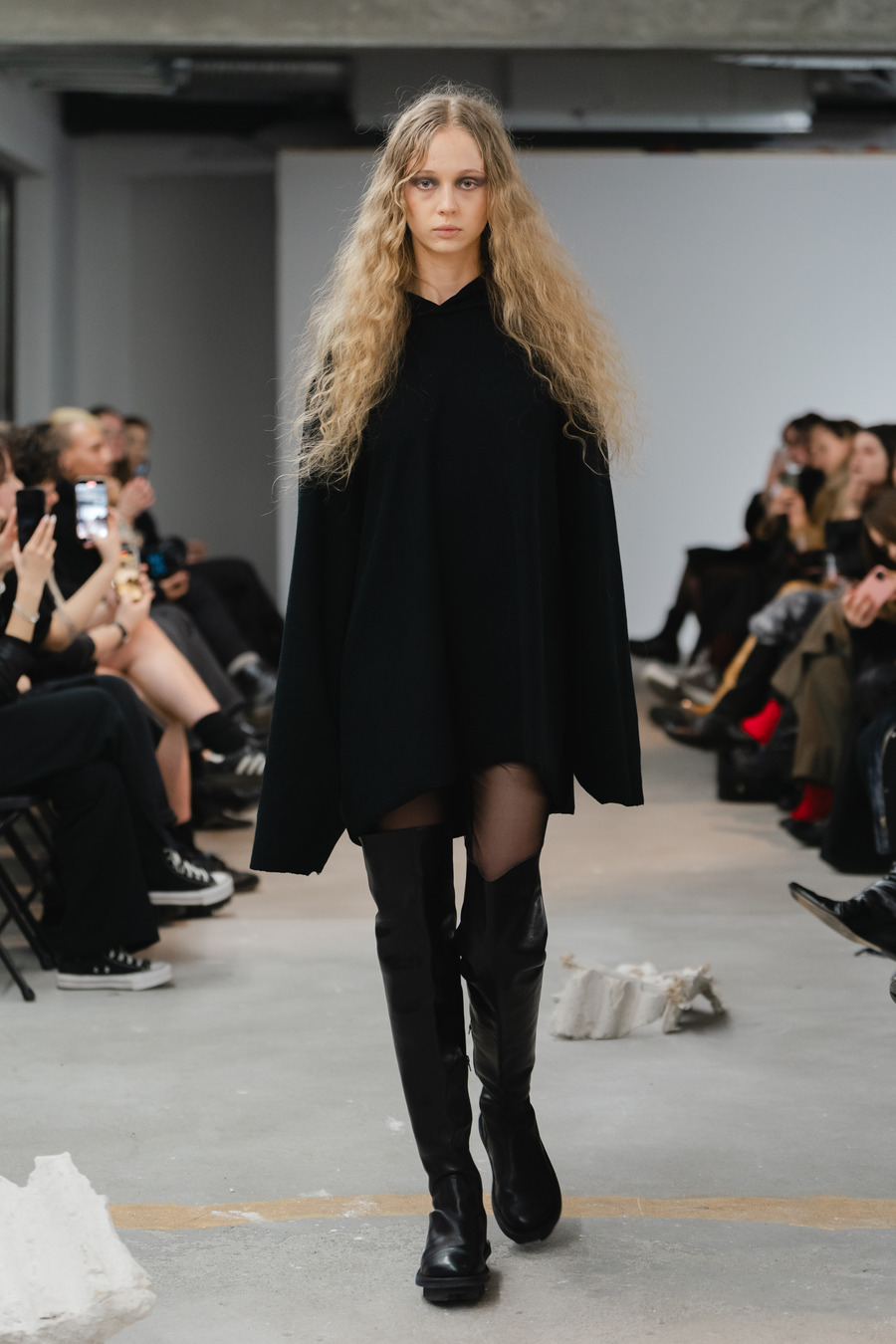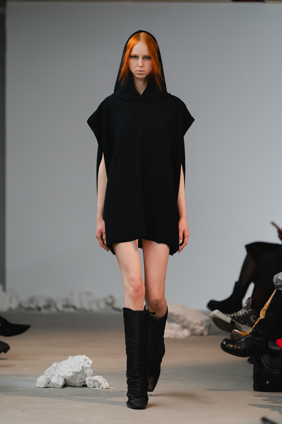 The ‘REBUILT’ collection conveys a visual transformation narrative, employing layering as an evolving dialogue between delicate base structures and architectural outerwear. The transition from I- and Y- to X-silhouettes also enriches the collection’s narrative. A palette dominated by dark black tones, monochromatic greys, ashy earth tones, and light sands was utilized throughout.