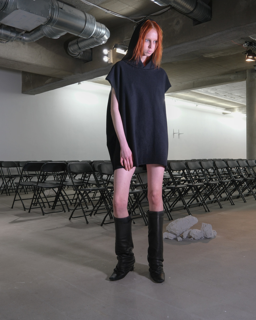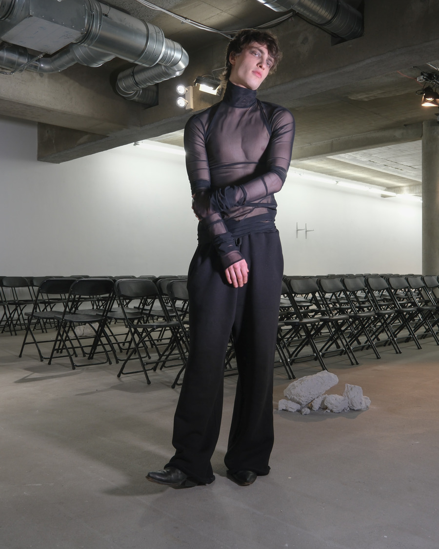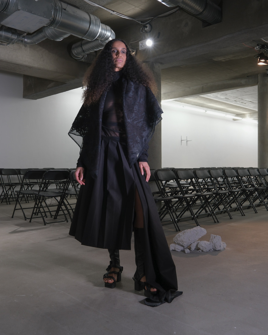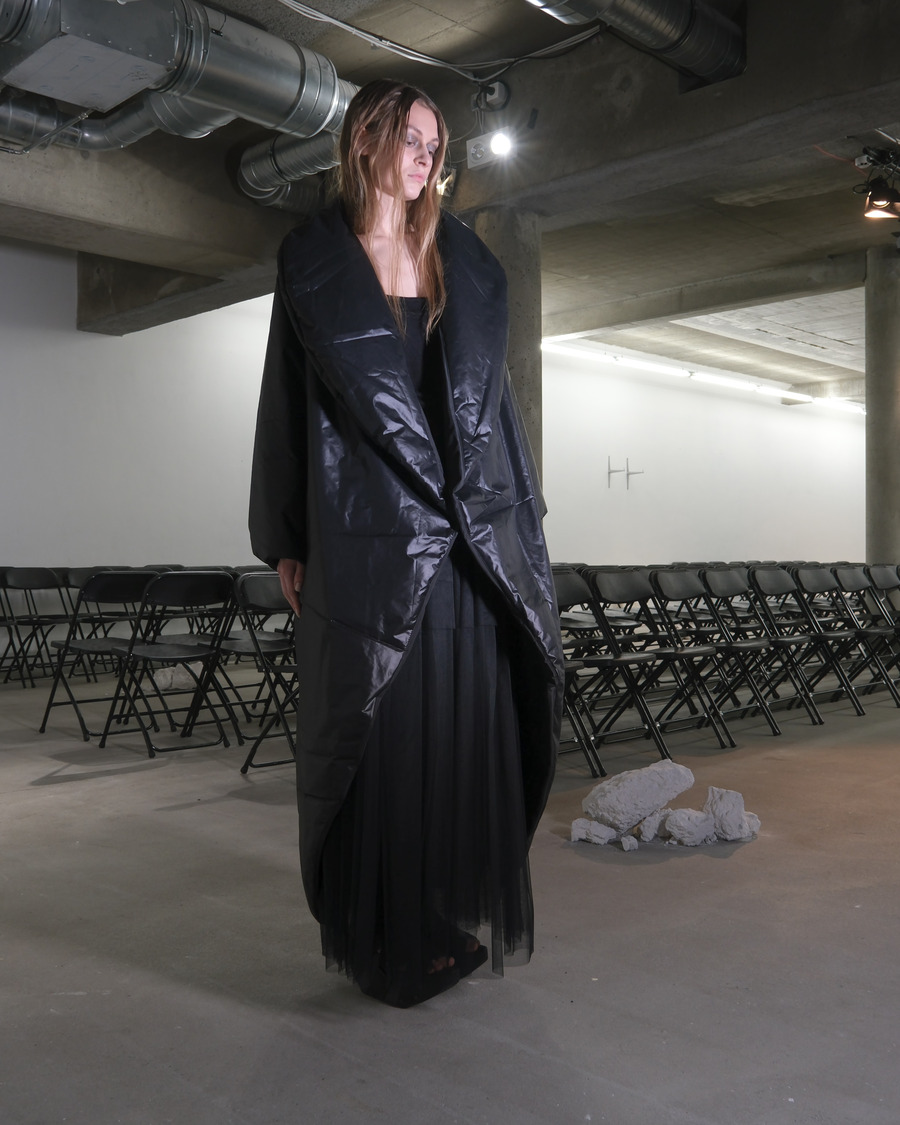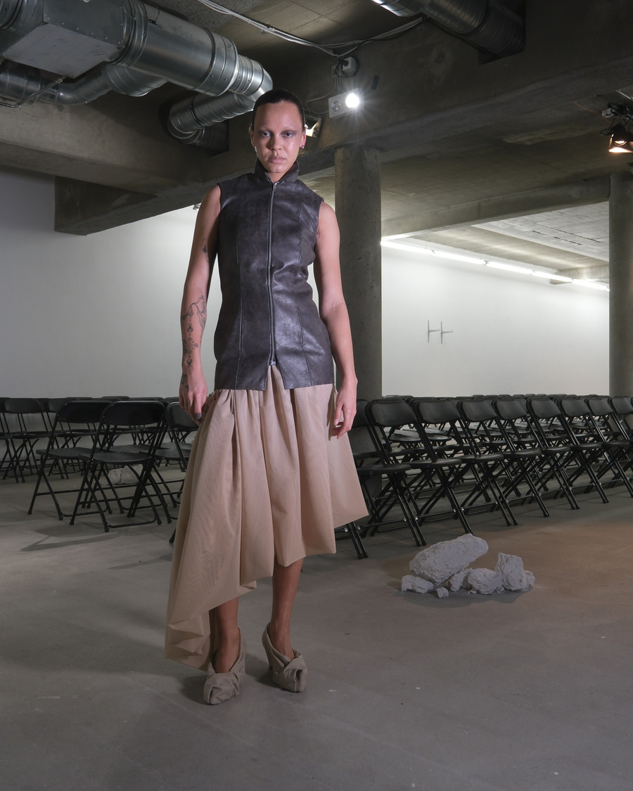 In Baernthol’s own words, “Rebuilt—I wanted to create something that isn’t just a fleeting statement but an integral part of a wardrobe—pieces that can be reinterpreted over and over again. This collection responds to our fast-paced, throwaway culture, embracing versatility and longevity while finding new value in what already exists. We aim to minimize the environmental impact of a fashion show lasting only 20–30 minutes, focusing on natural resources and repurposing unwanted materials.”
