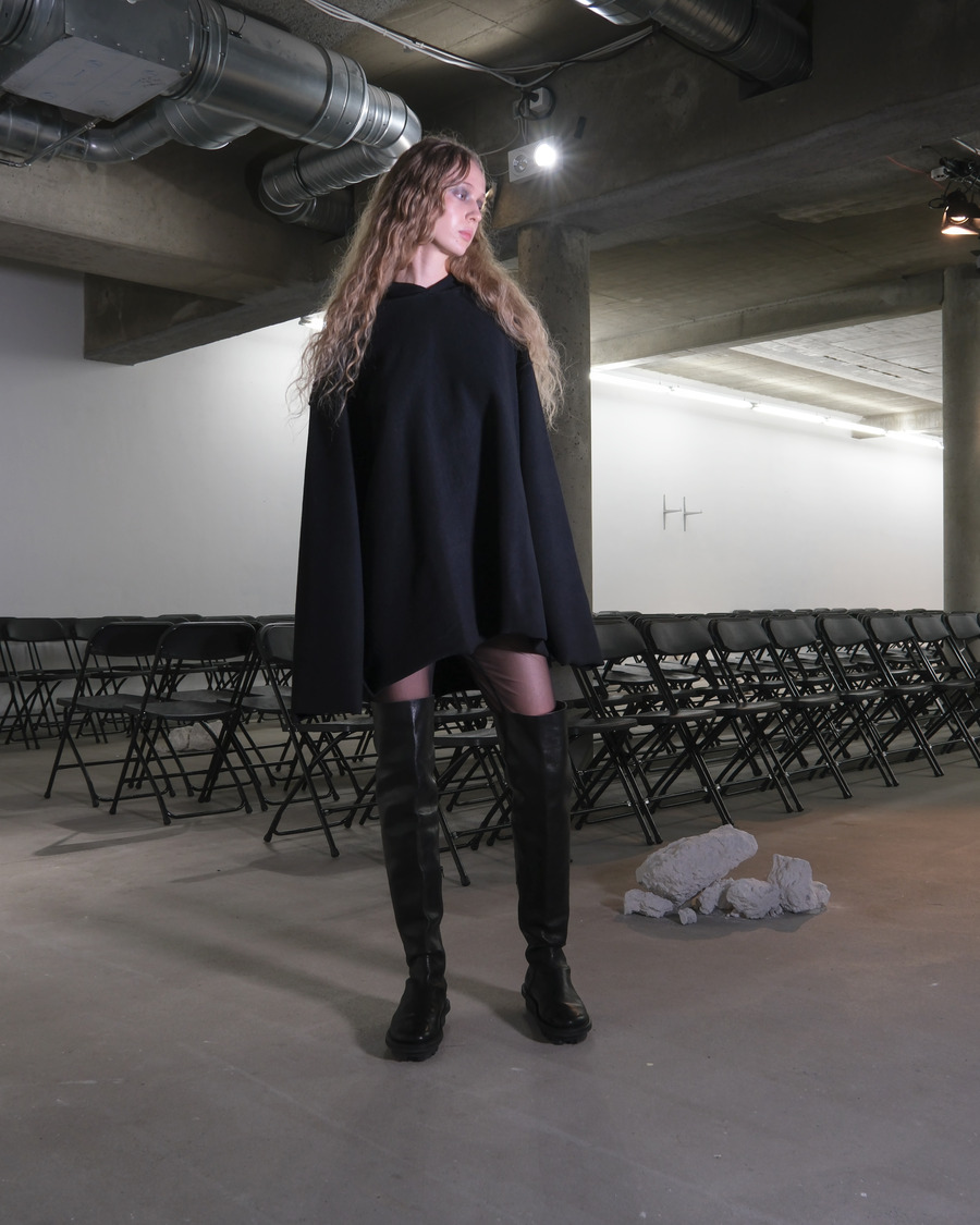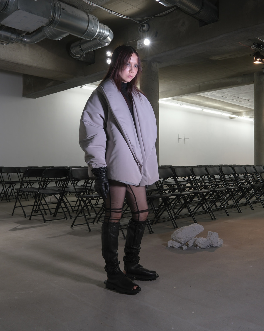 Moreover, the set design utilized discarded plaster chunks from Skulpturengießerei Knaak—negative moulds that are typically cast aside but were repurposed as integral visual elements of the show. The architectural runway setting, characterized by open concrete floors and structural columns, echoed the reconstructed essence of the collection. Rental-based components, including venue chairs, further emphasized the brand’s commitment to a circular approach to production and consumption.