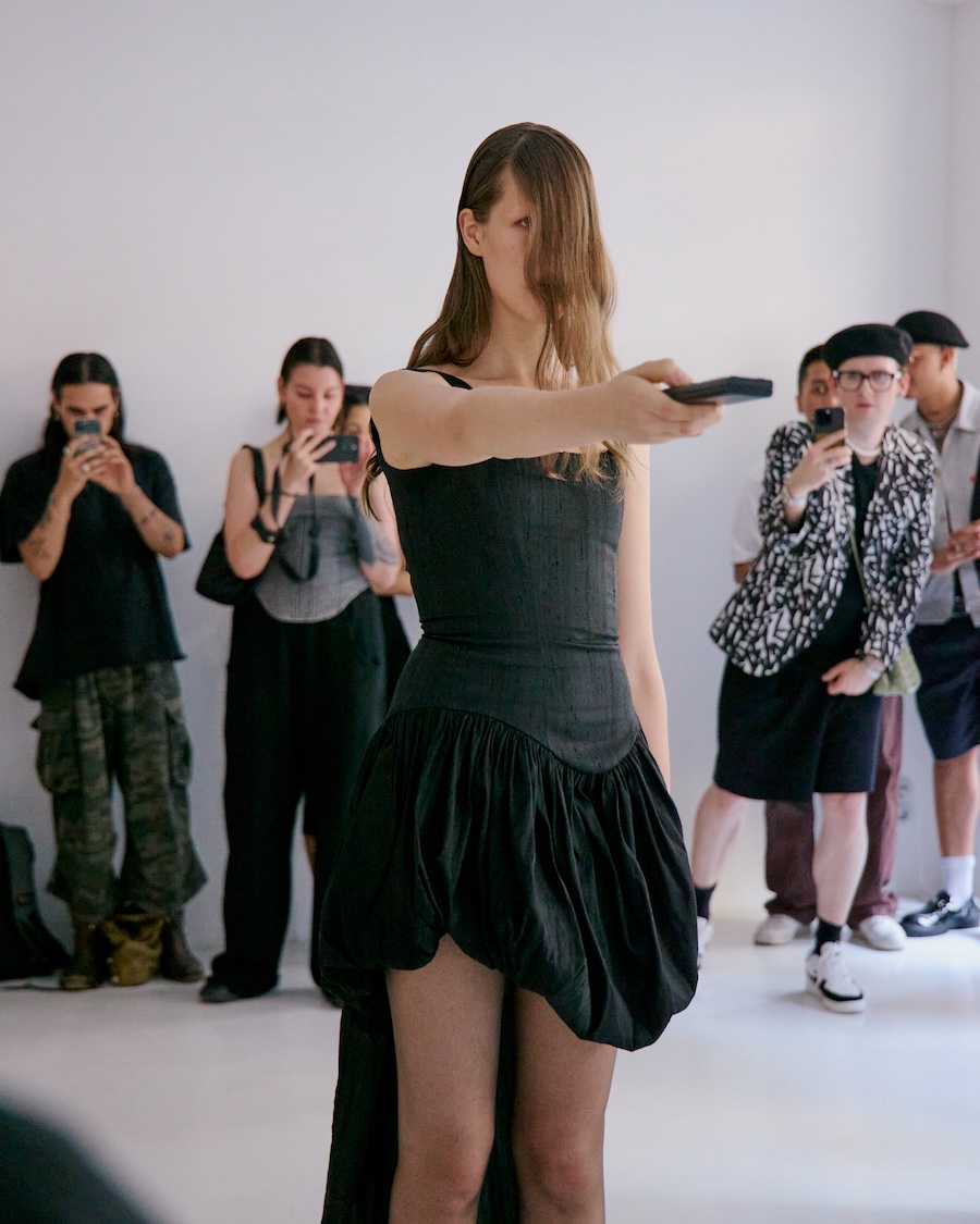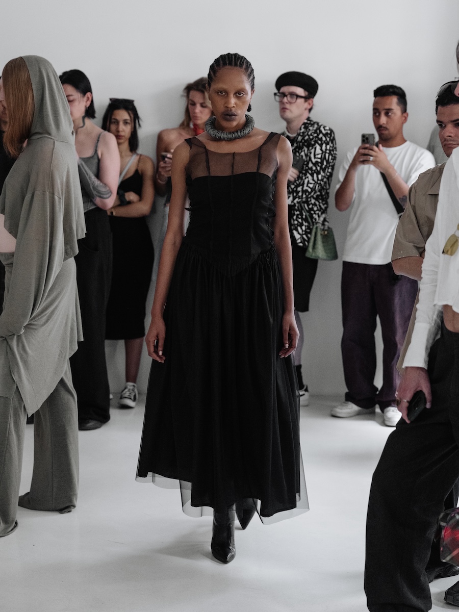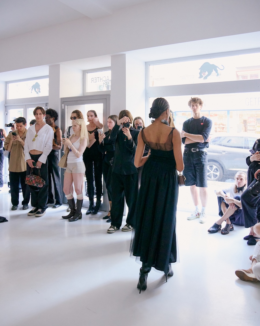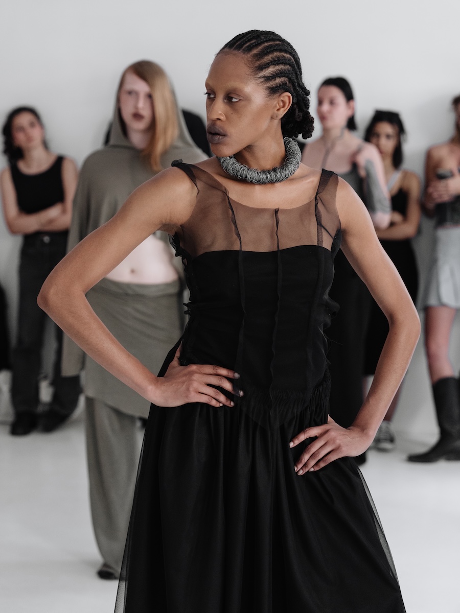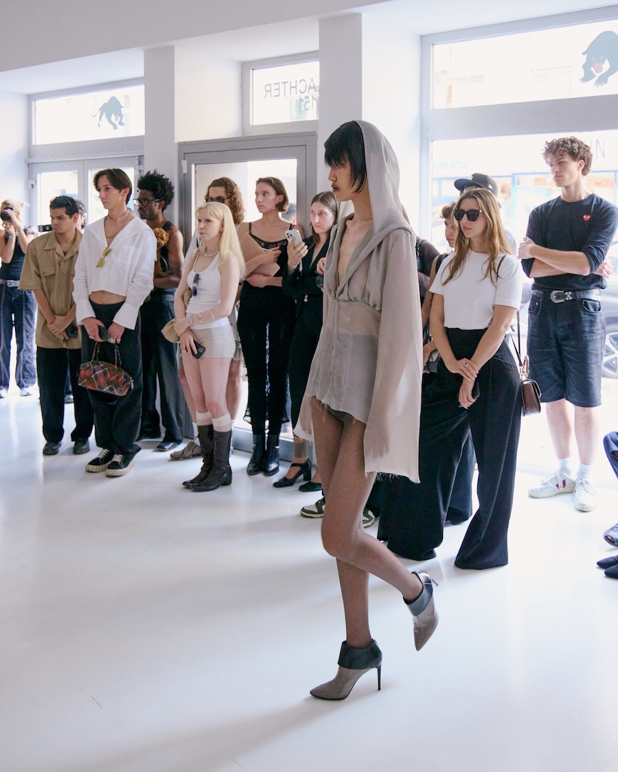 Building on the conceptual framework laid out in her astonishing FW25 runway debut collection, ‘REBUILT’, Baernthol’s ‘VENEER’ transcends mere fashion display. This collection moves away from the traditional runway, embracing a performative, site-specific immersive presentation that envelops the audience in a sensory experience. As guests entered Schlachter 151, they were greeted by models poised in elegantly choreographed stillness, their presence a silent yet powerful testament to Baernthol’s vision.