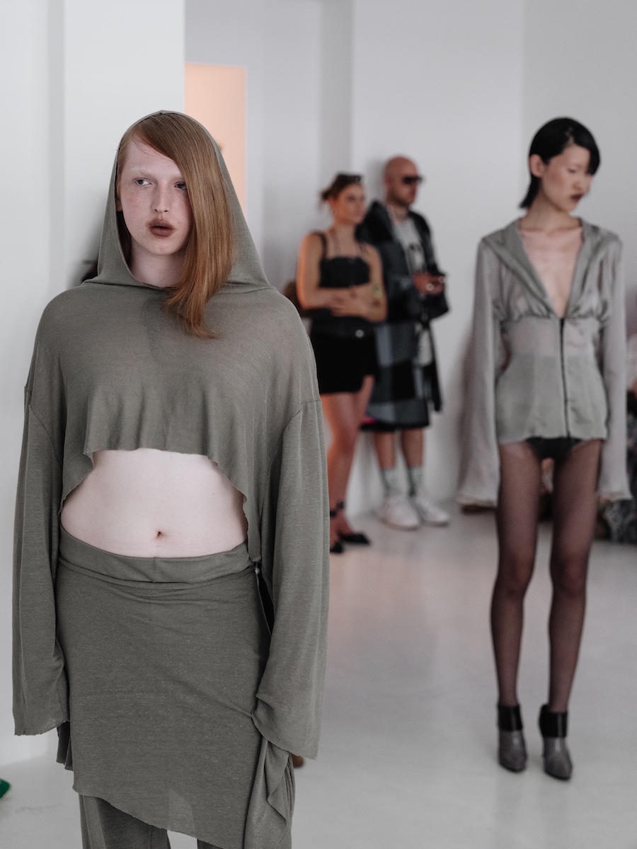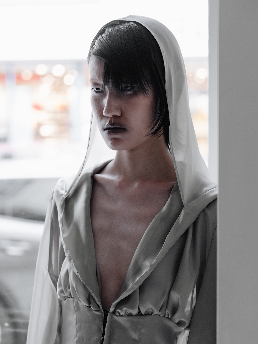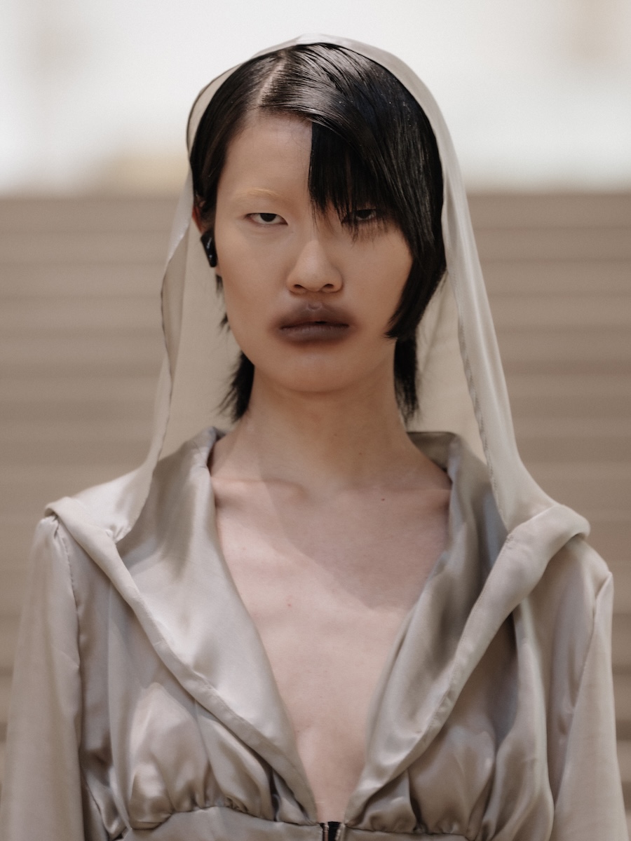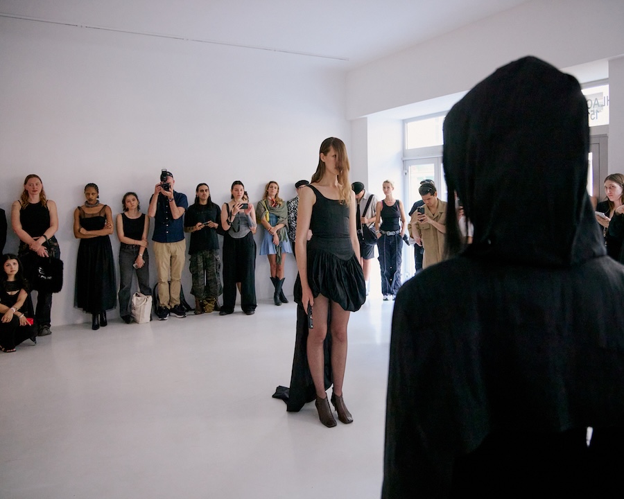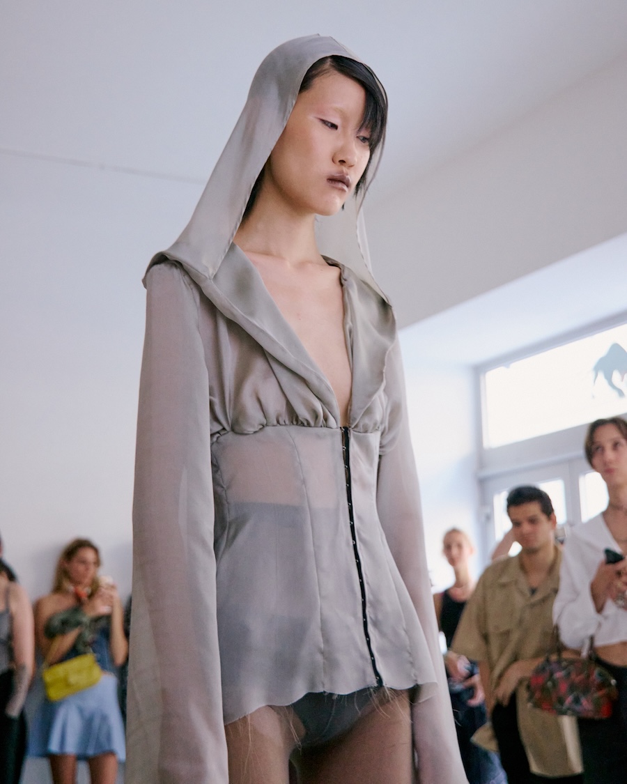 Building on the conceptual framework laid out in her astonishing FW25 runway debut collection, ‘REBUILT’, Baernthol’s ‘VENEER’ transcends mere fashion display. This collection moves away from the traditional runway, embracing a performative, site-specific immersive presentation that envelops the audience in a sensory experience. As guests entered Schlachter 151, they were greeted by models poised in elegantly choreographed stillness, their presence a silent yet powerful testament to Baernthol’s vision.