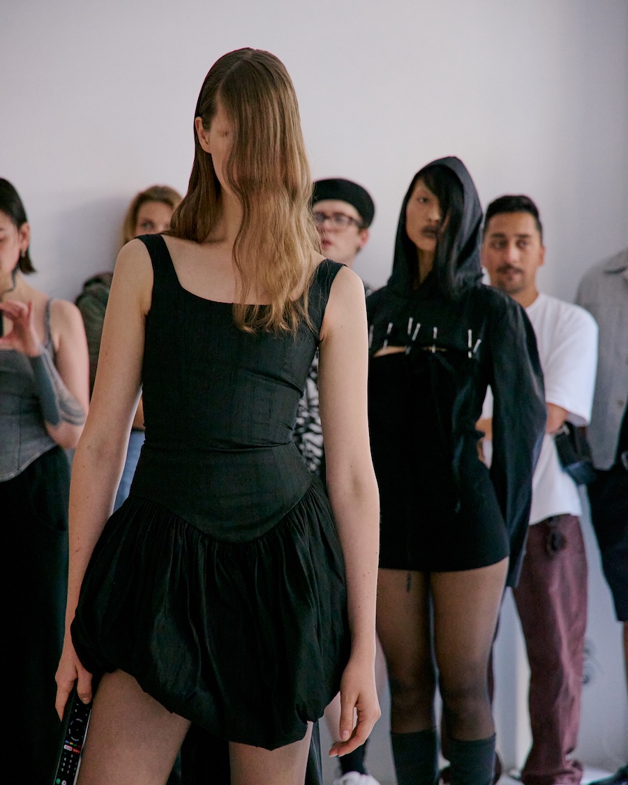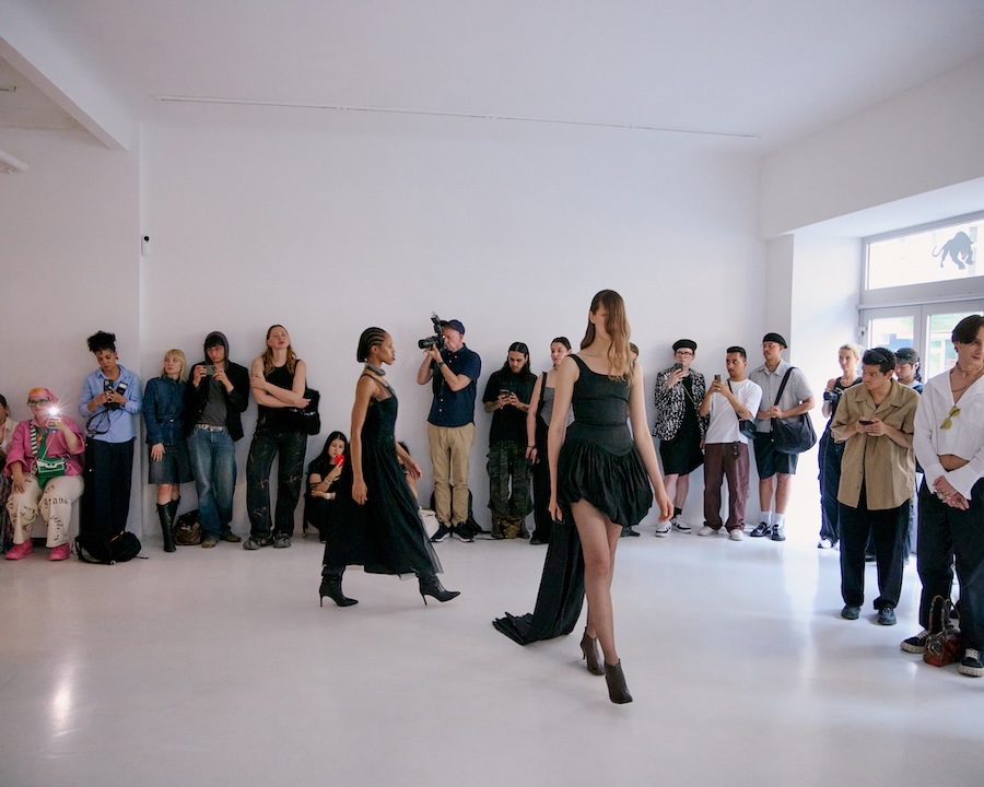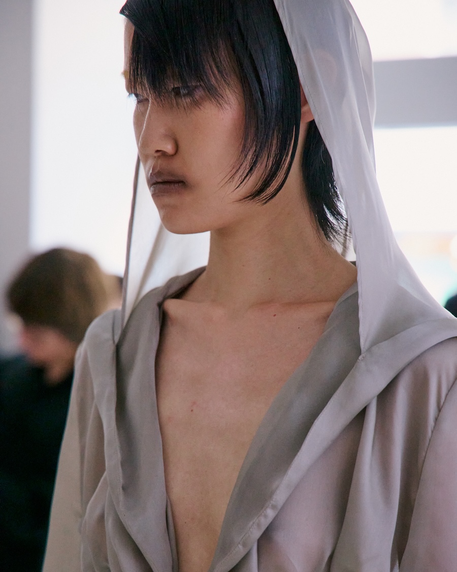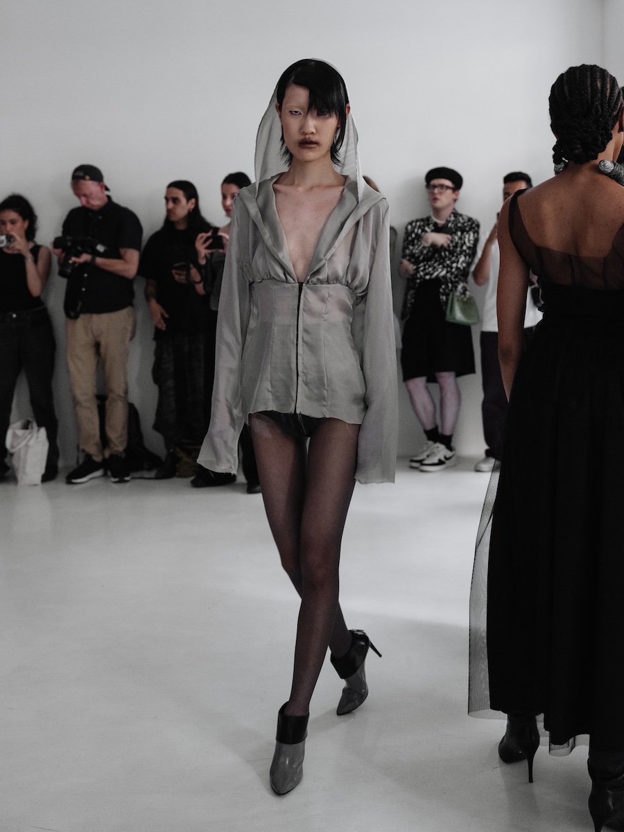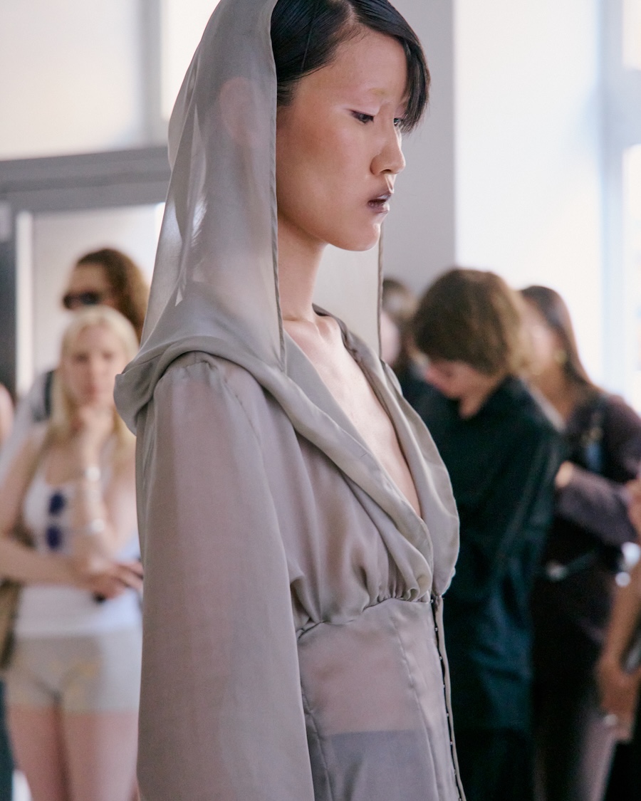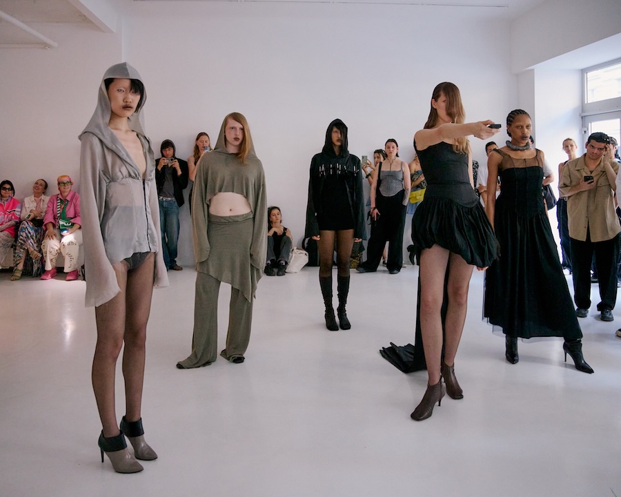 Building on the conceptual framework laid out in her astonishing FW25 runway debut collection, ‘REBUILT’, Baernthol’s ‘VENEER’ transcends mere fashion display. This collection moves away from the traditional runway, embracing a performative, site-specific immersive presentation that envelops the audience in a sensory experience. As guests entered Schlachter 151, they were greeted by models poised in elegantly choreographed stillness, their presence a silent yet powerful testament to Baernthol’s vision.