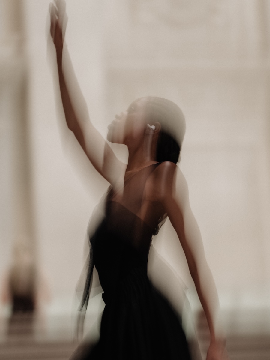 In a stunning duality, the performance unfolded not only in real-time but was also projected onto a screen through a film piece chronicling the descent of figures on the grand staircase of the Staatsbibliothek zu Berlin Unter den Linden. The architectural splendour of the Staatsbibliothek, with its neoclassical façade and rich ornamentation, played a pivotal role as a symbol of power, education, and cultural heritage. As the models descended the staircase, they mirrored the very principles of symmetry and clarity that define neoclassicism, creating an experience that was as immersive as it was introspective.