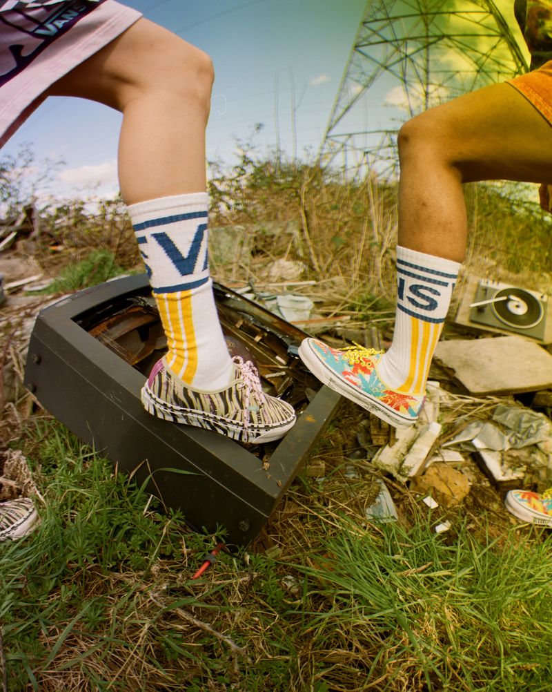 Leading the footwear collection is the OG Authentic LX, Vans’ first shoe in two vibrant colorways. The Weed Muted colorway features a multicolor marijuana leaf-inspired pattern on the uppers with pink, black and yellow striped laces, an Aries branded typographic foxing stripe, yellow color blocking on the vulcanized sole and art nouveau bordered text sidewall art.