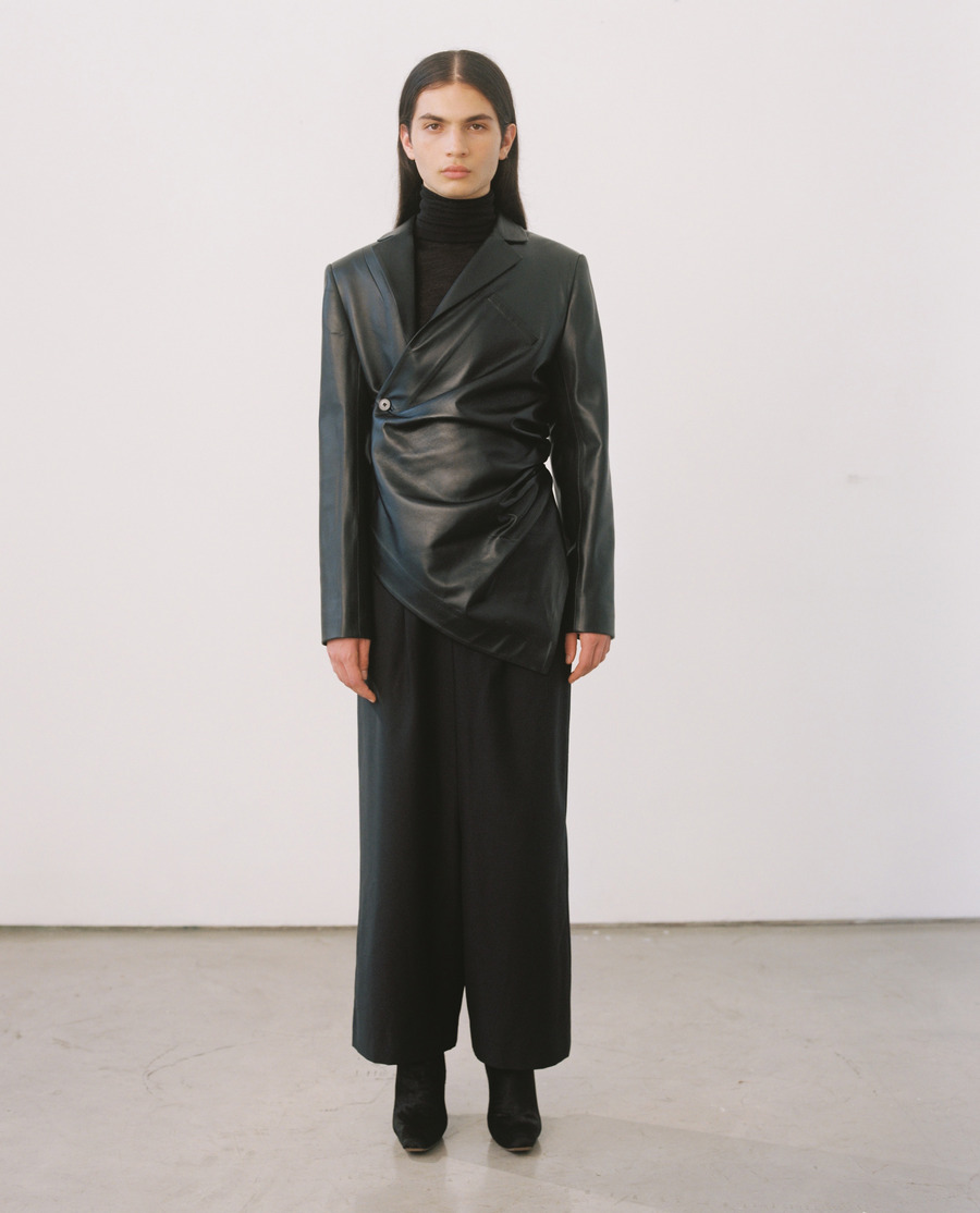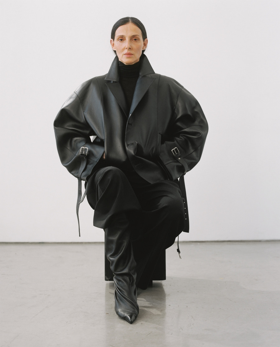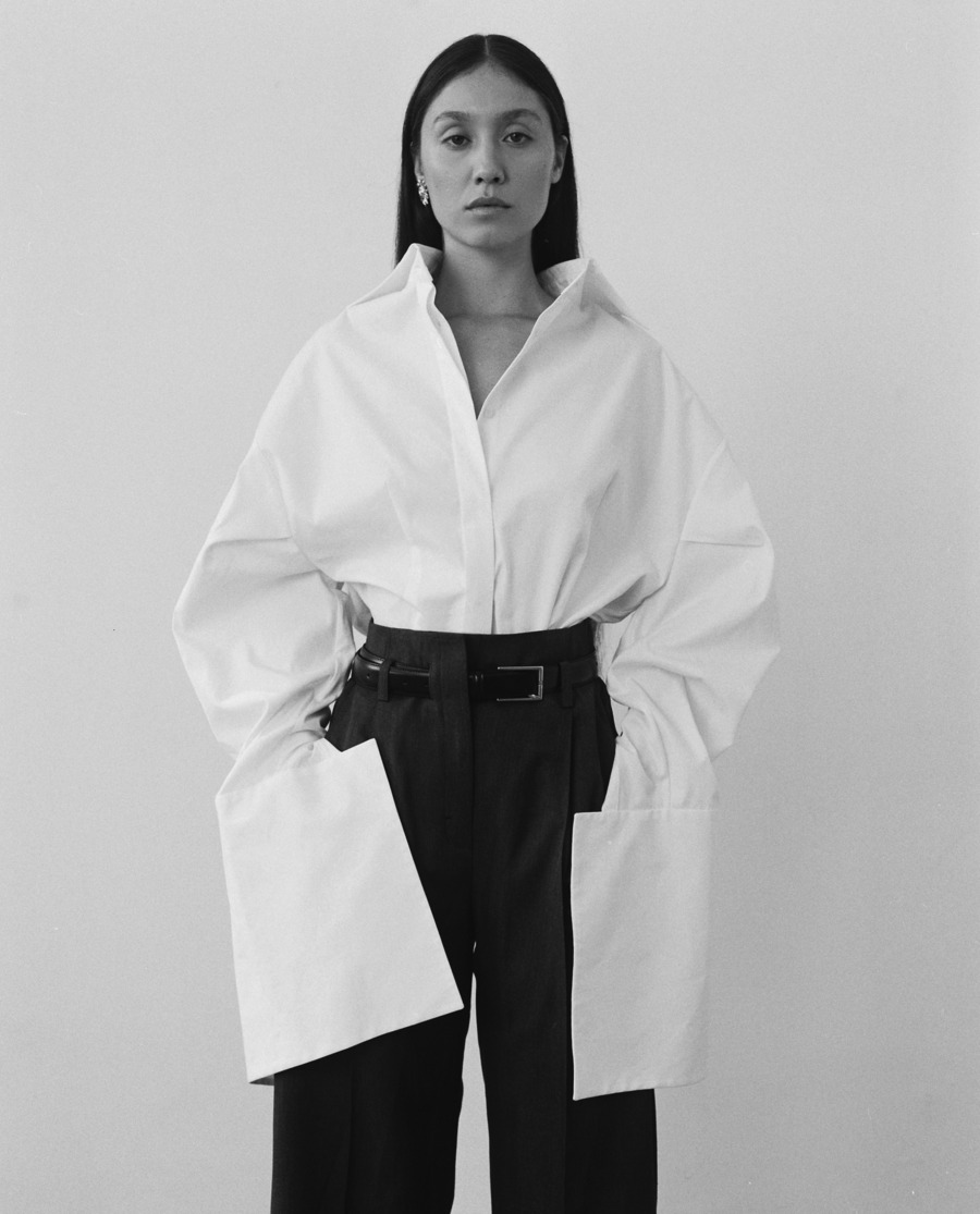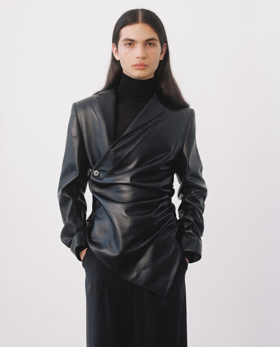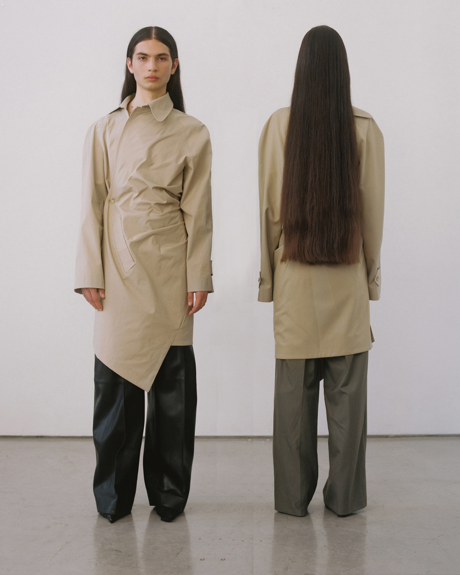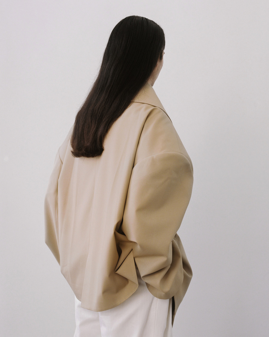 Inspired by “A Pigeon Sat on a Branch Reflecting on Existence” by Roy Andersson, a comedy as weirdly wonderful as its title, there’s no one moment of pure surreal flamboyance but it is a progression; the shifting and darkening of mood make narrative sense in context. The SS23 collection builds to an ineffable beauty on something surprisingly profound and interrupted. The styles are classic and so are the fabrics; crispy cotton shirts, wool jackets and soft leathers, however, turn them around and it’s a different story; exaggerated silhouettes, dramatic sleeves, asymmetric shapes, gathered fabrics by a string, or by deconstructed pleating. The broad array of neutral and muted tones emphasizes the refined lines of the silhouettes and blends with the facial features. There is something expected however unexpected un-fine-ness.