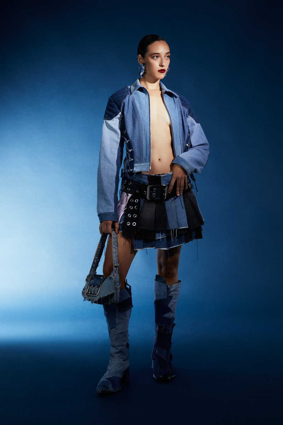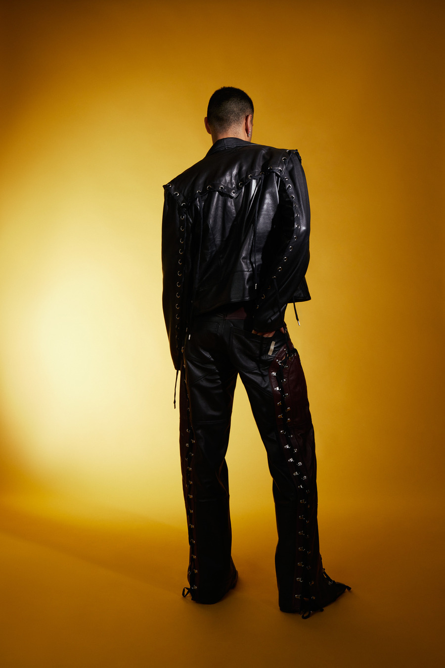 We continue our journey to explore and subvert the archetypes of the Menswear scope with the designerʼs coined aesthetic infused with a rebellious and ‘punkguardistaʼ spirit, we present a mash-up of repurposed leathers, denim and cyclist garments that allows the wearer to self-expression in the most personal, political and sustainable way.