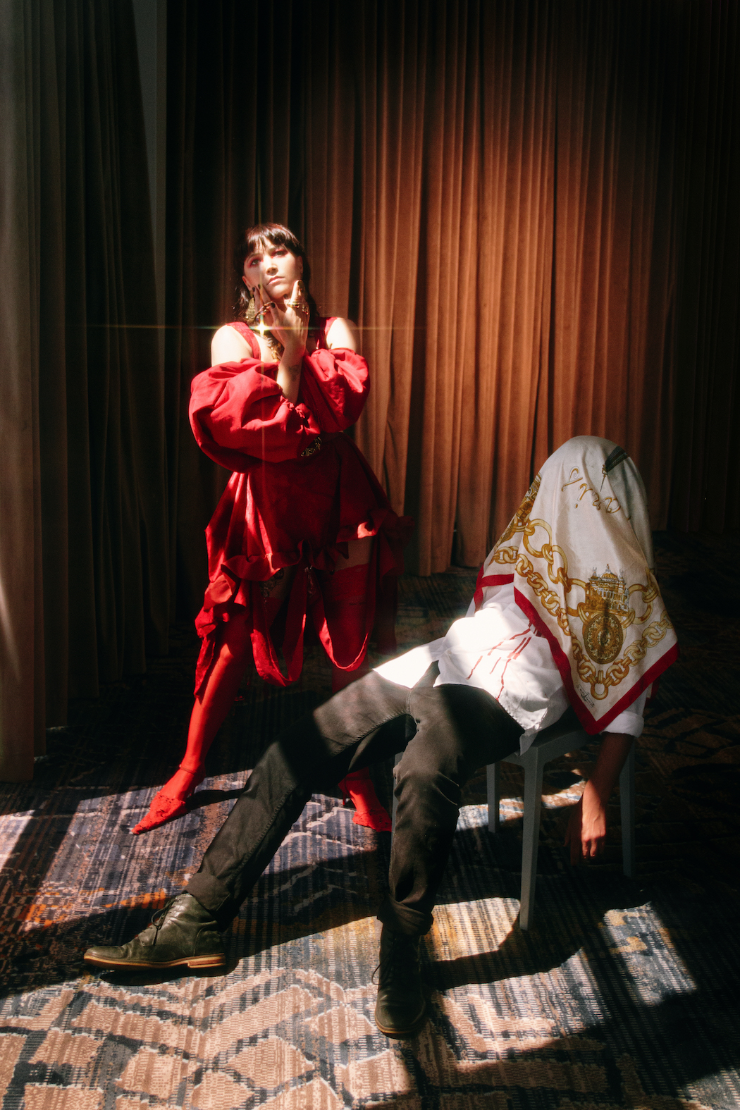 Shot and directed by Hankyeol Lee, the video for ‘Baby I’m Gold’ started as a simple, super low-budget idea that became something much bigger when Art Director Daniella Dagnin began forming the space, showing us what was possible with a little velvet cloth and some tape. The story follows Bergen’s character who, obsessed with news anchor/on-the-run fugitive, Lenny-Dee, embarks on a delusional adventure through imagination, finding himself in a bar where he believes she is evading capture by disguising herself as the house-band’s singer. As the two play cat and mouse, the space around them is brought to life with cuts of our actual neighbours of the ‘Graceland 2’ complex, as well as special character we have been featuring in videos and on stage for years now. You will notice her in a yellow costume with no face.”