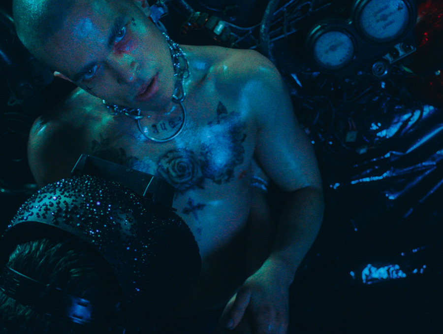 The accompanying music video, marking Teddy’s directorial debut, is a sultry spectacle. Embracing the ‘sexy mechanic’ archetype, Teddy’s oiled, tattooed body and chains create a provocative image. He transforms the hyper-masculine mechanic garage into a playful, queer space. The video is packed with tongue-in-cheek gestures and vintage male model cutouts, culminating in a climactic homoerotic wrestling match.