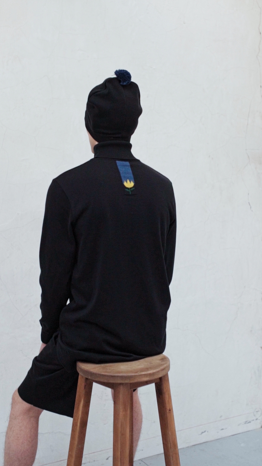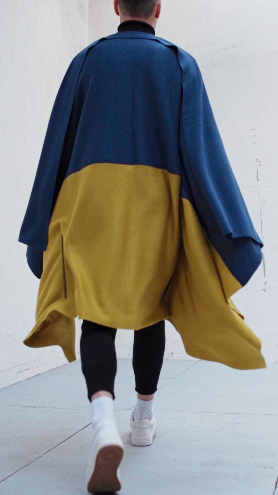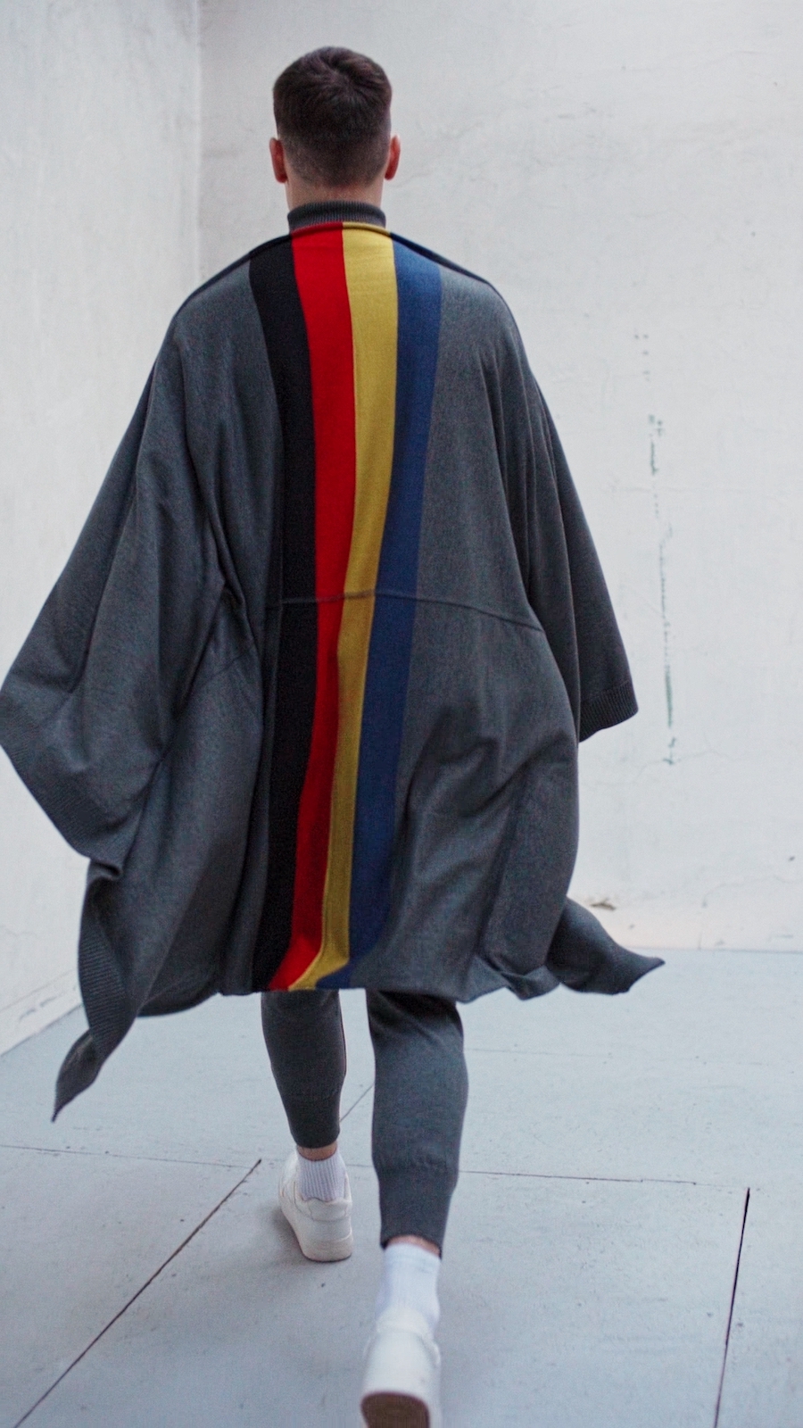 Thus, the collection includes suits with stripes in the colours of the Ukrainian flag and the red-black revolution flag, as well as T-shirts, shorts and turtlenecks decorated with flaming yellow tulips on a blue background. The centrepiece of the collection is a double-sided poncho with the Ukrainian flag, which, according to the designer, should give its owner a sense of safety and strength. Viktor Anisimov refers to the almost iconographic image of a person wrapped in a flag – a symbol of security and resistance actualized by the war, and also considers the flag the most expressive and fastest way of identification in today’s reality.