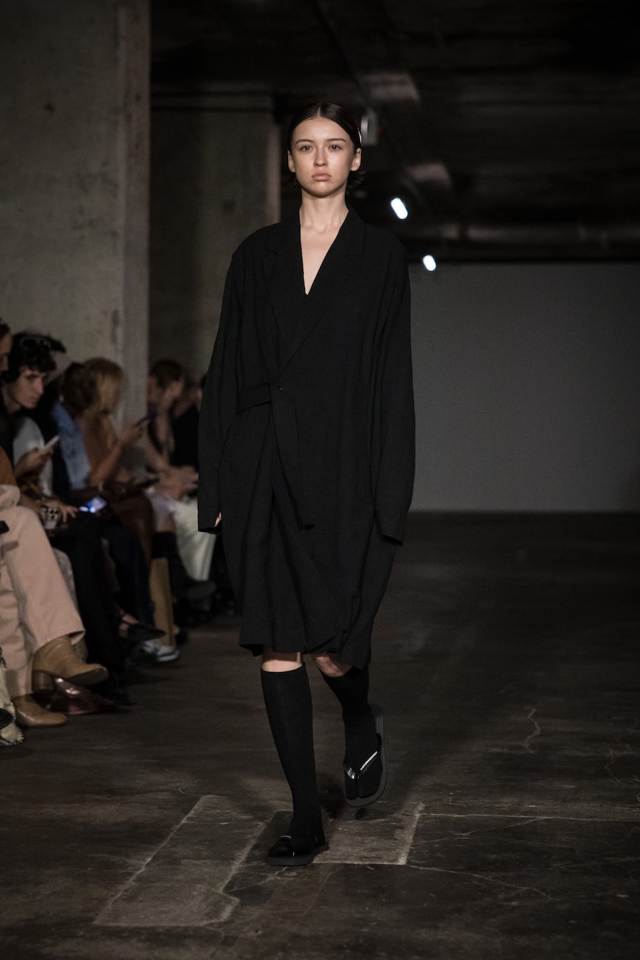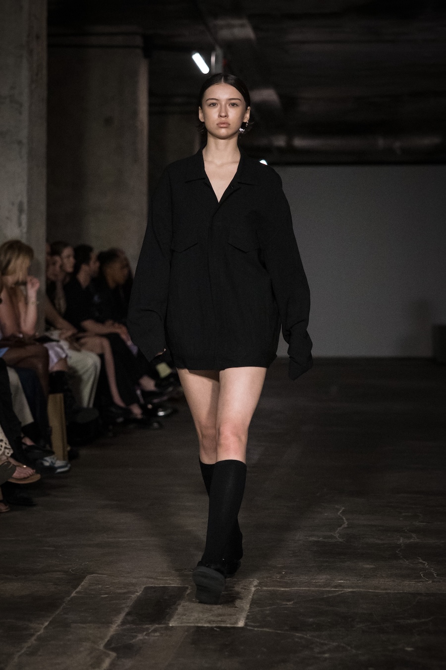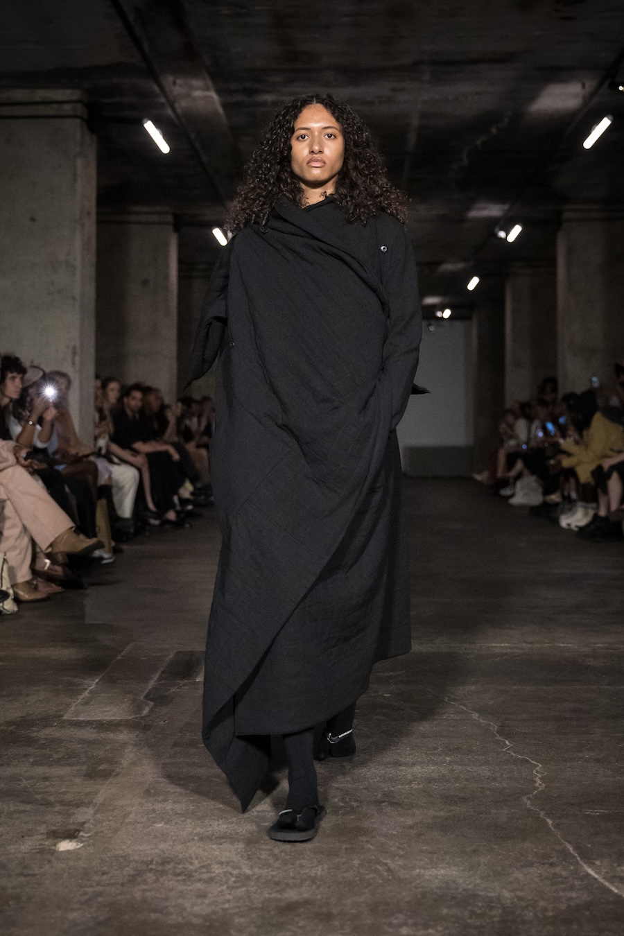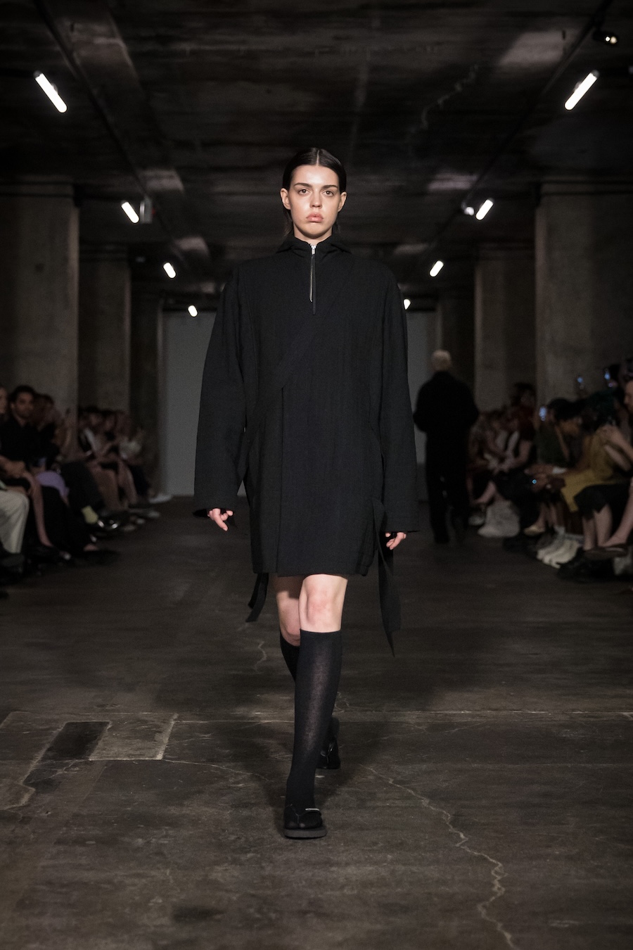 The collection unfolds with masterfully crafted looks, each informed by an architectural precision that marries form and function. Central to the narrative is a poignant figure clad in black, set amidst the haunting remnants of a missile-ravaged structure. This choice of colour transcends mere aesthetics, channelling the essence of reality while simultaneously cultivating a glimmer of hope for renewal and resilience.