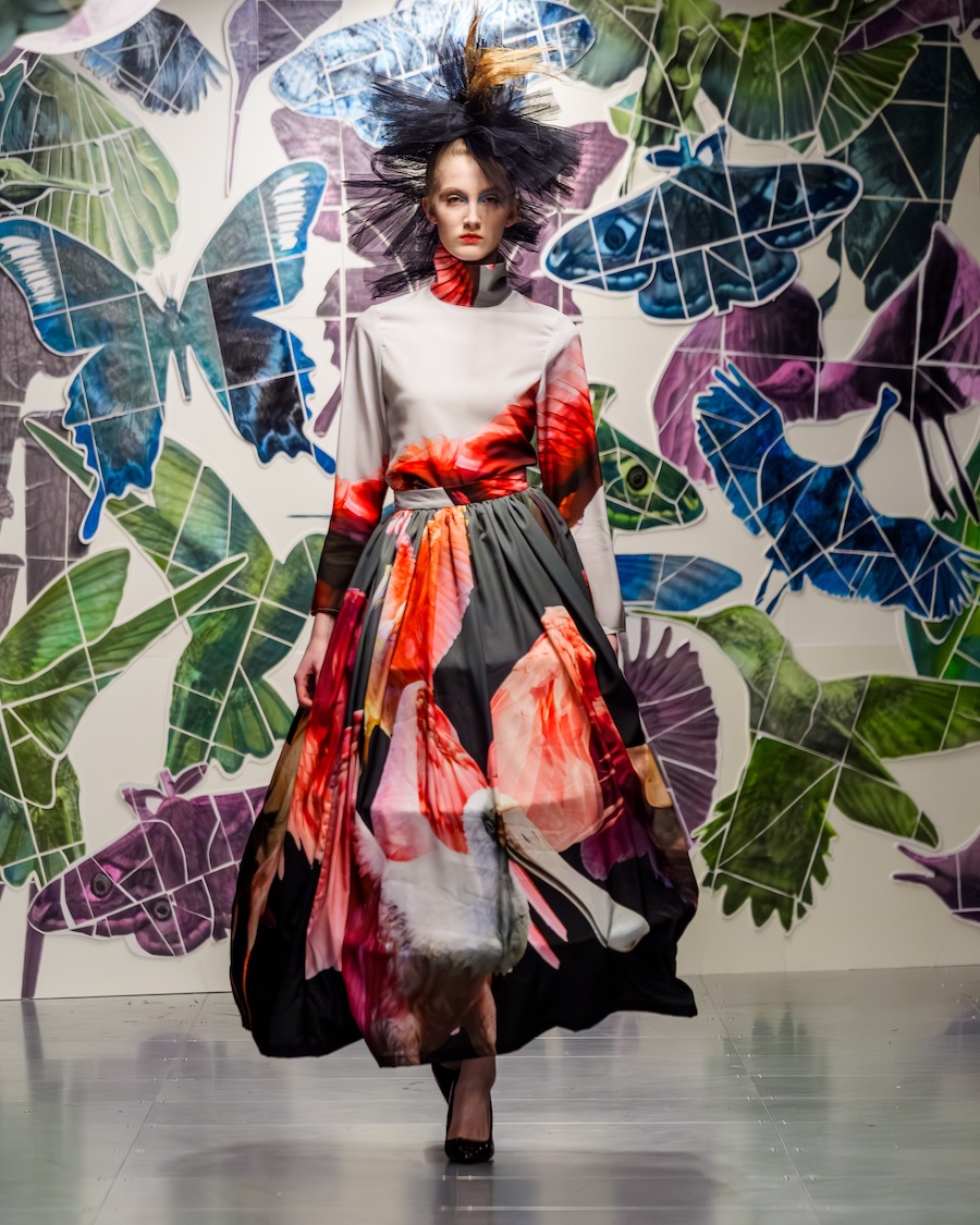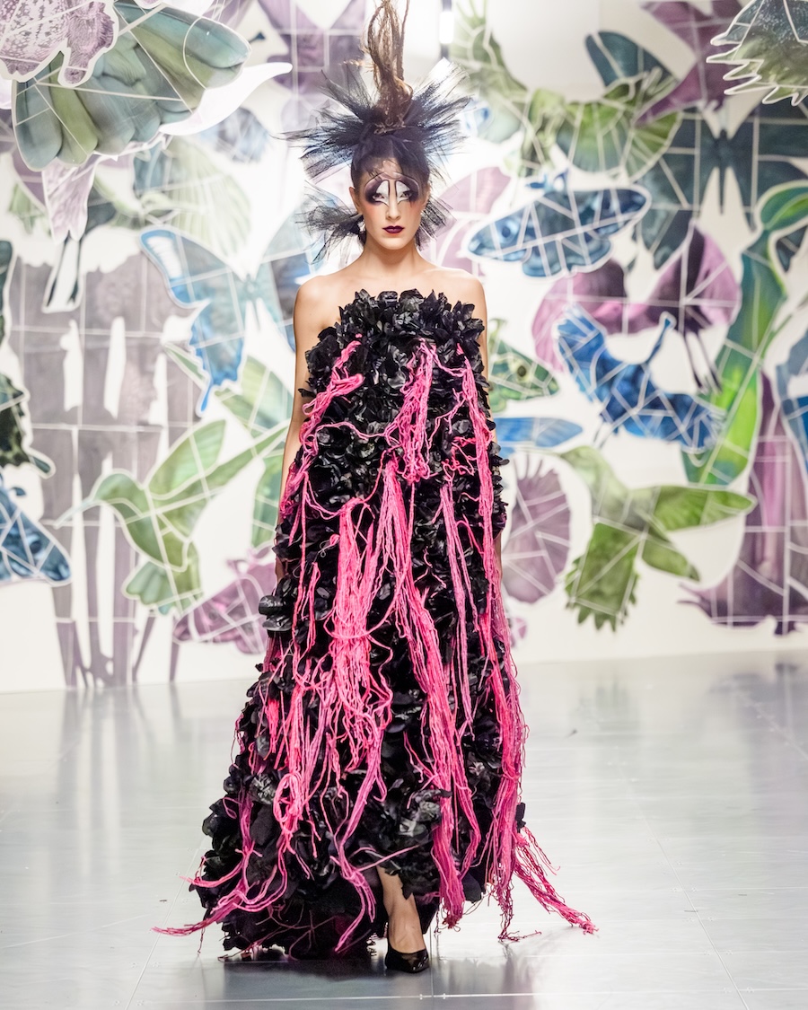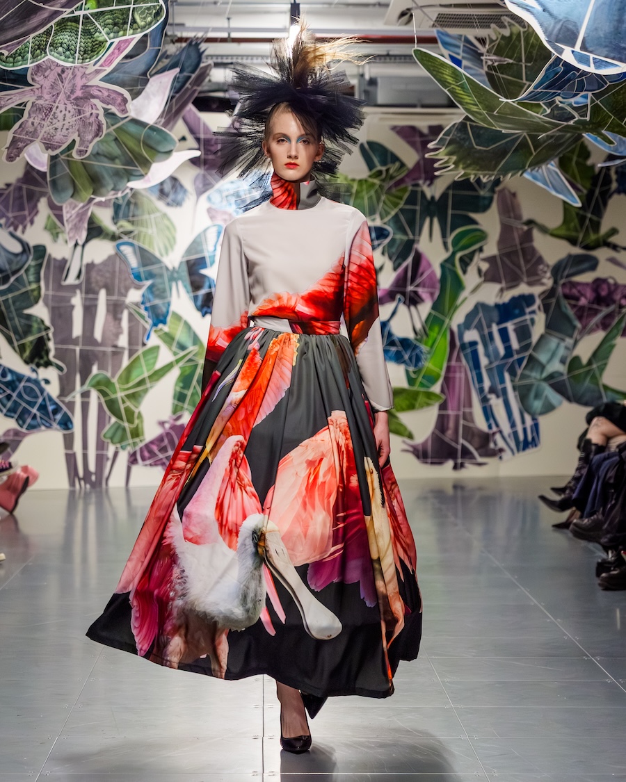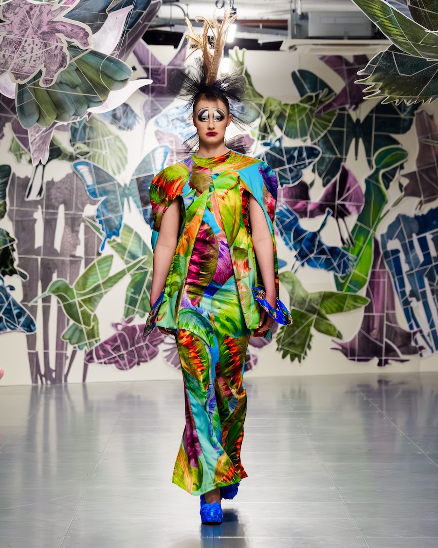 Technicolour chaos ruled the runway, clashing tones, distressed textures, punctured fabrics. Sustainability doesn’t have to be beige, darling. It can scream. There was a dress made from RAF waste metal cans. Another from discarded RAF field equipment. Even art got in on it: Vin + Omi teamed up with Daler-Rowney to turn recycled paint tubes into printed dresses, while damaged art supplies built the set (shout out Oxford Brookes Art & Design Foundation).