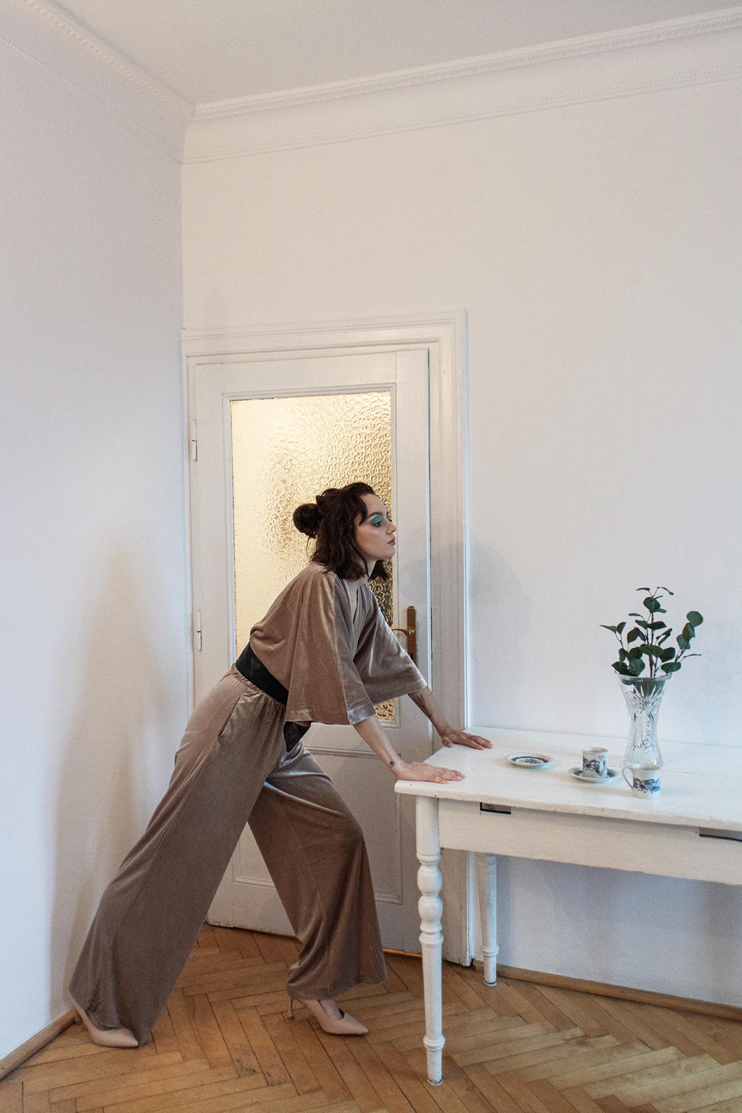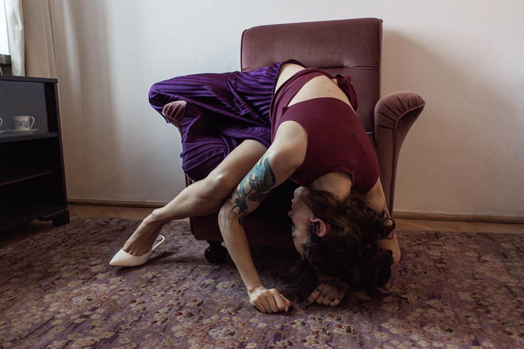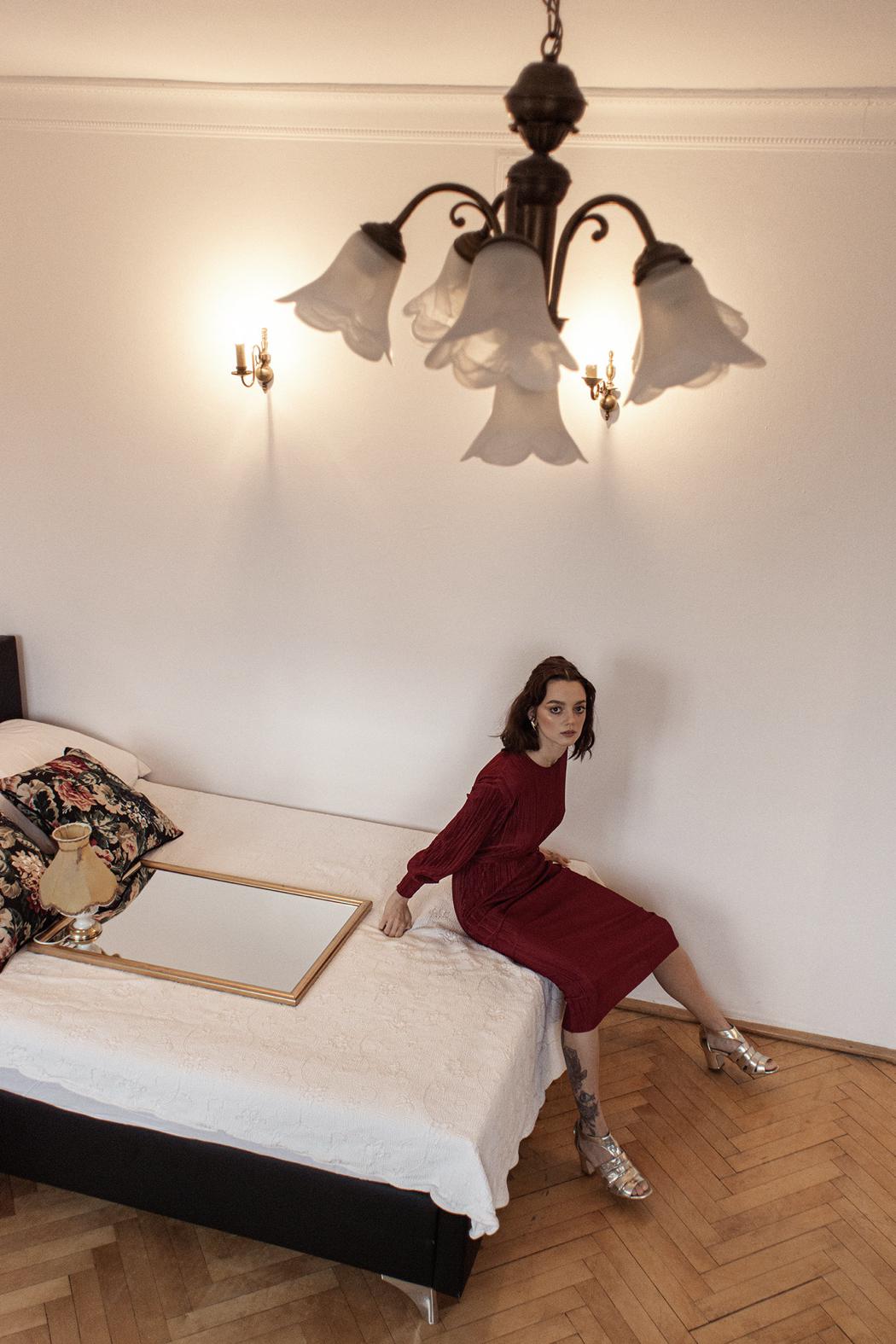 Julia Klyukach is a photographer based in Warsaw. This photo shoot kept firmly in the spirit of the Polish People’s Republic, that’s why it took place in a flat moderned on this style (old colourful armchairs, turkish rugs, wooden furniture etc.) The time of paradox and detachment from reality is to emphasise the strange poses of the model even more.