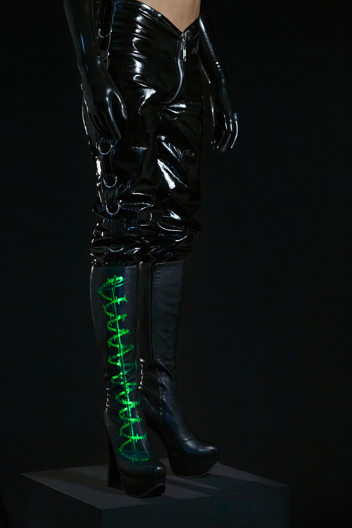 In ‘LUX’ translucent pieces capture the fluidity and amorphous quality of light. Sculptural designers such as Teodora Mitrovska help build layers of sculptural light onto Wax Wings’ body. Beneath the external layers are reflective latex pieces by Studio FCLX and Torture Garden Latex. Custom projections are mapped onto boots by Natacha Marro. The bespoke AR crown filter of barbed wire and red eyes also has a minimal feel. Ultimately, the light becomes the outfit – and the outfit becomes the identity. Augmented reality is a luxury item. Light is the ultimate sign of success in an increasingly dark world.