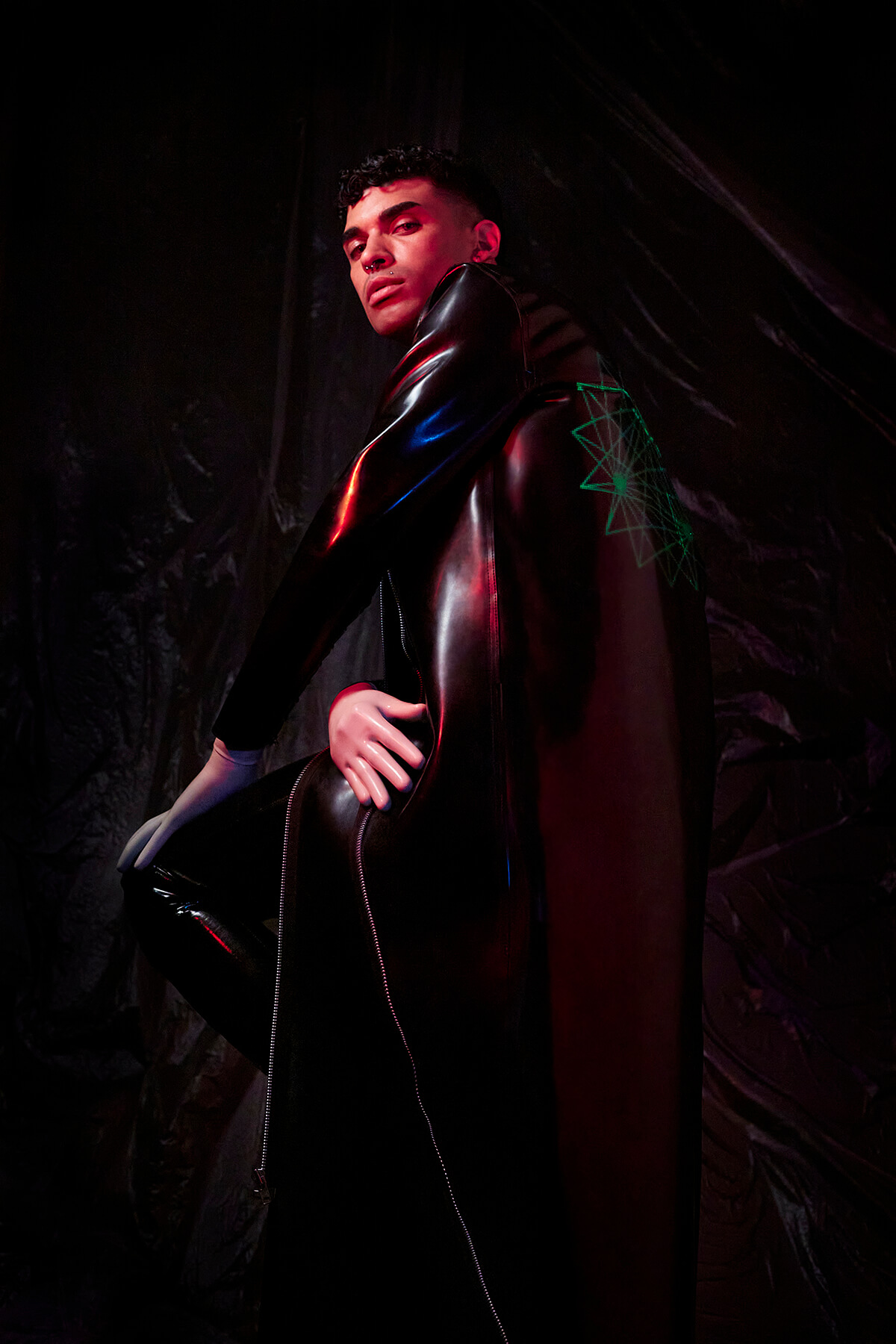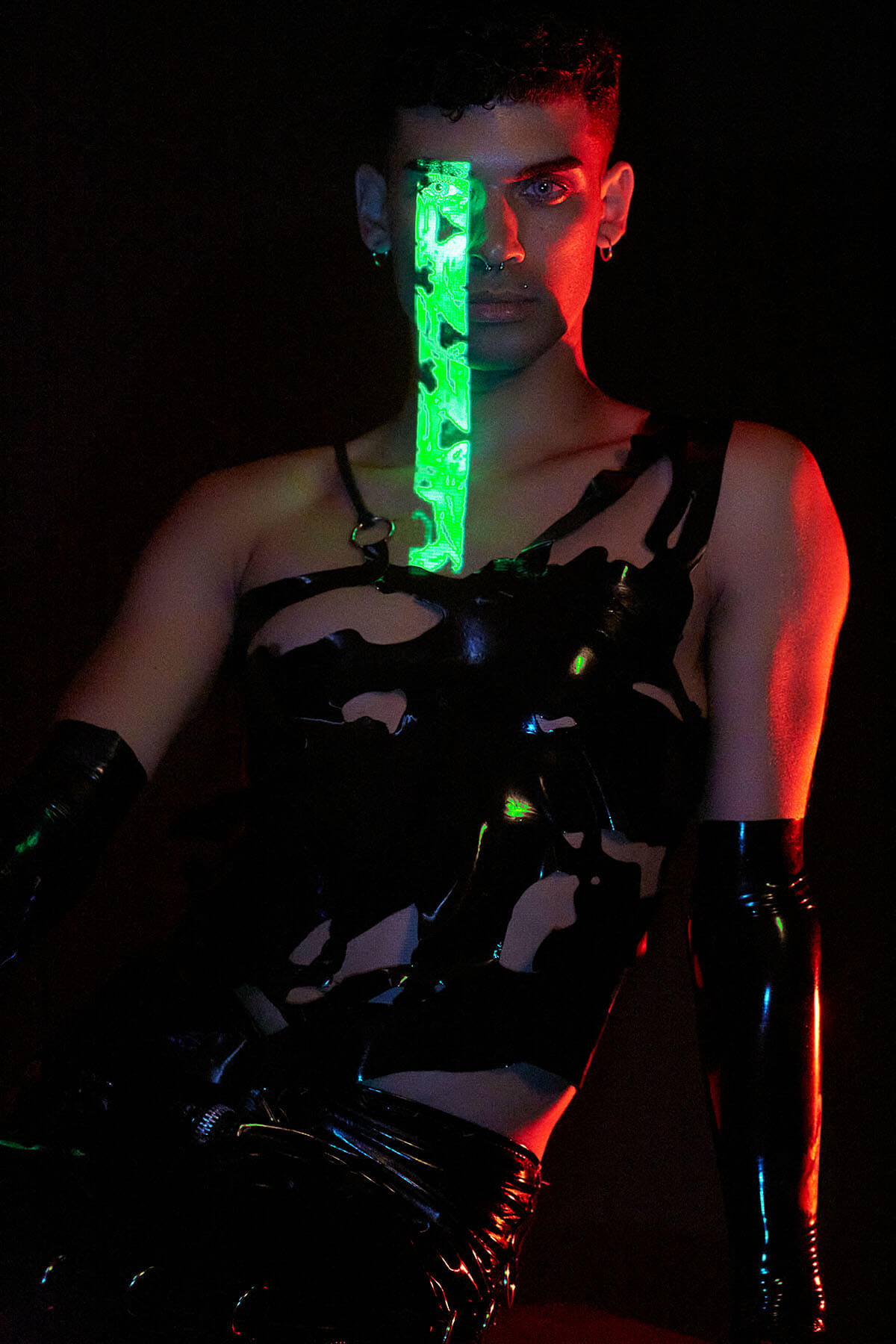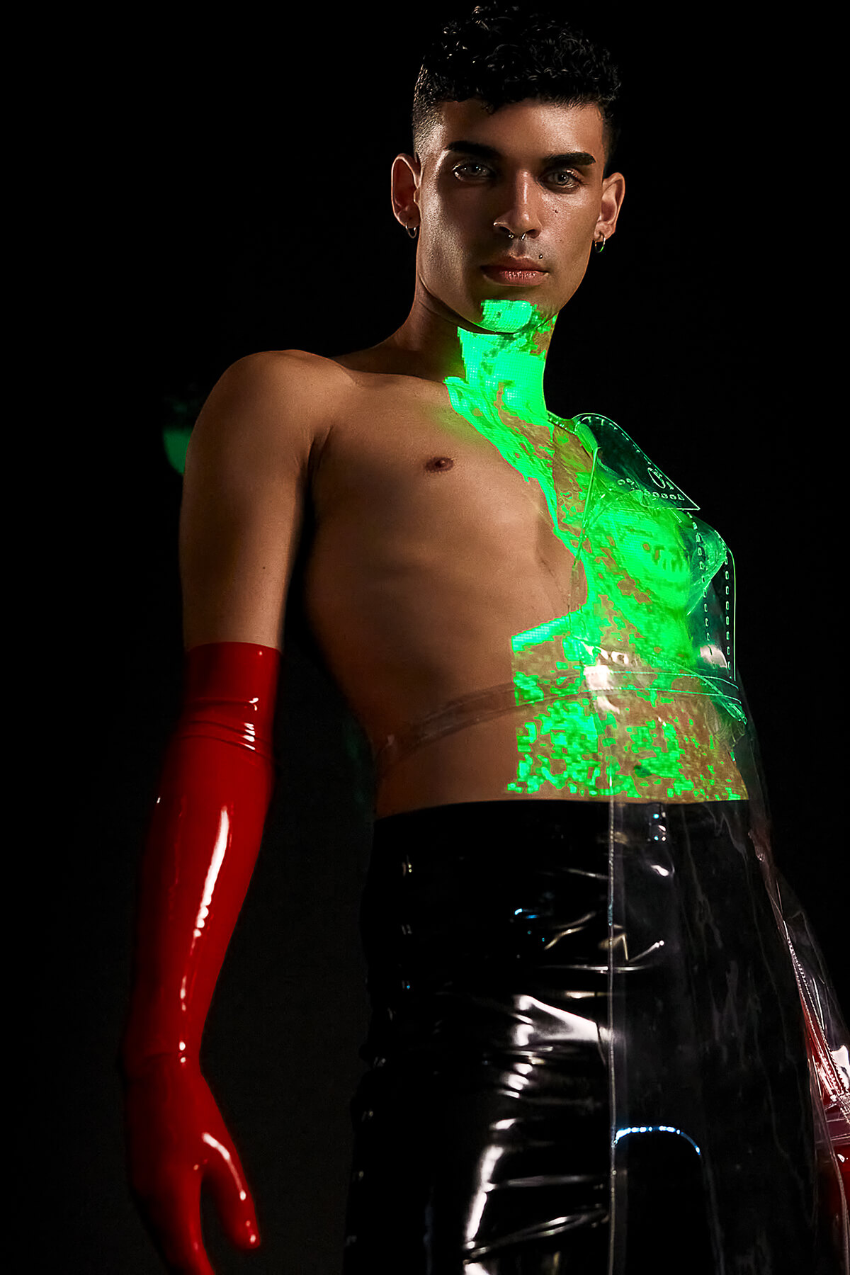 In ‘LUX’ translucent pieces capture the fluidity and amorphous quality of light. Sculptural designers such as Teodora Mitrovska help build layers of sculptural light onto Wax Wings’ body. Beneath the external layers are reflective latex pieces by Studio FCLX and Torture Garden Latex. Custom projections are mapped onto boots by Natacha Marro. The bespoke AR crown filter of barbed wire and red eyes also has a minimal feel. Ultimately, the light becomes the outfit – and the outfit becomes the identity. Augmented reality is a luxury item. Light is the ultimate sign of success in an increasingly dark world.