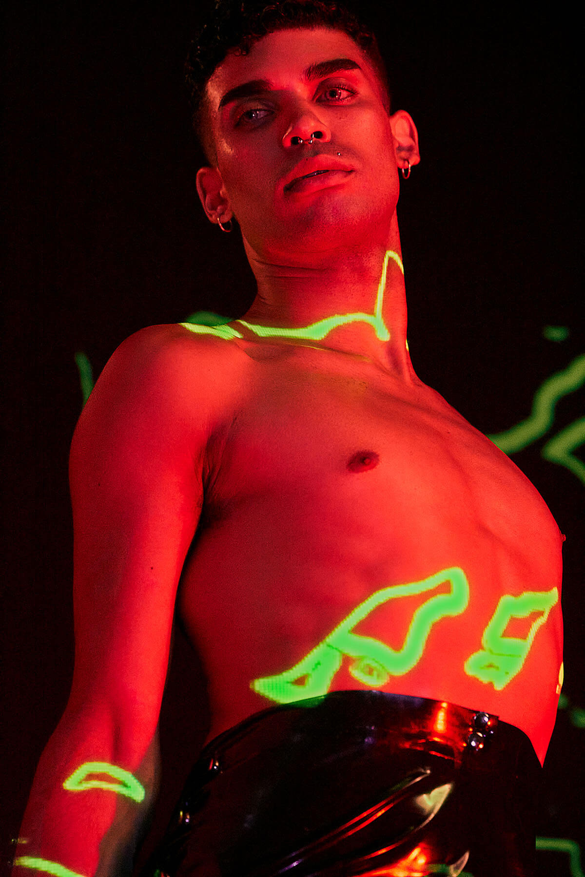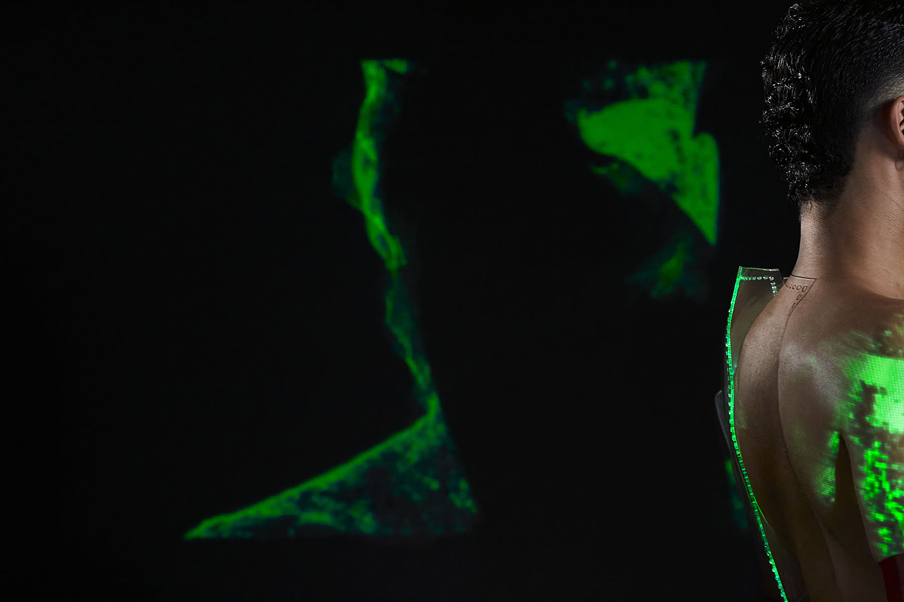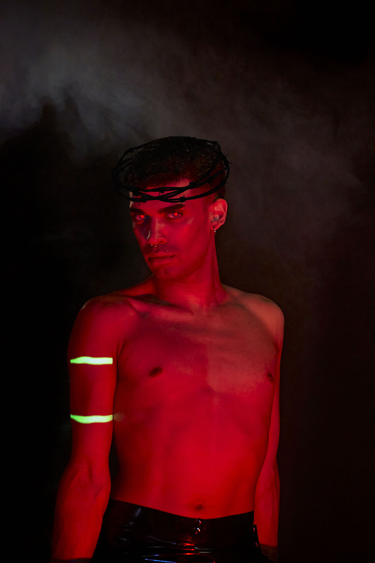 In ‘LUX’ translucent pieces capture the fluidity and amorphous quality of light. Sculptural designers such as Teodora Mitrovska help build layers of sculptural light onto Wax Wings’ body. Beneath the external layers are reflective latex pieces by Studio FCLX and Torture Garden Latex. Custom projections are mapped onto boots by Natacha Marro. The bespoke AR crown filter of barbed wire and red eyes also has a minimal feel. Ultimately, the light becomes the outfit – and the outfit becomes the identity. Augmented reality is a luxury item. Light is the ultimate sign of success in an increasingly dark world.