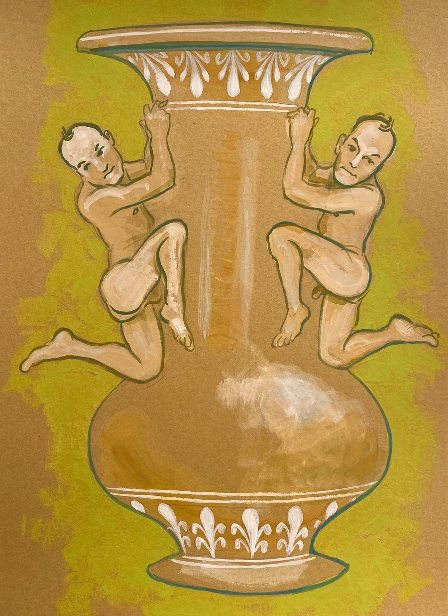 Known for his appreciation of hermetic symbology within secret societies, Fontenot masterfully reveals the subtle queer sensibilities submerged in pre-Stonewall artistry. In his exhibition, he pays homage to the coded visual language of “Greek Ideals” and reclaims its witty, clandestine excitement, and inherent subversiveness.