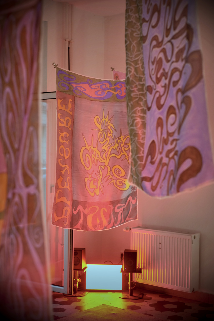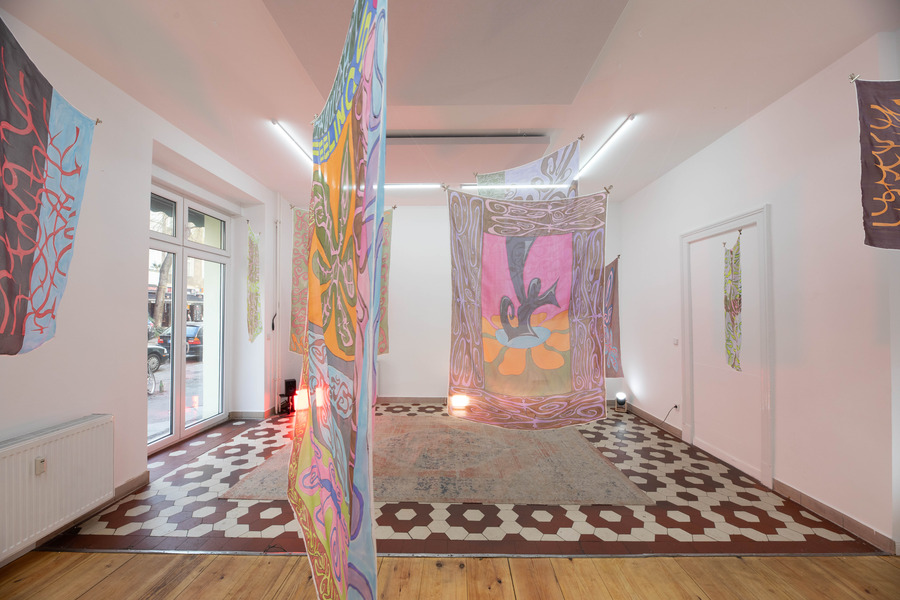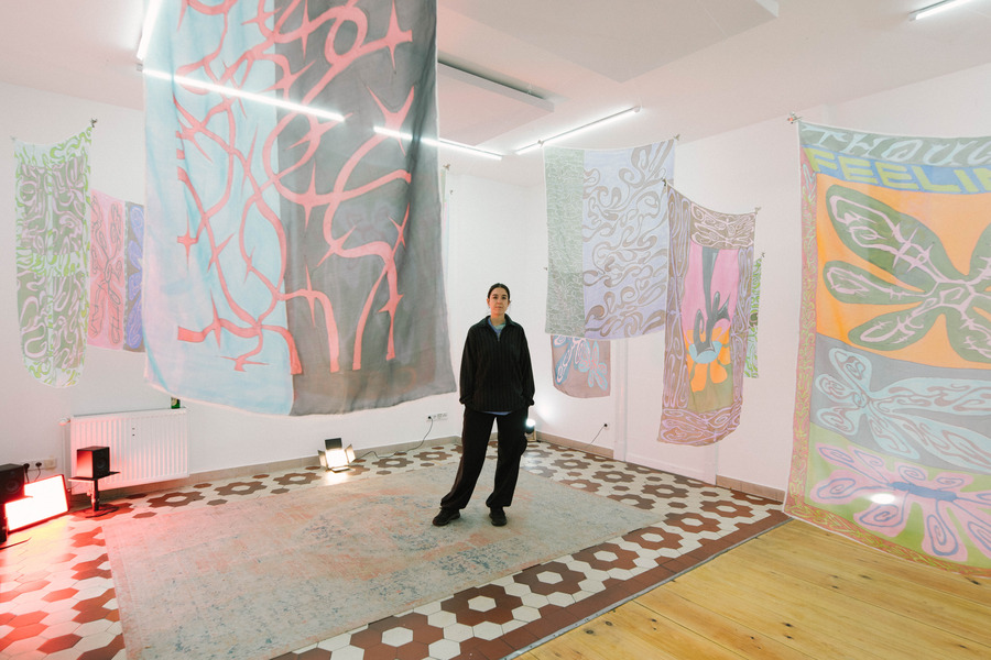 Thoughts and Feelings, her latest project, is a collection of paintings on silk. Recently exhibited at Backhaus Projects in Neukölln, it’s a euphoric body of work that ripples with queer imagery and wordplay, celebrating pleasure, tenderness, and connection. Painted onto these translucent squares are intimate anecdotes, snippets of song lyrics, and in-jokes from nights out/in with friends. Some lines are bold, some intricate, as Daisy depicts an ongoing search for balance “between softness and strength, calm and chaos, high and low culture, the meaningful and the meaningless”. Floating in the breeze, the silks dance, whisper to you, and beckon you in.