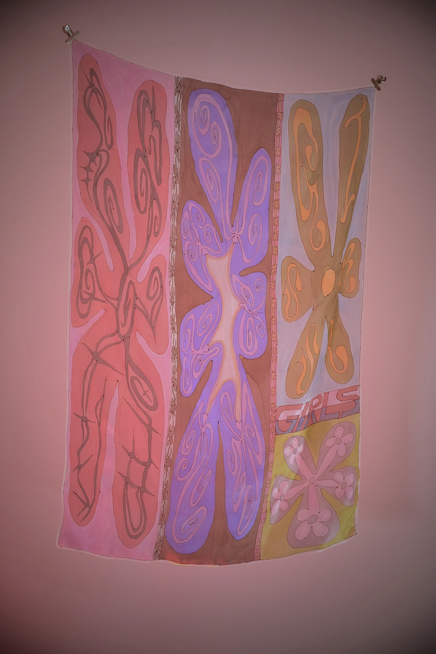 Daisy: I came back from travelling at the start of March and basically painted the whole show in five weeks, working dusk till dawn. I had the date set, I knew I had to fill the space, and I knew I was going to do silks. I’d been thinking about it for a while and sketched out ideas while travelling. But I guess for the past few years I haven’t been able to hold onto any artworks because I’ve needed to sell what I make. Thoughts and Feelings was the first time I had the luxury of working towards a big collection.