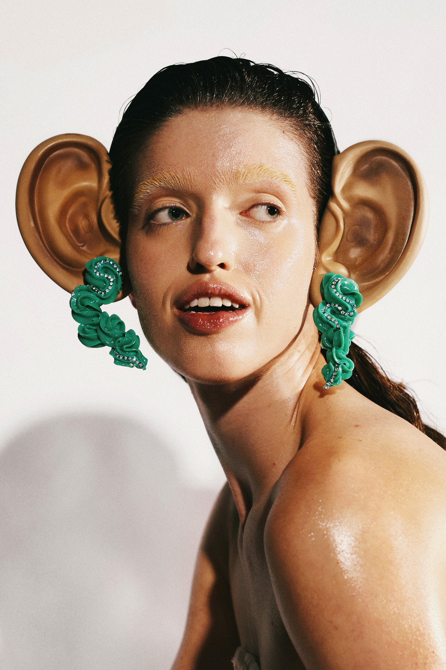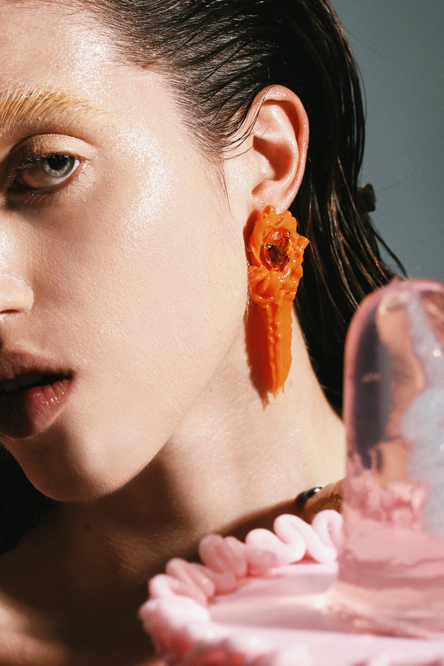 Extravagant, subversive and bold. Whipped jewels resemble whipped cream with colourful stones dipped inside — resisting eating them is a daily struggle. As sensory play and an element of surprise are engrained in the DNA of the house of rubber, the jewellery’s shape and texture are very enticing, it irresistibly invites touch. Upon contact with the skin, the wearer might be surprised by the feel of the material, as it may not be what they initially anticipated.