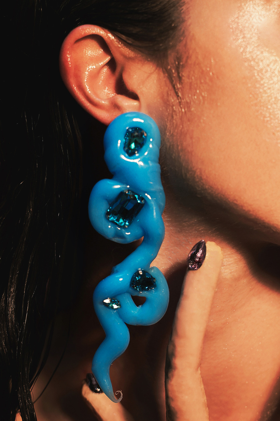 Extravagant, subversive and bold. Whipped jewels resemble whipped cream with colourful stones dipped inside — resisting eating them is a daily struggle. As sensory play and an element of surprise are engrained in the DNA of the house of rubber, the jewellery’s shape and texture are very enticing, it irresistibly invites touch. Upon contact with the skin, the wearer might be surprised by the feel of the material, as it may not be what they initially anticipated.