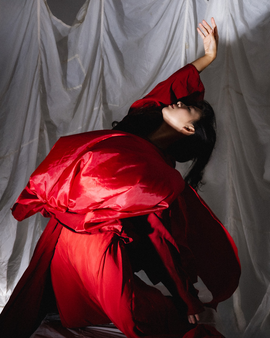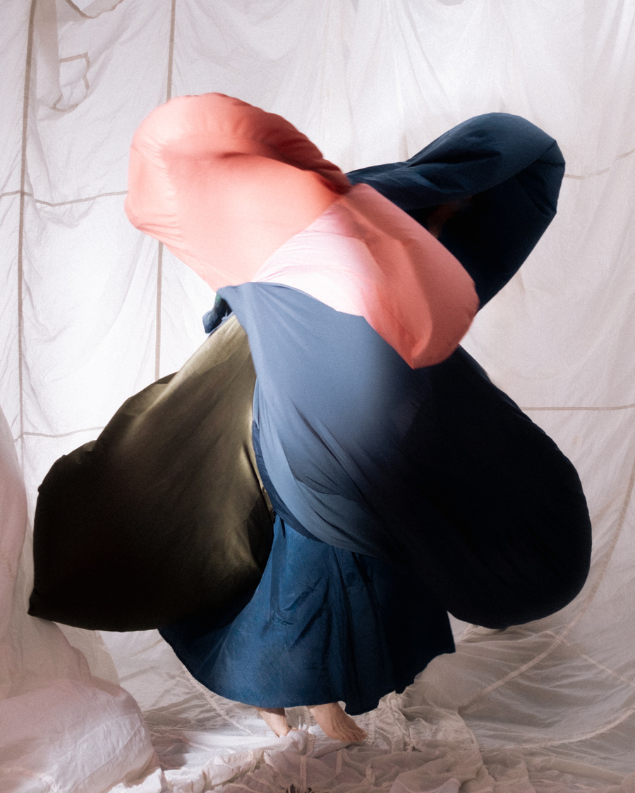 The series showcases Shantis’ Wind Garments from her collection ‘Hear Me Now’, which explores how parents influence the self. Set against a backdrop of silk parachutes billowing in the wind, the team captured fleeting forms and Adas’ transitory movements at Owens’ Hackney studio.