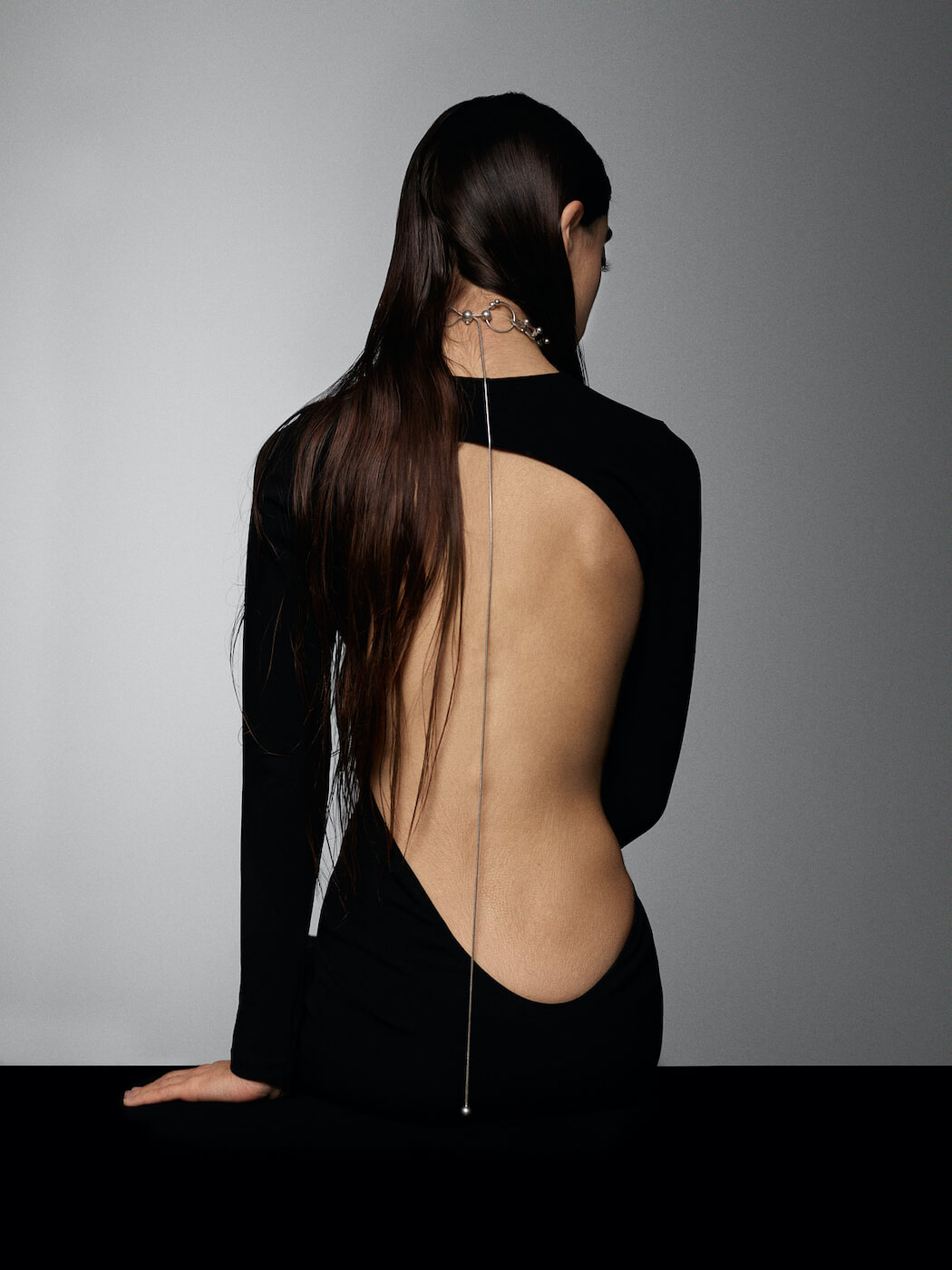 Locks and mechanisms become the focal point of the designs. Pierced stones act as links and are integral to the construction of each piece. Ear-cuffs with detachable earrings and necklaces combine to create body harnesses; with such a vivid duality at work, there is an interactive playfulness throughout.