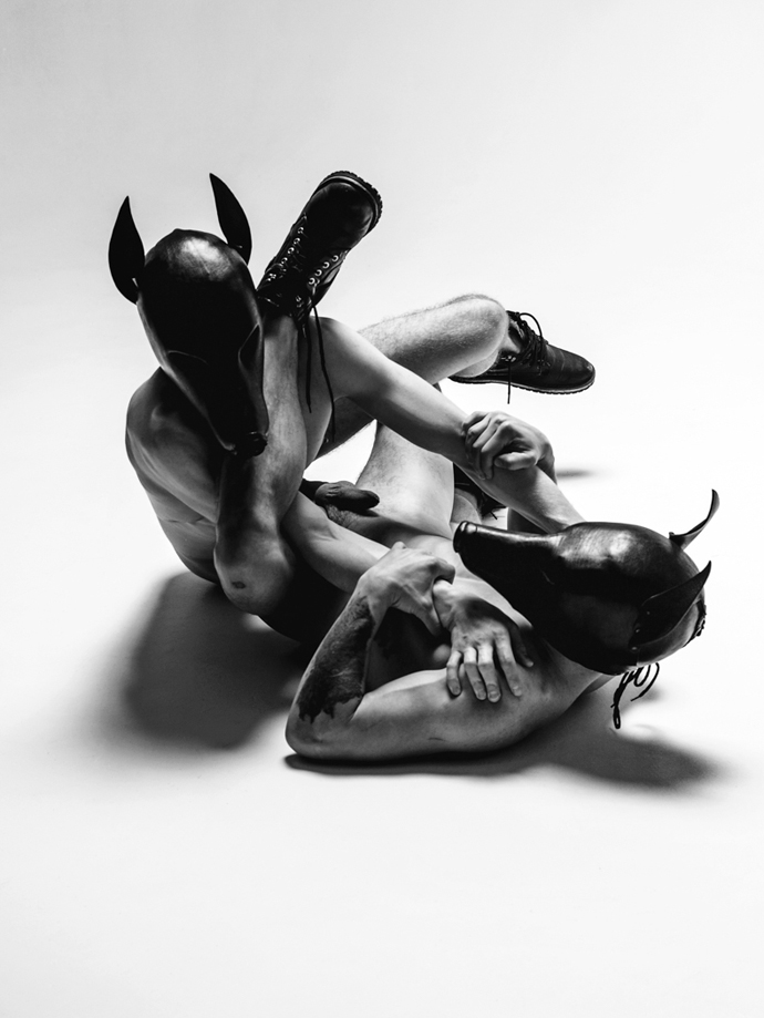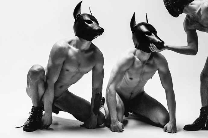 A KALTBLUT exclusive editorial. Photography by Dmitry Komissarenko. Models are Kirill Makhankov and Vlad Kirkelan, Vladimir Rogachov, Igor Skok. All leather masks by Bob Basset. Previously Ukrainian photographer Dmitry Komissarenko presented the series of photographs The M: Man in the Mask with the support of studio Bob Basset. This time he tells us another story Who Lets The Dogs Now. The dogs in this series – is in fact the first reaction of people looking at these pictures. Astonishment, embarrassment, indignation or any other, mostly negative, emotion that post-soviet society can respond because it is still far from personal freedom idea that is basic for human being.