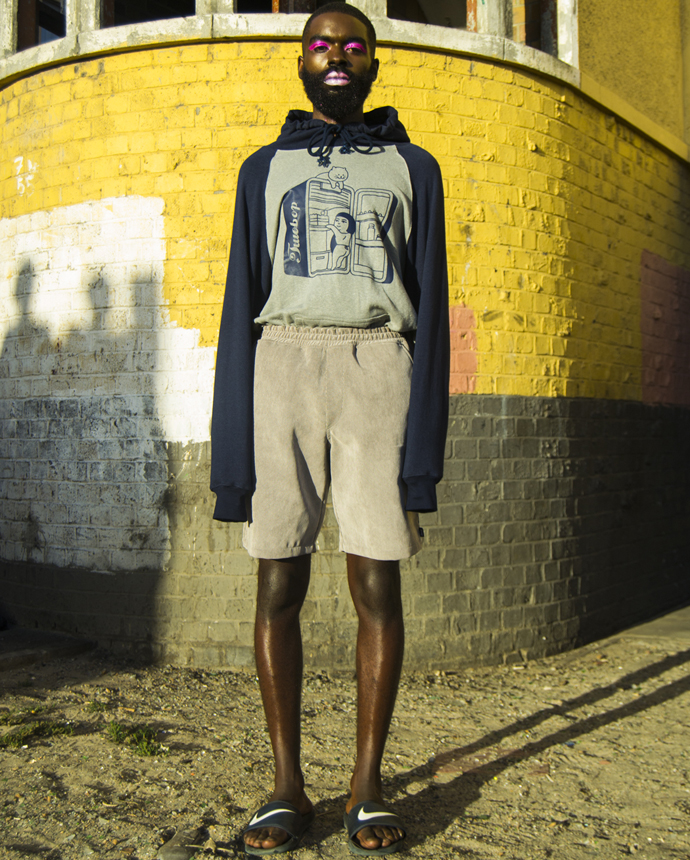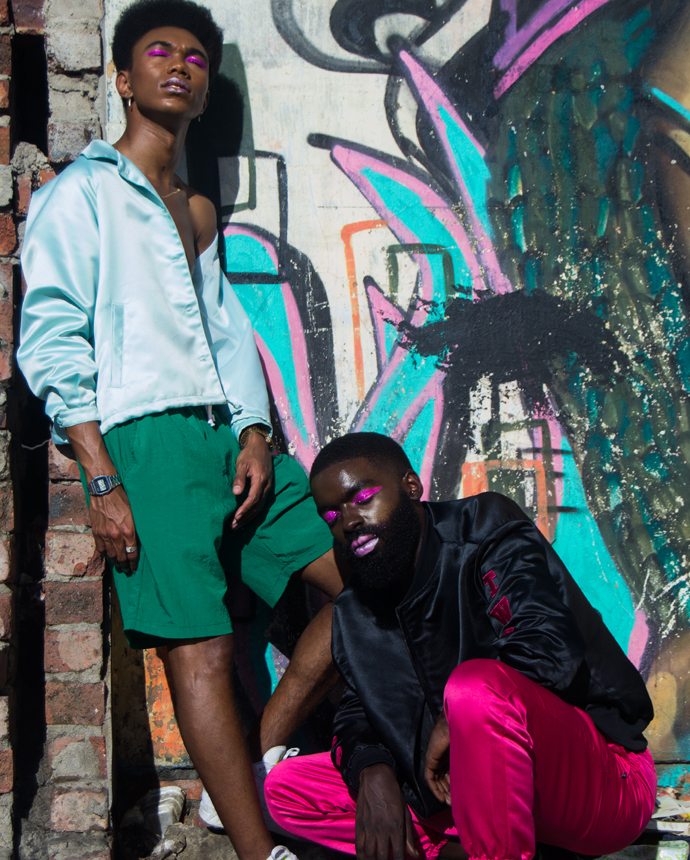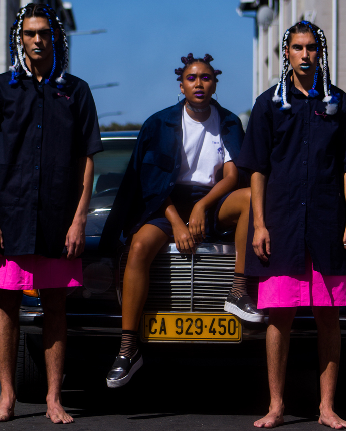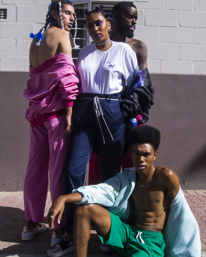 A KALTBLUT exclusive fashion editorial. Photography by Sisanda Mgedezi. Models are Buck Whaley at My Friend Ned, Christian Mpazayabo, Theodore Afrika at Topco, Matthew Prins at Fusion, Chloe Turner. Creative Direction and Styling by Buck Whaley and Christian Mpazayabo. Make-up by Foyin Ogunrombi. Hair Styling by Yonela Makoba. All fashion by Twobop. “The concept of this editorial was influenced by the 90s Hip-Hop Era. We wanted to play with the concept of masculinity and the way it is so evident through Hip-Hop culture, particularly with regard to its representation in the 90s. As creatives, Christian and I are interested in the intersection between gender and fashion. It is for that reason that this project aims to push the binaries of how we understand gender and sexuality, and instead, imagine a world beyond those boundaries. In this work, we aimed to challenge the entrenched masculinity of the 90s Hip-Hop Era by juxtaposing stereotypical masculine poses, with soft, subtle, more feminine stances. This was propagated by the use of high-contrast make-up that aimed to compliment the garments, as well as to highlight the comparison to femininity in the shots. The styling of the editorial draws inspiration from carefree Hip-Hop artists, including Young Thug, Cee-Lo Green and Outkast. While, the hair styling drew inspiration from powerful black female artists like Rihanna, Lil Kim and Erykah Badu.” says Buck Whaley.