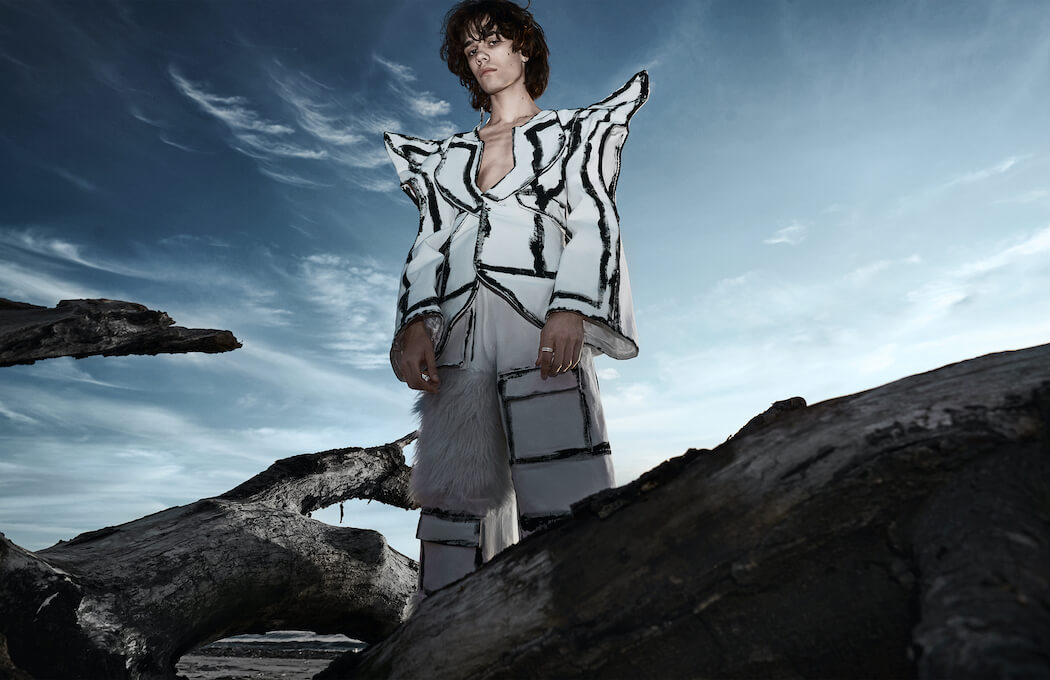 A KALTBLUT exclusive. Photography by Jiajun Wu. Model is Noah Silva. Styling by Feihong Yi. Makeup by Yinzi Xie. Art Director is Zhongyi Wang. Fashion by Chadeese Perriel and Chengzhi Xu.
