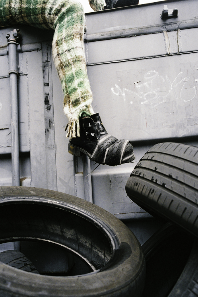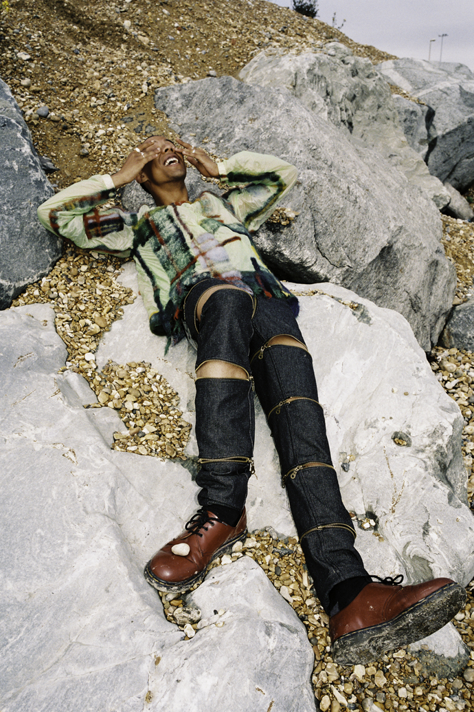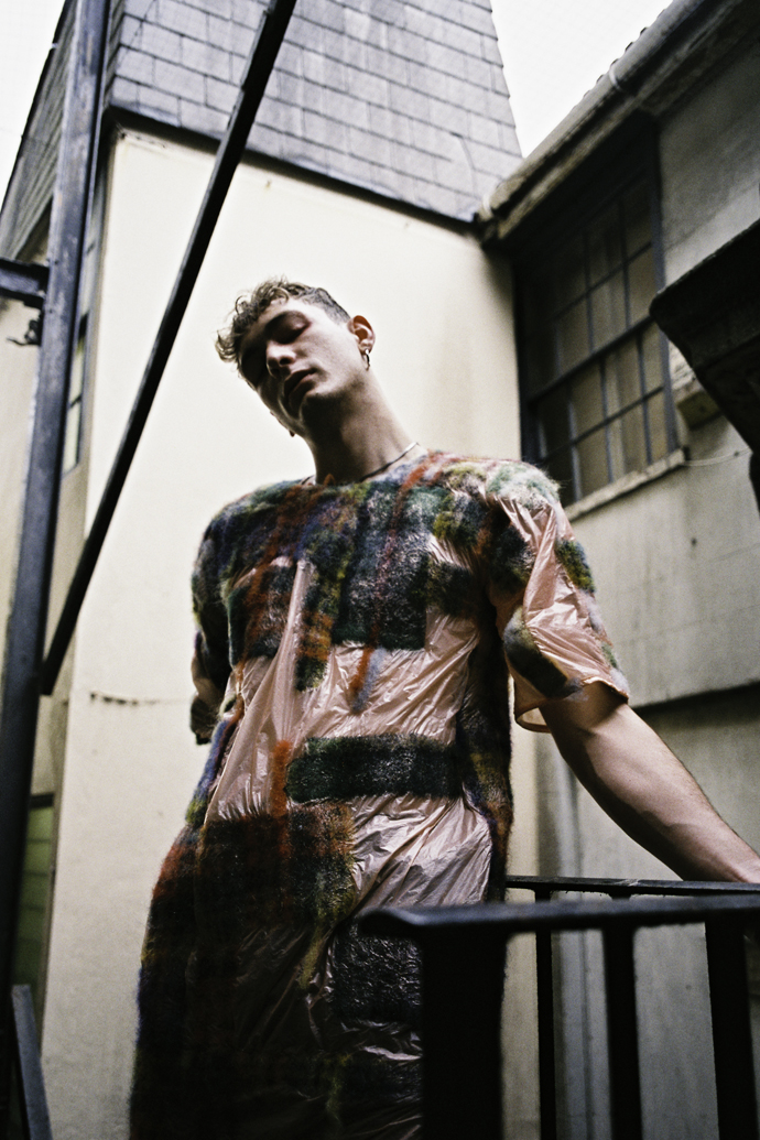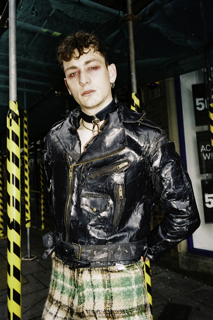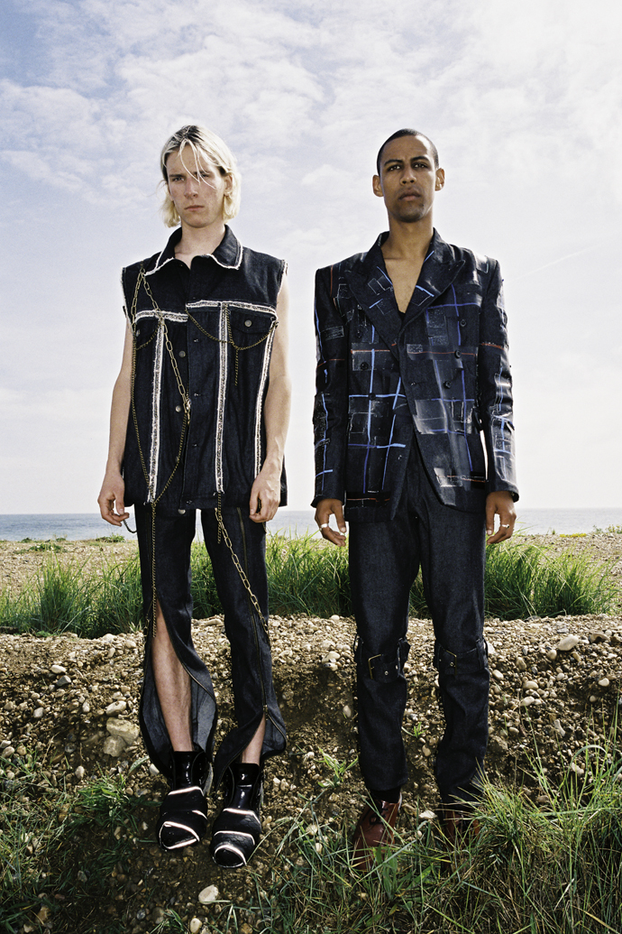 A KALTBLUT exclusive menswear editorial. A collection drawn from the early 1980’s industrial South Wales Punk Scene. Combining unconventional materials with a DIY ethos. Plastic bags and electrical tape fused with mohair are teamed with classic denim workwear pieces juxtaposed with zipped and strapped bondage detailing. Photography by Hanko. Models are Conrad Anthony signed at AMCK Models London, Marius Bergmann and Daniel Downey. Make up by Charlotte Ann. Styled by Rhianedd Dancey.