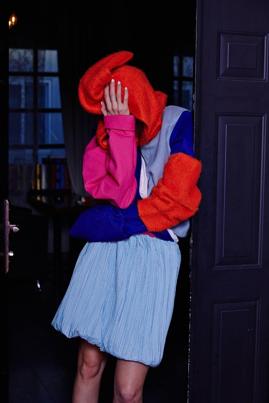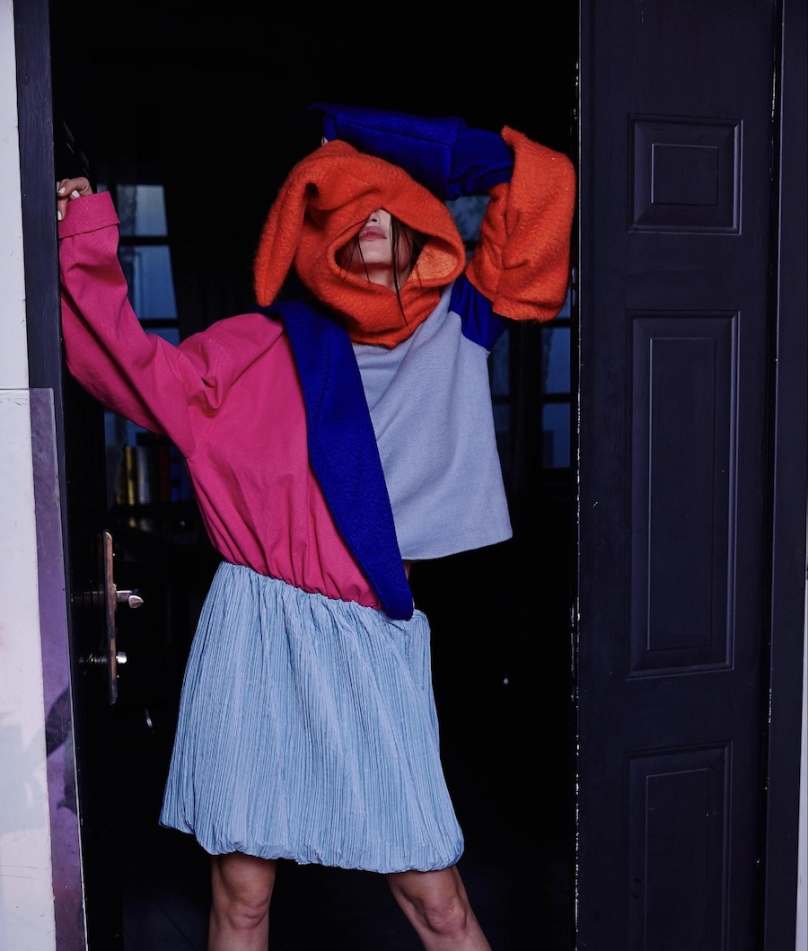 While Just on Time engages the speed of life, Soft Armour turns to density — the quieter, more constant pressure of the city. The demand to shrink, to fold into limited space, and to create distance. Hou pushes back with volume. Exaggerated padding expands the body outward, softly pressing against its surroundings and refusing to yield to them, while oversized hoods obscure the face, creating a self-contained, inward sanctuary.