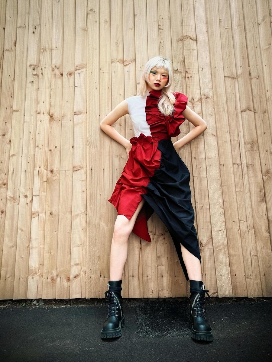 Take the familiar panic of running late. It is as physical as it is mental. Heat rises, coordination slips, and clothing falls slightly out of place as you rush to catch a train. In Just on Time, Hou leans into this fraction of a second. Crimson cuts through black and white; proportions skew, pull, and refuse to settle. What might read as dishevelled elsewhere becomes intentional here, achieved through avant-garde construction and innovative finishing techniques. The imbalance, even the “ mistake, ” is held in place without correction.