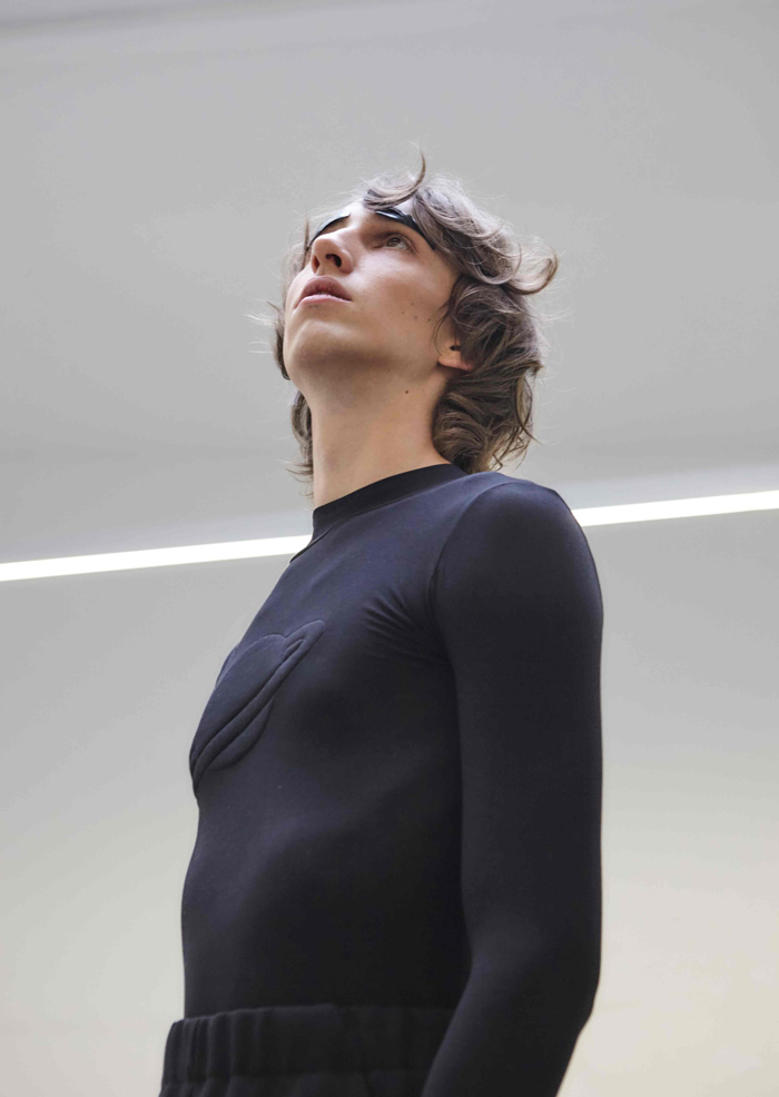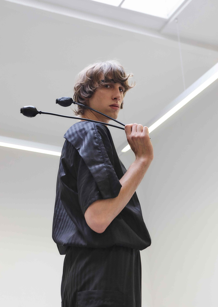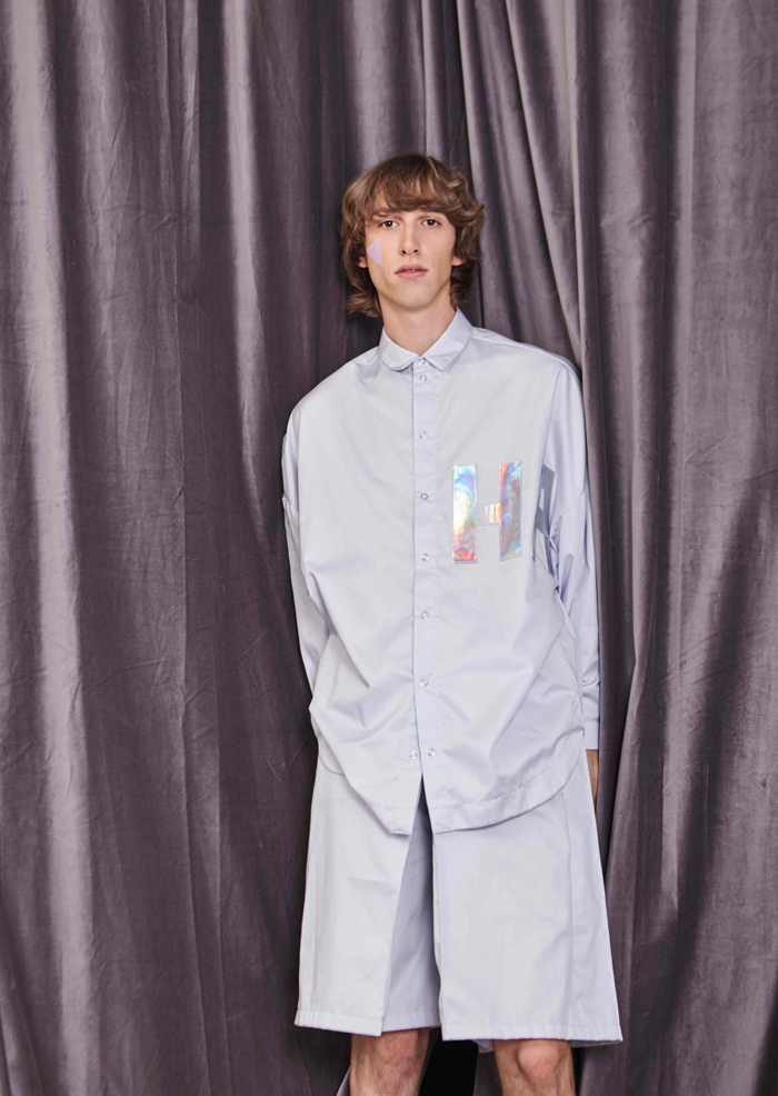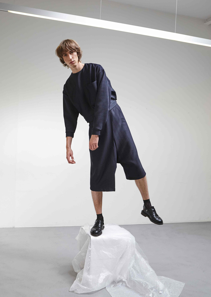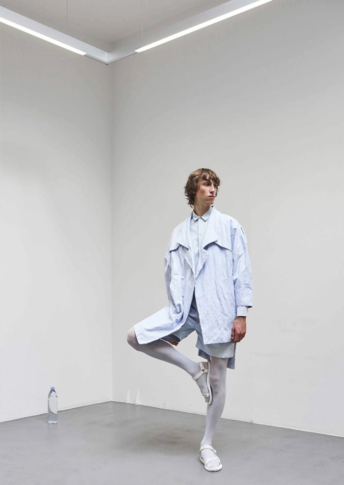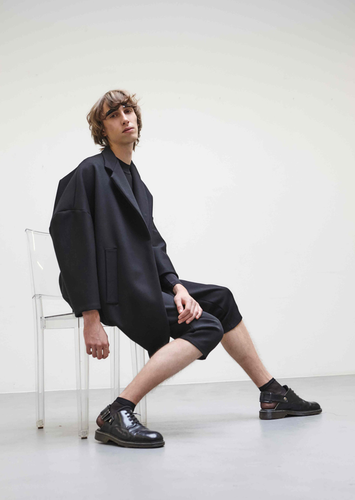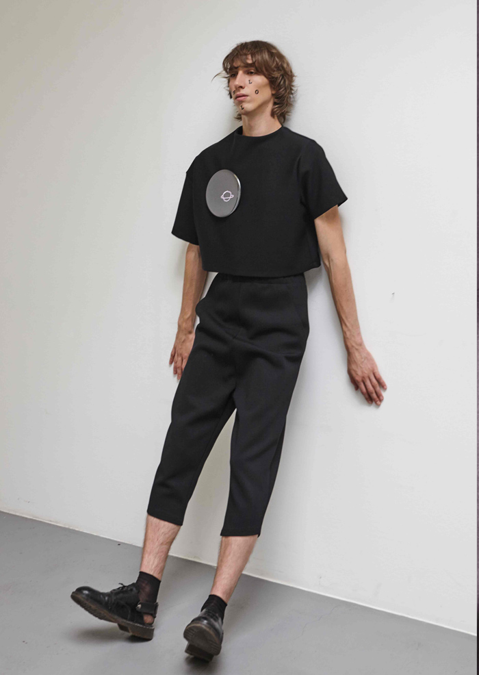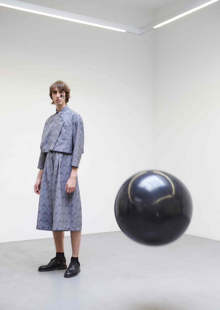 “The conceptual background of Form of interest. is also working in the art / video and music field. The collections are based on high philosophical books like those from Byung Chul Han or Jean Baudrillard. The clothes are for men and women. It is the search for a sort of Anti Form. The gender question and why we still think of aesthetic role models is what Form of interest. is about. It is a way of trying and researching for clothes which fits men and women as well without using the normal way of dressing the girl in a boyfriend blazer or the man in a skinny jeans. this is quite to simple for the modern society…… The collection I am in another universe is based on the radical constructivism – which means that every human is constructing his or her own world in a quite subjective way – what we think is real is only the what we are communicate is real. So in a deeper meaning the collection titel describes the discrepancy that normally we all are equal as human beings but with establishing a society rule with beliefs how we should be. Fashion as trend maker does have an important impact what we belief is men or women or beautiful… “