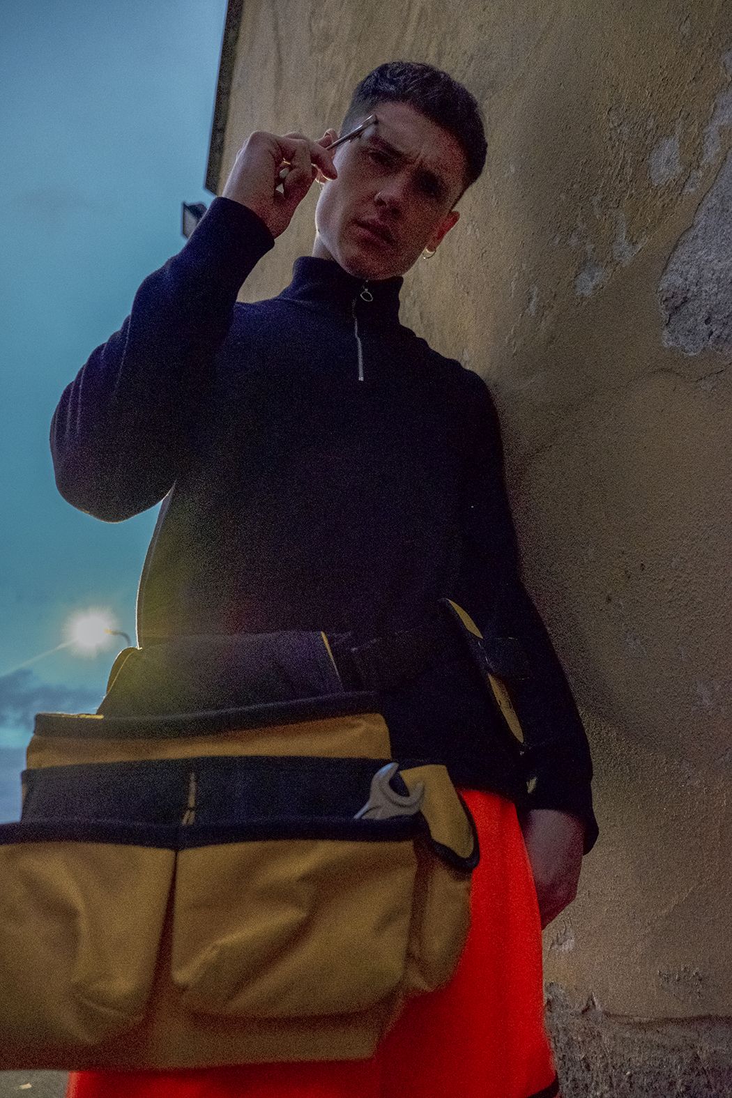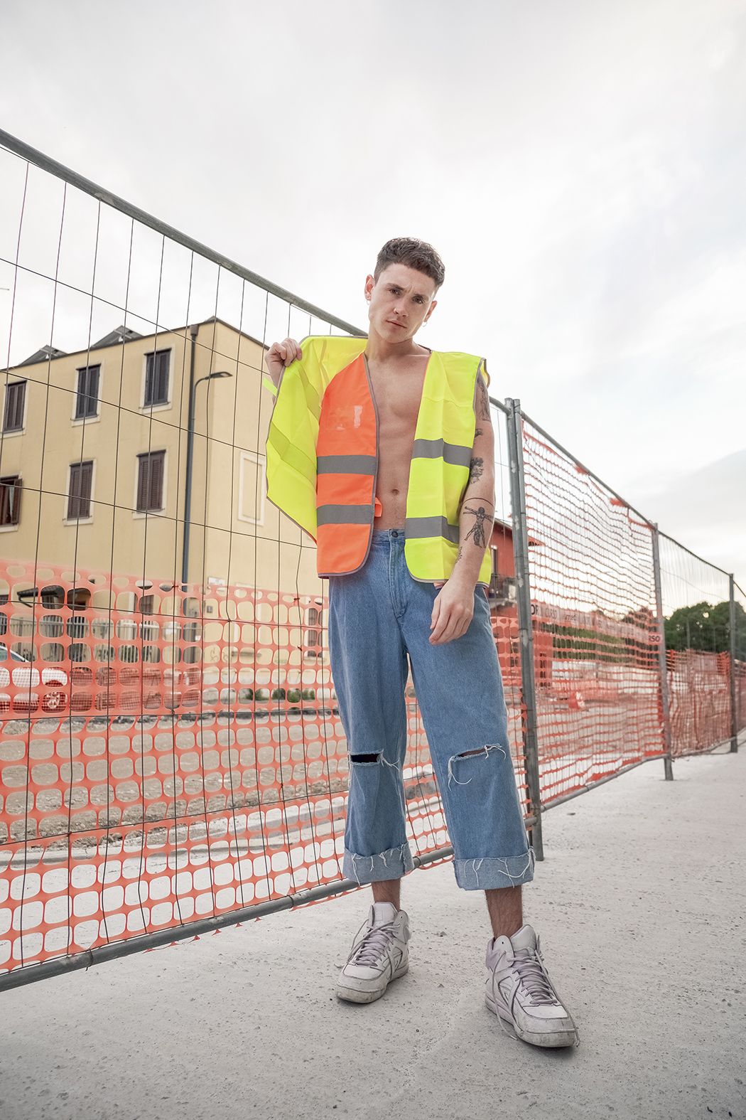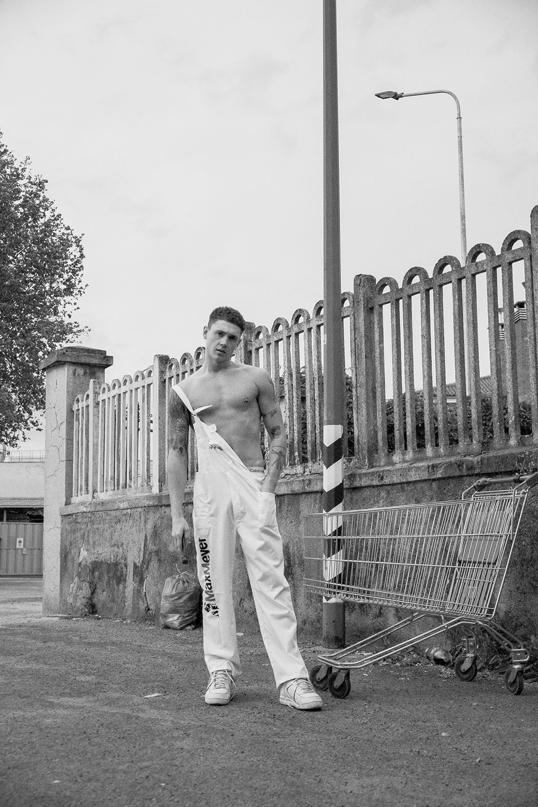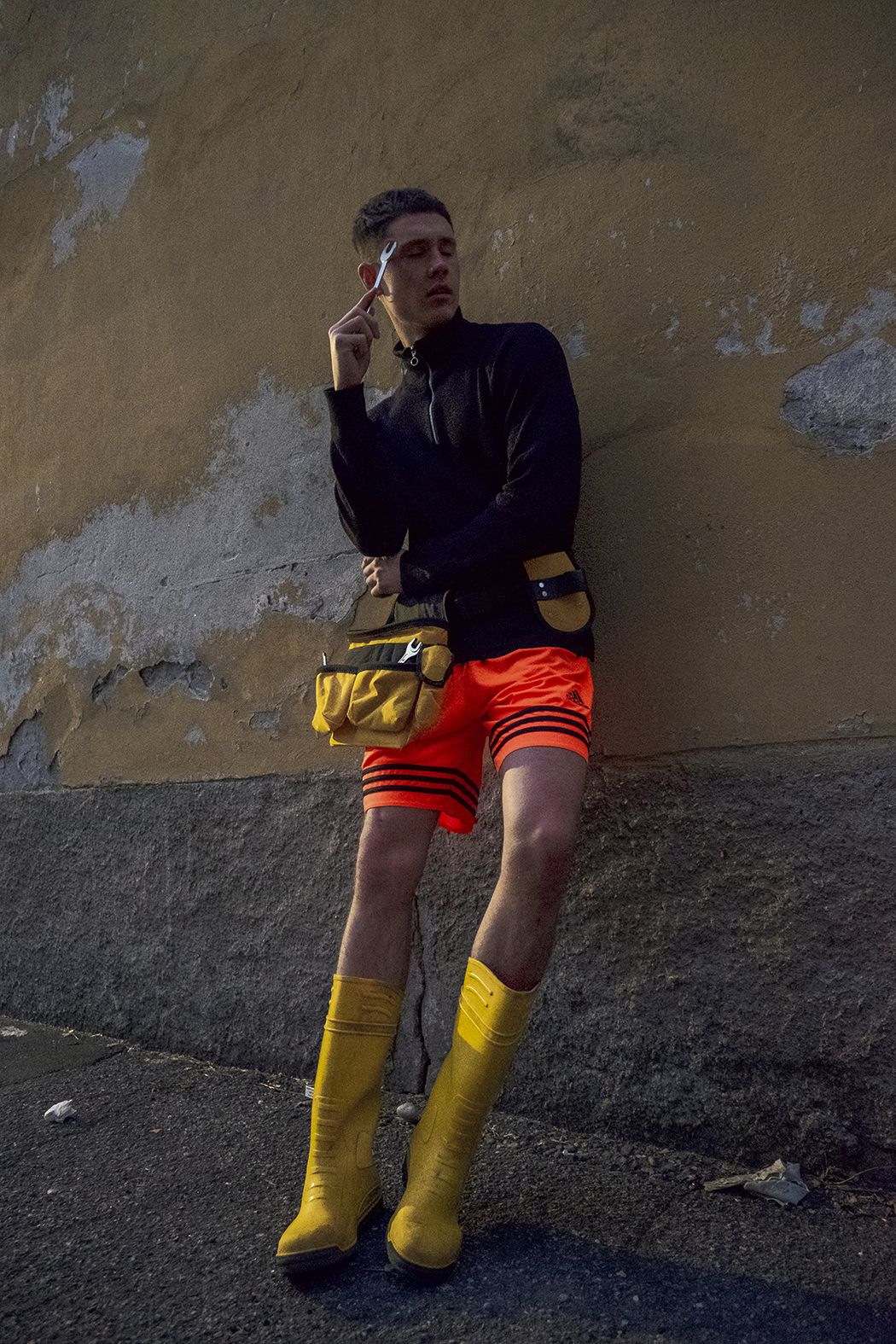 A KALTBLUT exclusive menswear editorial in collaboration with Milan IED: the project is inspired by London street workers. Photography by Myriam Tisbo. Model is Dylan Watson signed at Boommodels. Styling by Sofia Piazza. “I’m born in a small town in Puglia, Italy. I start to take pics at the age of 9 in occasion of a school trip, then i abandon the photography for school. After few years in the high school and some problems with my friends, i uses the photography as a way to escape from the reality and the bad moments that surrounded me. In all this the love for photography grown slowly.. In the occasion of my dad sickness i must face a very difficult time in my life, the darkest. Is in this occasion that I understand to love the photography so much because SHE is the only one that don’t leave me ever alone. In my works i try always to bring up the subject as an “heroine” and its for this that i use often low angles; in this shooting, in particular we wanted to represent a young, free and strong man mixing work clothes with streetwear dresses.” says the photographer.
