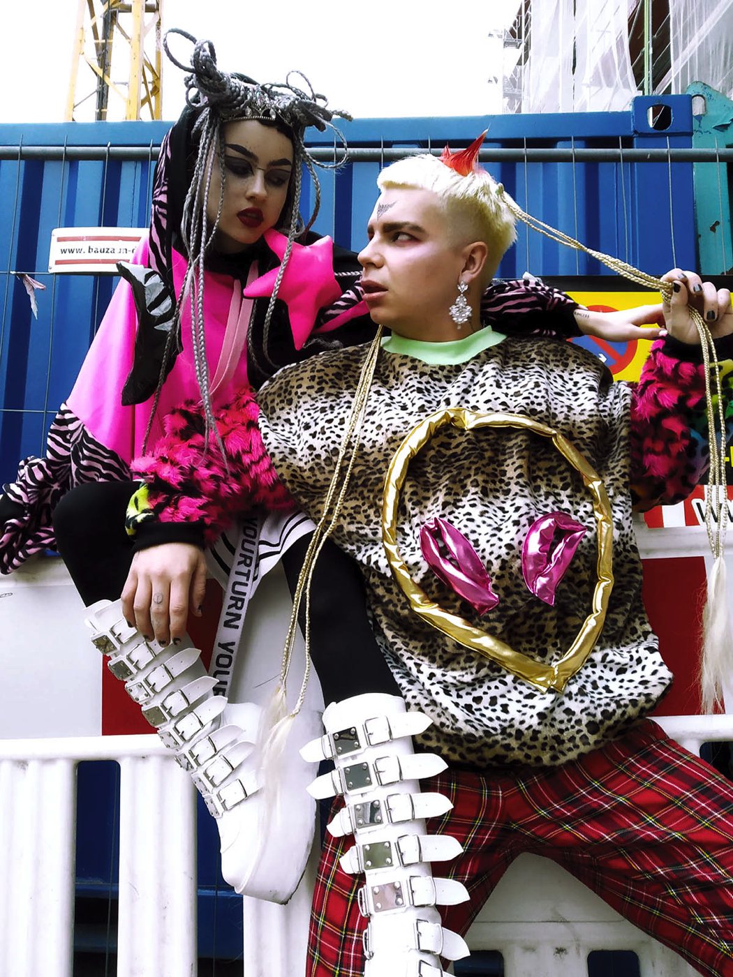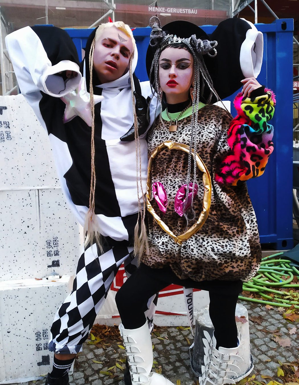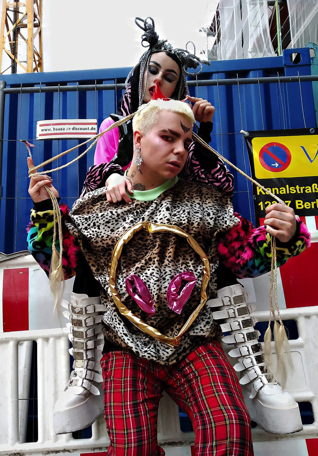 A KALTBLUT exclusive fashion story using LU LA LOOP´s Wild, Trashy, Animal, Alien sweaters! Styling and photography by Lu La Loop. Models are Kat + Justin – in the streets of Berlin.