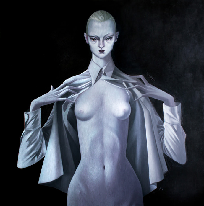 Marja: It took me almost five years to fulfil the idea of this exhibition, which is an imaginary room of allegories, of visions of beauty; a circle of life-sized oil paintings, united through one sensation. I wanted to turn the female figure into the symbol- so I removed the background totally, leaving her and her feeling alone in the emptiness.