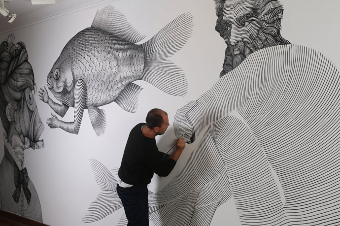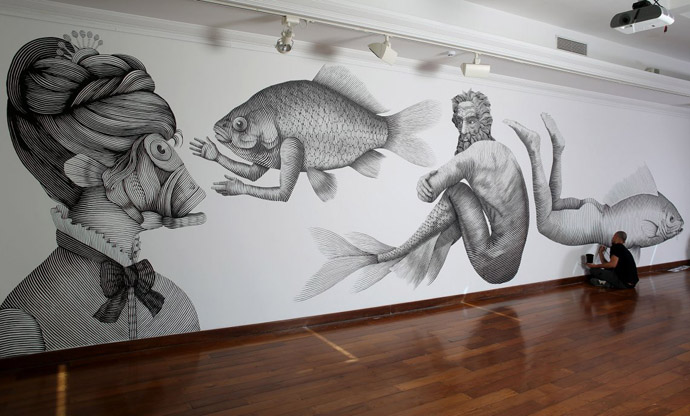On the walls of cities around the world, this urban artist represents immensity, adventure, freedom and discovery as an initiatory journey. The subtle traits of his black and white characters are his freedom to capture the sea monsters. Alfalfa tells the fascinating stories of mermaids, tritons and triterpes; half human – half fish. In his new work presented at the Museo Zorrillla in Montevideo, he exhibited ” Arbol genealógico de sirénidos posibles e imposibles”. As a historian or a genealogist, he introduces us to the family of mythical beings. Far from provoking a repulsion, these fantastic bodies are harmoniously intertwined with the image of the gods that reigned over their domains. This young artist touches the viewer allowing him to bathe in a mysterious and divinatory universe. This giant work comes to life before our eyes. This very rich universe devours the walls of the museum, but also those of the city, its main area. Alfalfa’s work intrigues. These beings, come from another time, in all power, are fragile. Time will erase them, but it will continue to be, for the inhabitants, this “foreignization of public space”, according to Denis Delbaere.