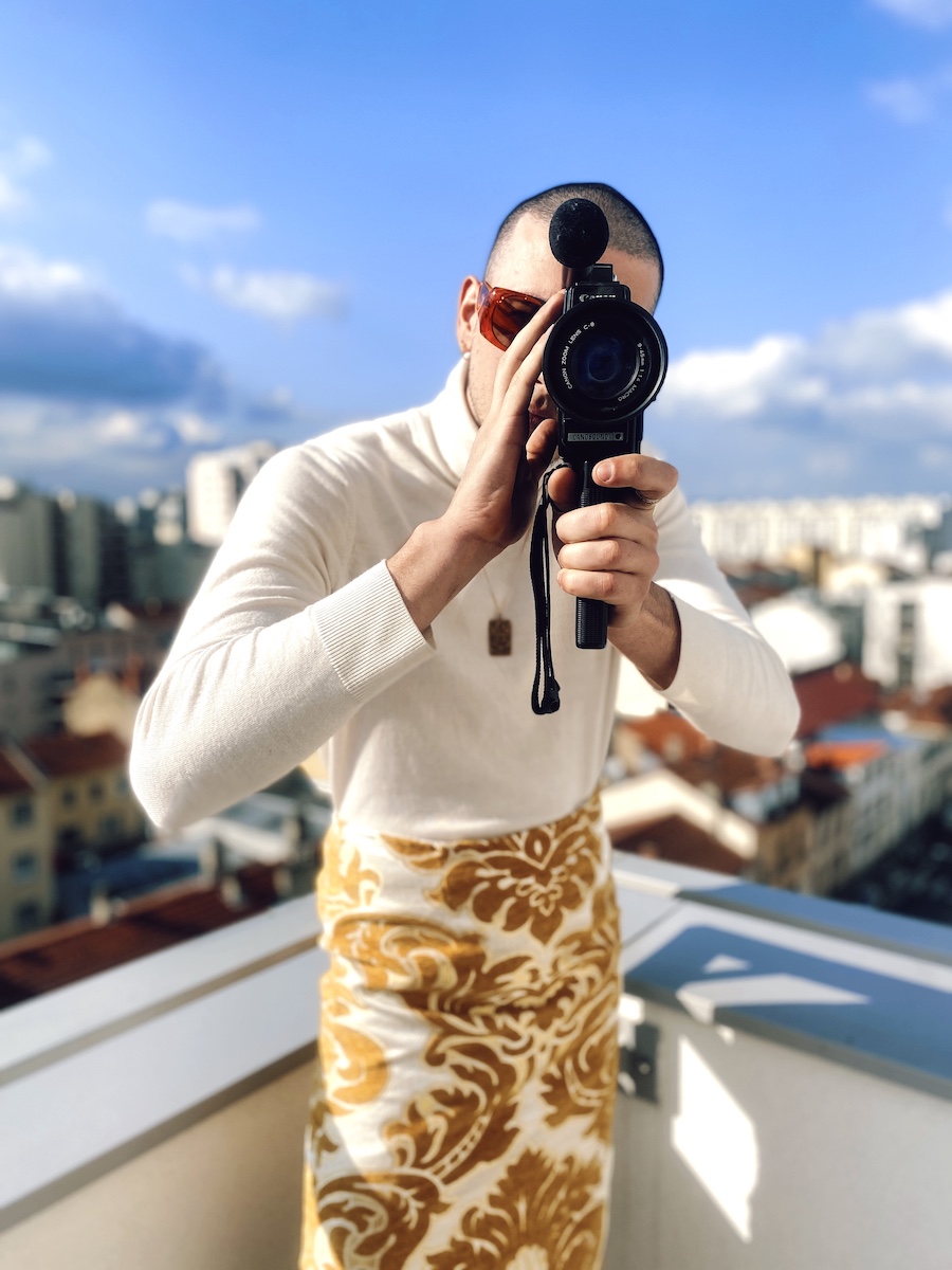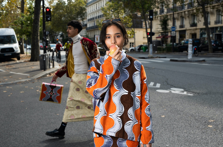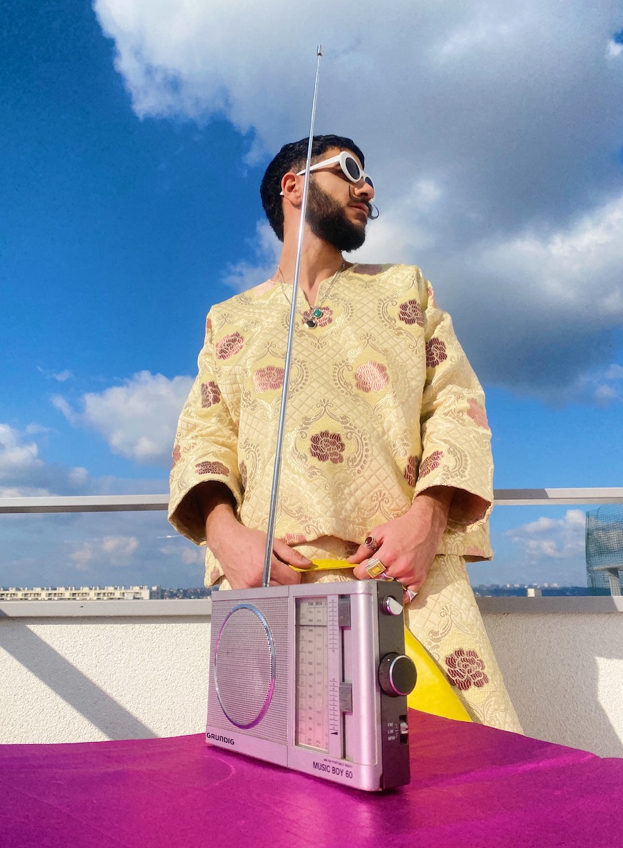 Kacimi’s sustainable designs with contemporary shapes focus on colour and quality and are inspired by Morocco’s inexhaustible joie de vivre and visual heritage. Every piece tells its own story, blending together Kacimi’s Moroccan identity with a contemporary twist, combining culture and her eccentric style. Named after her grandmother, the oversized Kenza jacket is Kacimi’s first creation for the brand. Available in limited editions of 2 or 3 pieces, in various sizes and colours, each jacket is handsewn by artisans in Rabat with Brocard upholstery fabrics, a compact textile composed of cotton and chenille blend. Other statement pieces include the Chiki skirt and the Jamâal top with androgynous and boldly sculptural forms. The Gnawa bags are hand-embroidered with quirky beads and shells by Gnawa musician Mâalem Ahmed Dkaki in Fez.