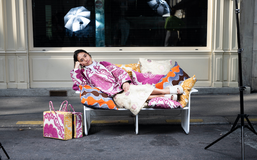 The rich jacquard upholstery fabrics with bold colour palettes, called Tlamt in Morocco and used traditionally to decorate and embellish houses, are the starting point for Zoubida’s creative process. Pushing the boundaries of creativity, Kacimi reinterprets these bold, textured and vibrant patterns of traditional Moroccan upholstery in unexpected ways to create her clothing line.